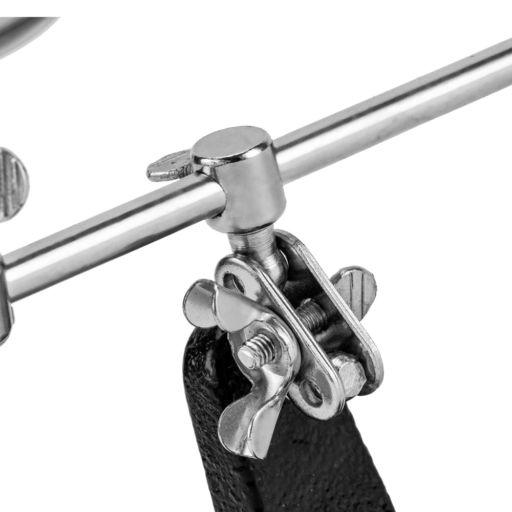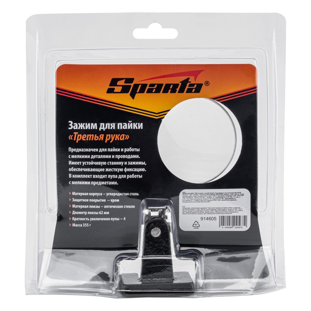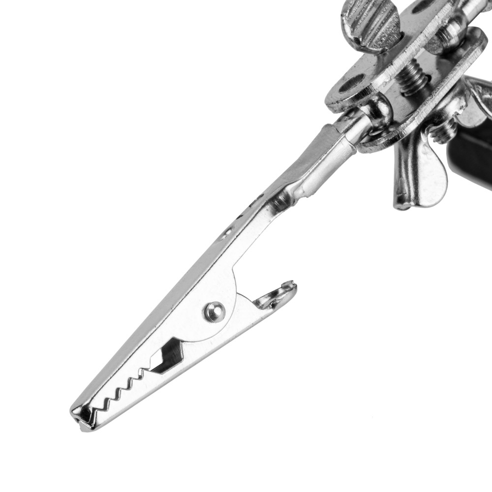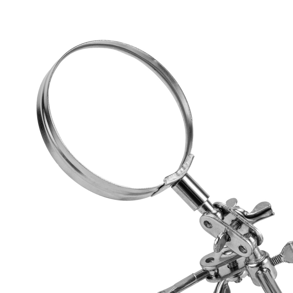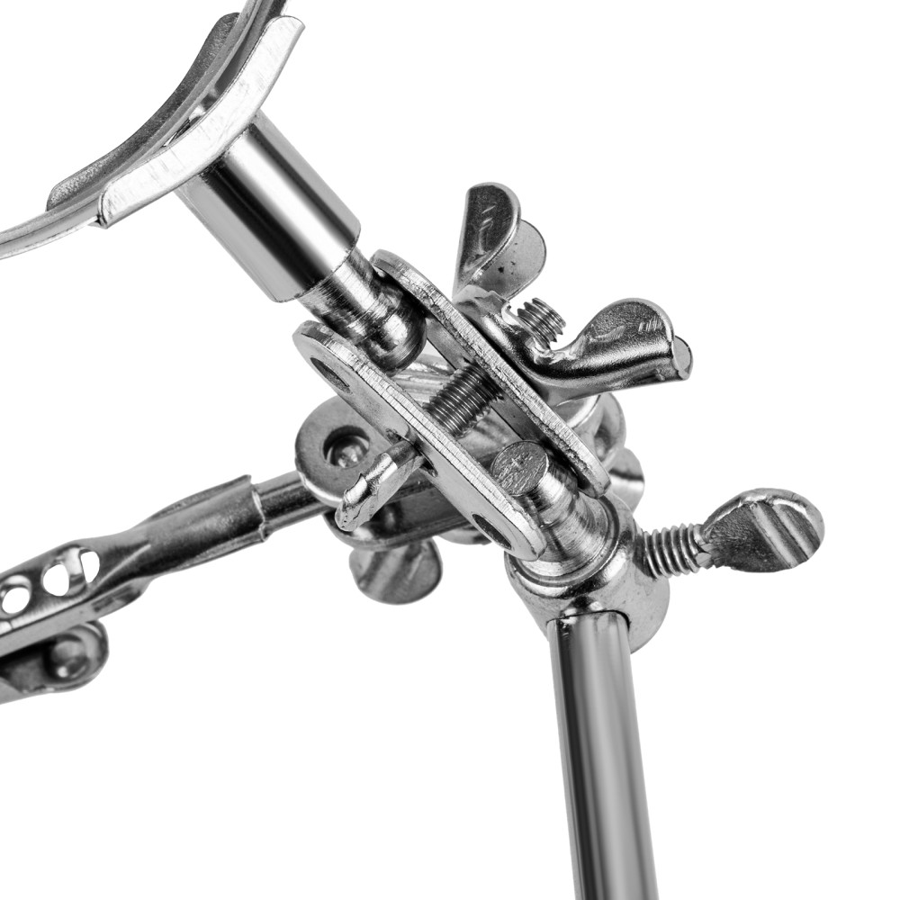 Зажим для пайки Sparta «Третья рука» 914605 предназначен для надежной фиксации плат, проводов и мелких деталей при пайке. Лупа с 4-кратным увеличением позволяет проводить микропайку с высокой точностью. Зажим будет полезен электрикам, мастерам по ремонту техники, а также пригодится в бытовой сфере.ПреимуществаУдобная эксплуатация — устойчивая станина исключает опрокидывание, крепкие «крокодилы» надежно удерживают детали.Фиксация предметов под различными углами — благодаря шарнирным креплениям зажимы и лупу можно установить в любом удобном положении.Функциональность — лупу можно передвигать по штанге.Прочность и долговечность — зажим изготовлен из стали с хромированным покрытием.