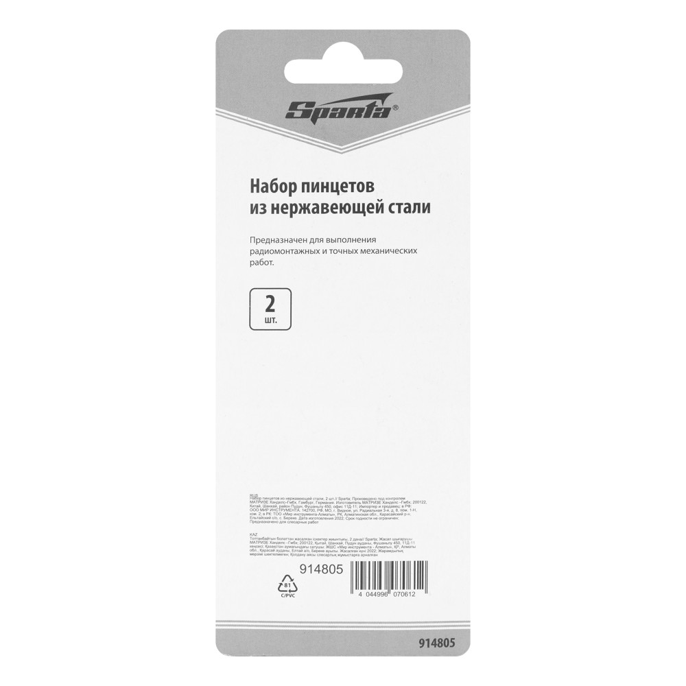 Набор Sparta 914805 включает в себя 2 пинцета для удержания мелких деталей. Инструменты прямой и изогнутой формы пригодятся мастерам, работающим с элементами, которые нельзя или неудобно захватывать руками. Набор оптимален для хенд-мейда, ремонта бытовой техники, часов и т.д.ПреимуществаПинцеты из стали 65 MN обладают прочностью, оптимальной для непрофессионального применения.Губки пинцетов плотно прилегают друг к другу, что позволяет удерживать даже самые мелкие детали.Насечки на корпусе каждого инструмента предотвращают их проскальзывание в руках.