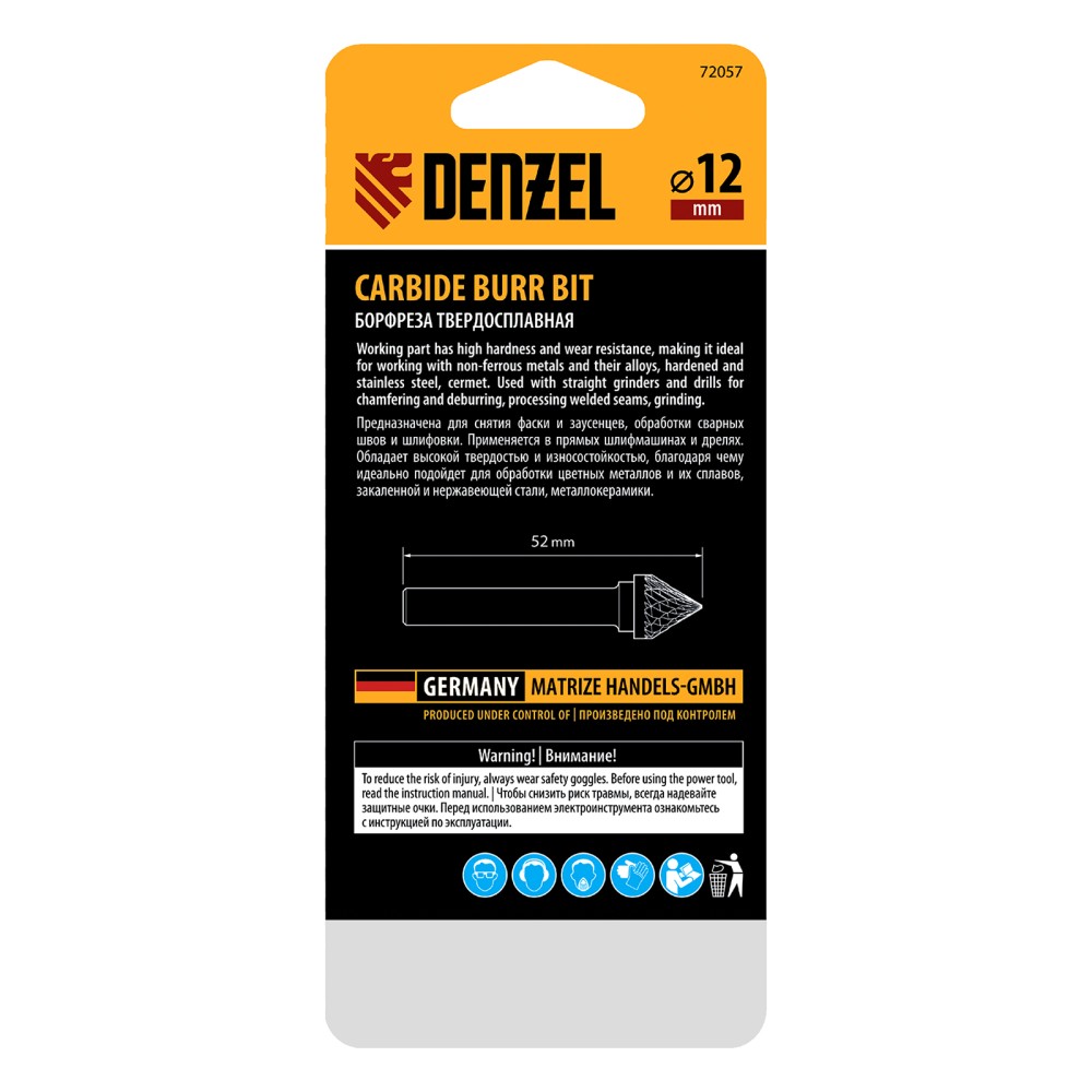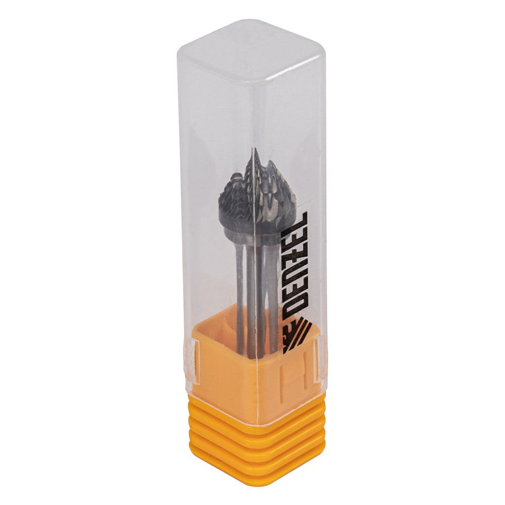 Твердосплавная борфреза по металлу Denzel 72057 с рабочей частью-зенкером с вершиной 60° (тип J), диаметром 12 мм, устанавливается на дрель или прямошлифовальную машину. Используется для обработки закаленной и нержавеющей стали, латуни, бронзы, меди, чугуна, титана, а также металлокерамики и искусственного камня. Оптимальна для снятия фасок и заусенцев, обработки кромок, угловых пазов, краев отверстий.ПреимуществаЭффективная работа с особо прочными материалами — рабочая часть изготовлена из сплава ВК8 твердостью 69-72 HRC.Высокая производительность — специальные перекрестные насечки-стружколомы обеспечивают эффективное удаление продуктов обработки.Универсальность — цилиндрический хвостовик диаметром 6 мм совместим с большинством патронов инструментов.Удобное хранение и транспортировка — борфреза поставляется в практичном пластиковом кейсе.