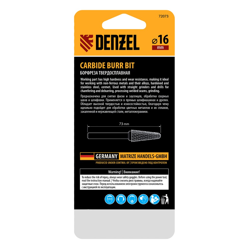Твердосплавная борфреза Denzel 72073 с конической закругленной режущей частью (тип L), диаметром 16 мм, предназначена для выполнения работ по металлу. Используется для шлифовки, снятия фасок, удаления заусенцев, зачистки сварных швов. восстановления гравировки. Оптимальна для обработки труднодоступных мест. Оснастка устанавливается на дрель или прямошлифовальную машину, подходит для работы с закаленной и нержавеющей сталью, чугуном, бронзой, медью, латунью, титаном, а также металлокерамикой и искусственным камнем.ПреимуществаЭффективная работа с особо прочными материалами — рабочая часть изготовлена из сплава ВК8 твердостью 69-72 HRC.Высокая производительность — специальные перекрестные насечки-стружколомы обеспечивают эффективное удаление продуктов обработки.Универсальность — цилиндрический хвостовик диаметром 6 мм совместим с большинством патронов инструментов.Удобное хранение и транспортировка — борфреза поставляется в практичном пластиковом кейсе.