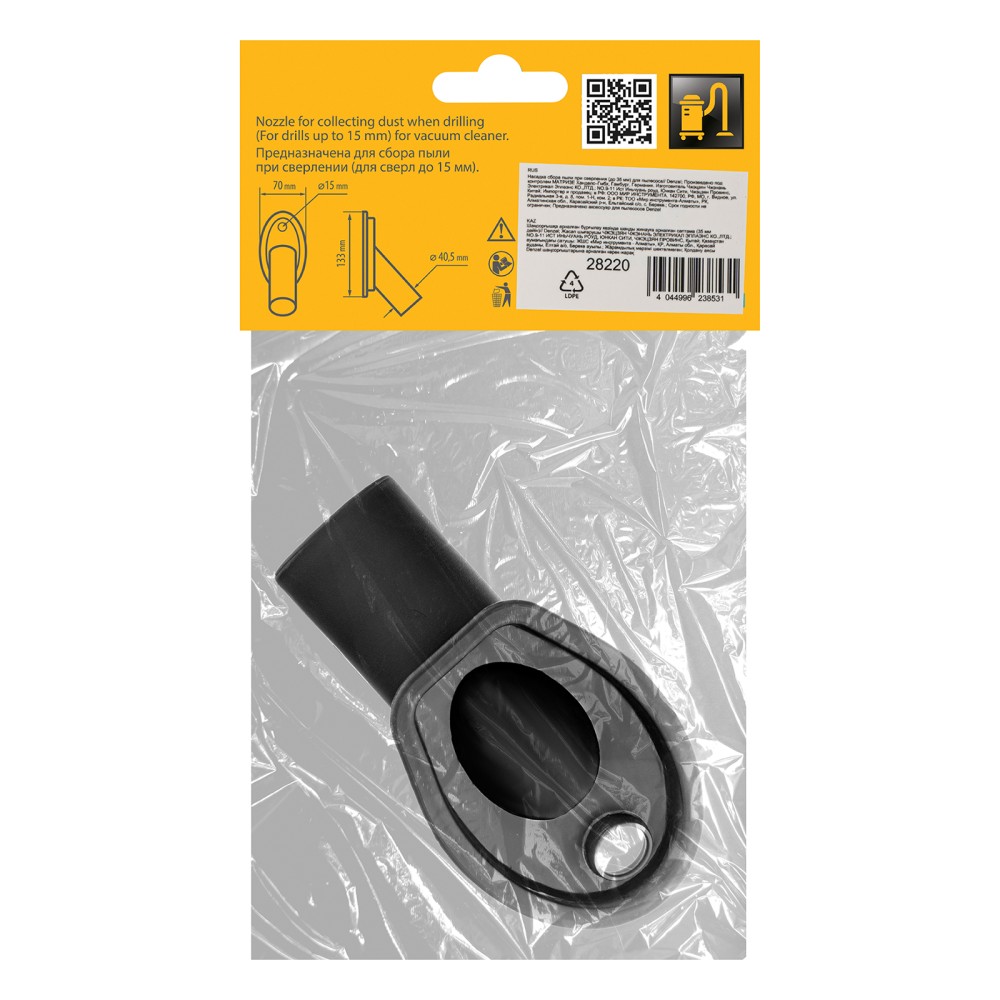 Насадка для пылесоса Denzel 28220 предназначена для моментального сбора пыли, образующейся при сверлении поверхностей. Подходит для использования со сверлами диаметром до 15 мм. Пригодится во время проведения строительных и ремонтных работ. Насадка совместима с пылесосами Denzel 28201, 28202, 28203, 28291, 28292, 28293.ПреимуществаЭффективность — использование насадки позволяет обеспечить чистоту рабочей зоны.Несложная эксплуатация — достаточно присоединить насадку к шлангу, после включения пылесоса установить ее на область сверления.Удобное размещение на стенде — изделие поставляется в упаковке с подвесом.