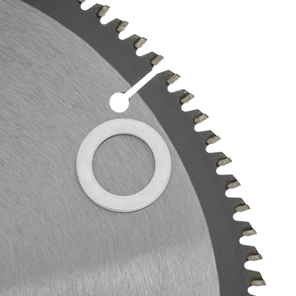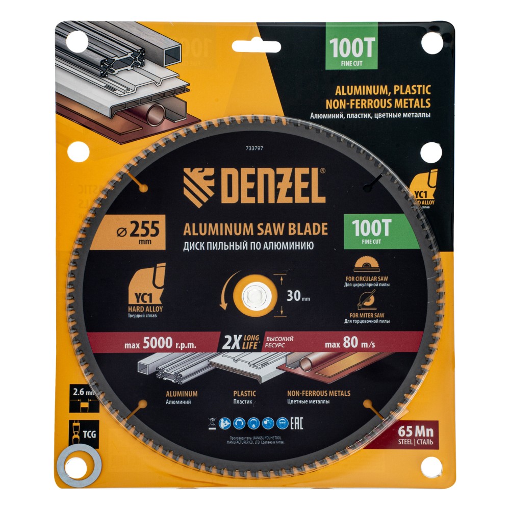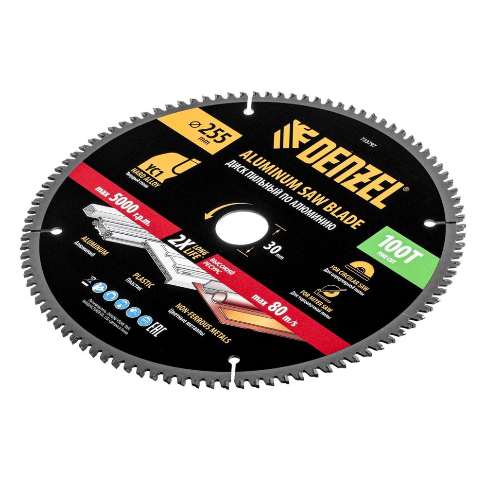 Пильный диск Denzel 733797 диаметром 255 x 30 мм, с 100 зубьями, предназначен для точного распиливания заготовок из алюминия, пластика, цветных металлов. Устанавливается на циркулярную или торцовочную пилу, также возможно использование с распиловочным станком. Зубья трапециевидно-плоского типа (TCG) с отрицательным углом заточки обеспечивают ровный рез без сколов. В комплект поставки входит переходное кольцо 30/20 мм, позволяющее изменить посадочный диаметр при необходимости.ПреимуществаНадежность — термически обработанная основа из пружинной стали 65Mn выдерживает высокие динамические нагрузки без риска деформации.Эффективность — режущая часть из твердого сплава YC1, прошедшая многоступенчатую заточку, позволяет успешно справляться с прочными материалами.Высокое качество реза — компенсационные прорези снижают вибрации, рабочая часть с мелкими зубьями обеспечивает получение чистой кромки без заусенцев.Прочность — твердосплавные пластины надежно зафиксированы при помощи термостойкого припоя с повышенным содержанием серебра.Коррозионная стойкость — покрытый защитным лаком корпус и никелированное переходное кольцо устойчивы к разрушению.