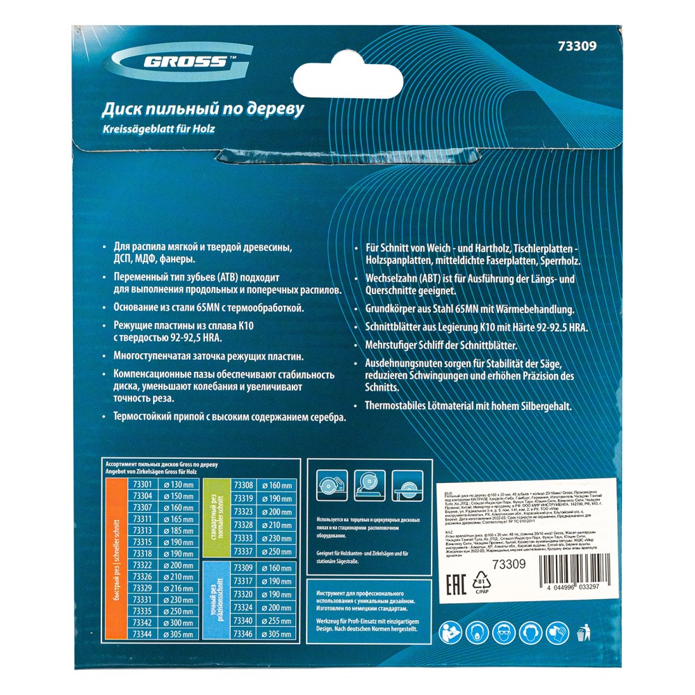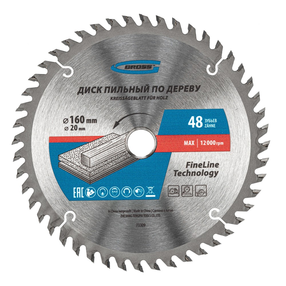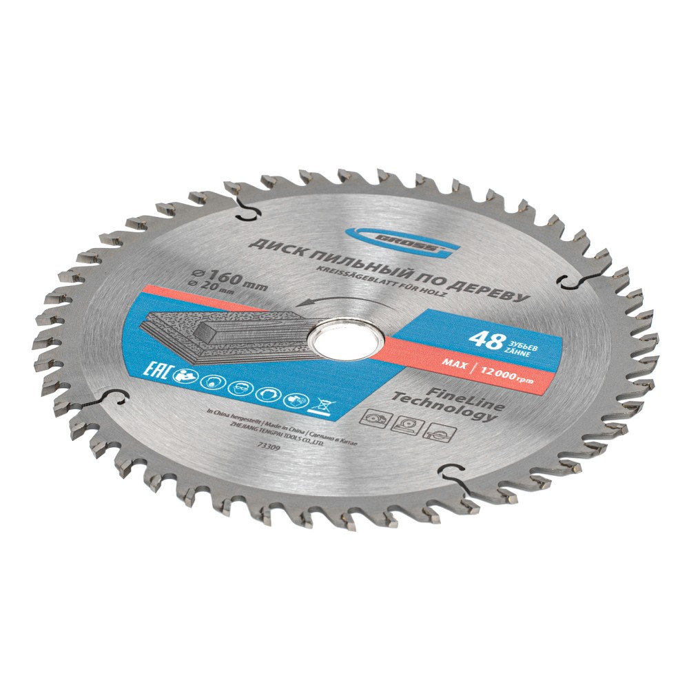 Пильный диск Gross 73309, ф160 х 20 мм, с 48 зубьями и переходным кольцом 20/16 мм, предназначен для распила древесины мягких и твердых пород, ДСП, МДФ и фанеры. Является оснасткой для циркулярных и торцовочных пил с посадочным диаметром 20 мм, благодаря универсальному типу зубьев АТВ подходит как для продольного, так и для поперечного реза материалов. Диск изготовлен на высококачественном оборудовании, специально рассчитан на профессиональное применение и выполнение большого объема работ.ПреимуществаВысокое качество работ — 48 мелких зубьев и режущие кромки, прошедшие многоступенчатую автоматическую заточку, обеспечивают точный и чистый рез материалов.Прочность — корпус изготовлен из инструментальной стали 65Mn и термообработан, поэтому обладает устойчивостью к динамическим нагрузкам.Максимальный рабочий ресурс — режущие пластины выполнены из сплава К10 со специальными добавками Ceratizit твердостью 91 HRА, что гарантирует их износостойкость.Надежность — в припое содержится значительное количество серебра, он прочно фиксирует твердосплавные пластины к корпусу диска.Продуманная конструкция — компенсационные пазы, выполненные при помощи лазера, способствуют существенному уменьшению деформации диска и получению ровного среза.Кольцо-переходник в комплекте — при необходимости можно самостоятельно изменить посадочный диаметр и установить диск на электроинструмент с посадкой 16 мм.