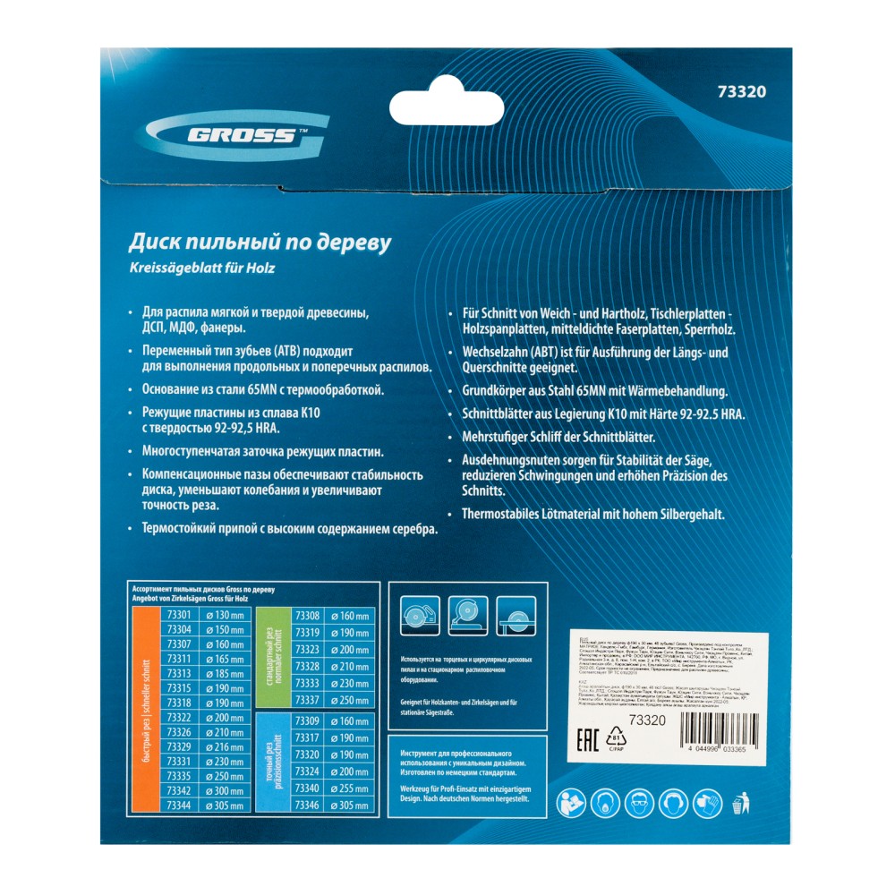 Пильный диск Gross 73320, ф190 х 30 мм, с 48 зубьями, предназначен для распила древесины мягких и твердых пород, ДСП, МДФ и фанеры. Является оснасткой для циркулярных и торцовочных пил с посадочным диаметром 20 мм, благодаря универсальному типу зубьев АТВ подходит как для продольного, так и для поперечного реза материалов. Диск изготовлен на высококачественном оборудовании, специально рассчитан на профессиональное применение и выполнение большого объема работ.ПреимуществаВысокое качество работ — 48 мелких зубьев и режущие кромки, прошедшие многоступенчатую автоматическую заточку, обеспечивают точный и чистый рез материалов.Прочность — корпус изготовлен из инструментальной стали 65Mn и термообработан, поэтому обладает устойчивостью к динамическим нагрузкам.Максимальный рабочий ресурс — режущие пластины выполнены из сплава К10 со специальными добавками Ceratizit твердостью 91 HRА, что гарантирует их износостойкость.Надежность — в припое содержится значительное количество серебра, он прочно фиксирует твердосплавные пластины к корпусу диска.Продуманная конструкция — компенсационные пазы, выполненные при помощи лазера, способствуют существенному уменьшению деформации диска и получению ровного среза.