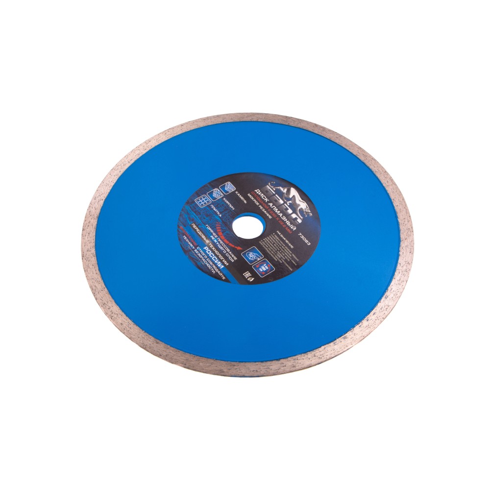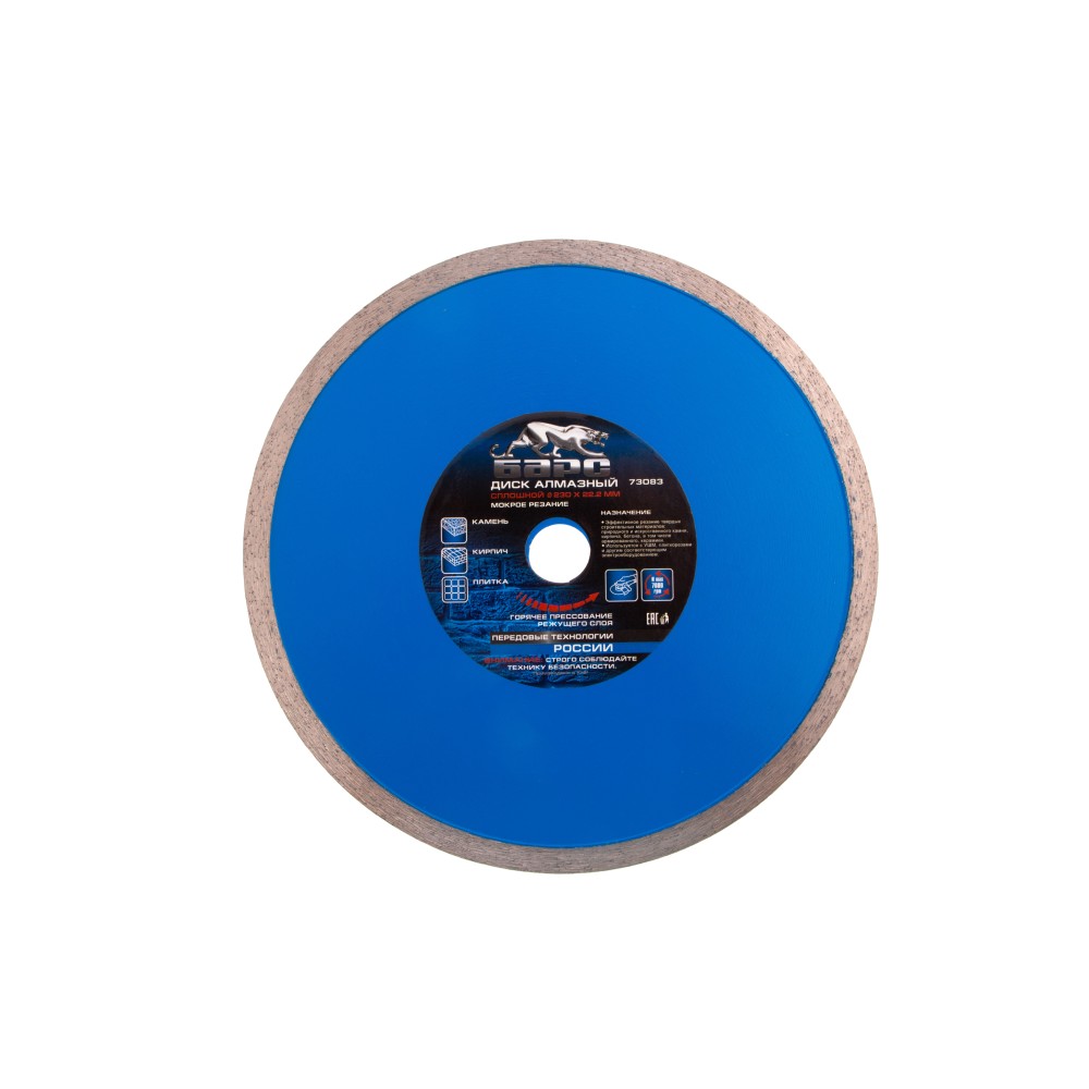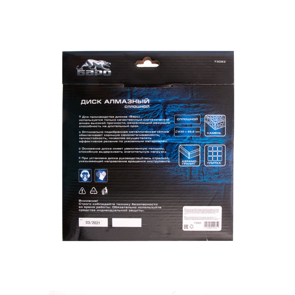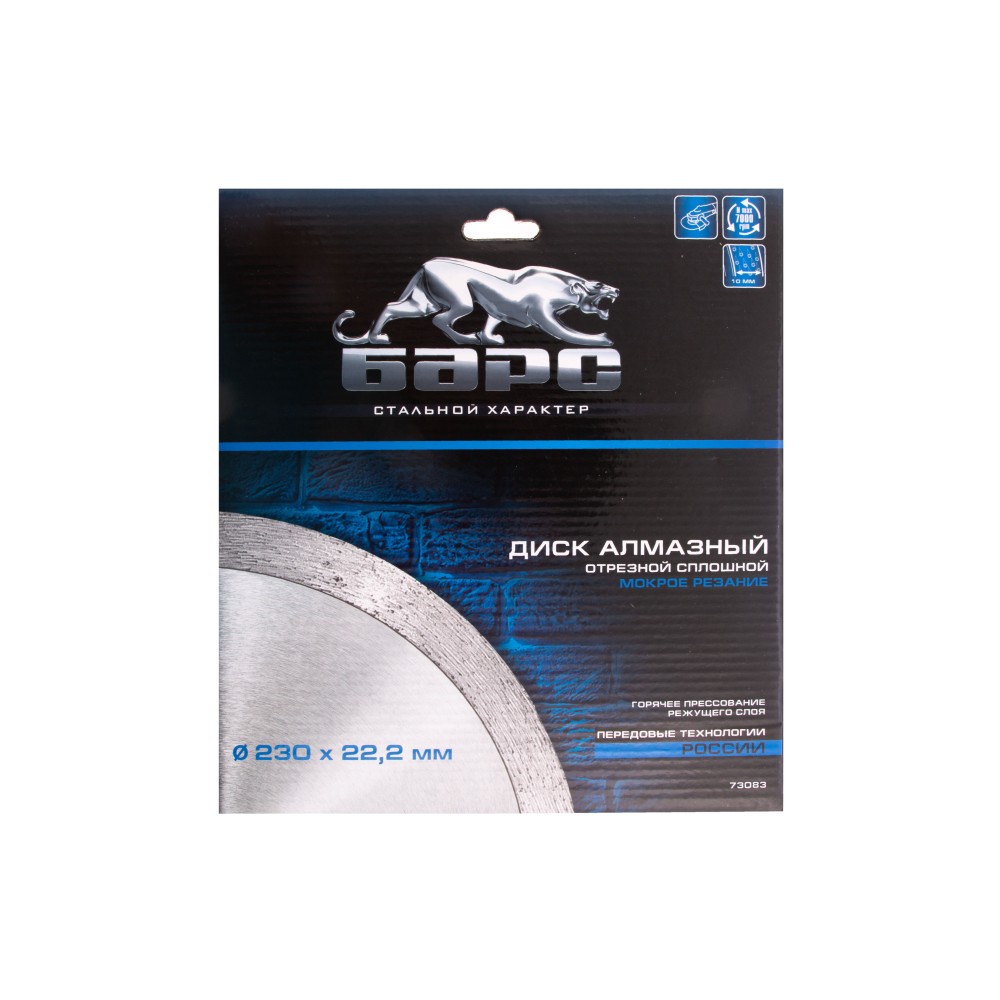 Сплошной алмазный диск Барс 73083 диаметром 230 х 22,2 мм применяется совместно с УШМ или плиткорезом для мокрой резки твердых материалов: гранита и керамогранита, кафеля, плитки, мрамора, натурального и искусственного камня. Диск сплошной формы обеспечивает ровный рез без трещин и сколов. Использование водяного охлаждения позволяет избежать перегрева диска и увеличить его ресурс.ПреимуществаВысокая производительность — диск с режущим слоем шириной 10 мм, содержащим большое количество алмазов, подходит для профессионального использования.Эффективная работа с твердыми материалами — рабочая часть включает в себя только высококачественные синтетические алмазы повышенной прочности.Износостойкость — оптимально сбалансированная металлическая связка надежно удерживает алмазы и обеспечивает своевременное обновление режущего слоя.Надежность — стальной корпус увеличенной толщины и рабочая часть, изготовленная методом горячего прессования, выдерживают высокие нагрузки.
