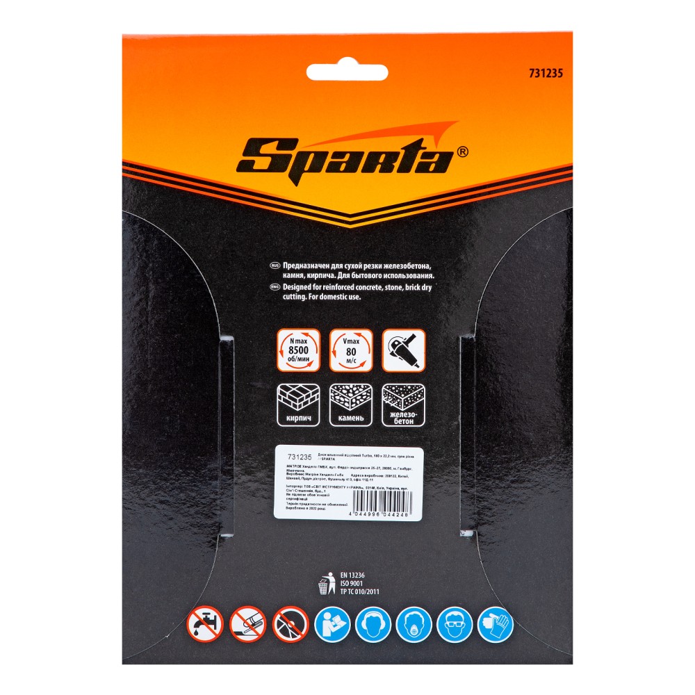 Алмазный отрезной диск Sparta Turbo 731235 для сухой резки, диаметром 180 х 22,2 мм, устанавливается на углошлифовальную машину. Позволяет резать твердые материалы: бетон, железобетон, камень, песчаник. Диск предназначен для бытового использования.ПреимуществаЭффективный отвод тепла и шлама — благодаря турбированной рабочей части диск можно использовать для быстрой сухой резки без водяного охлаждения.Устойчивость к высоким нагрузкам — диск изготовлен методом холодного прессования.Высокое качество реза — ширина алмазного слоя составляет 6 мм.