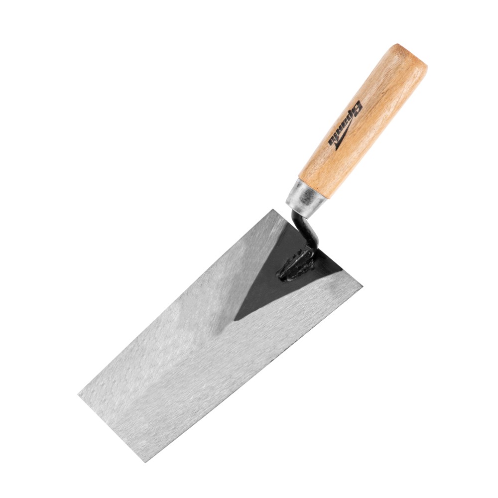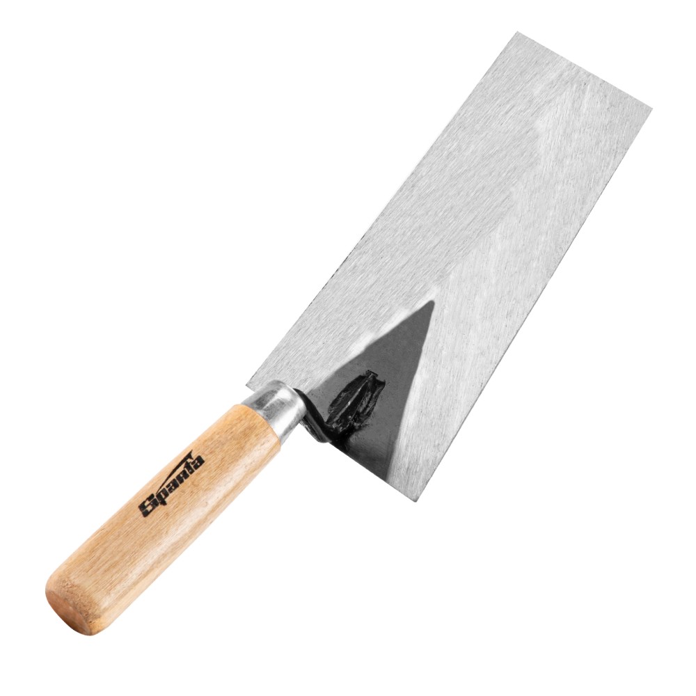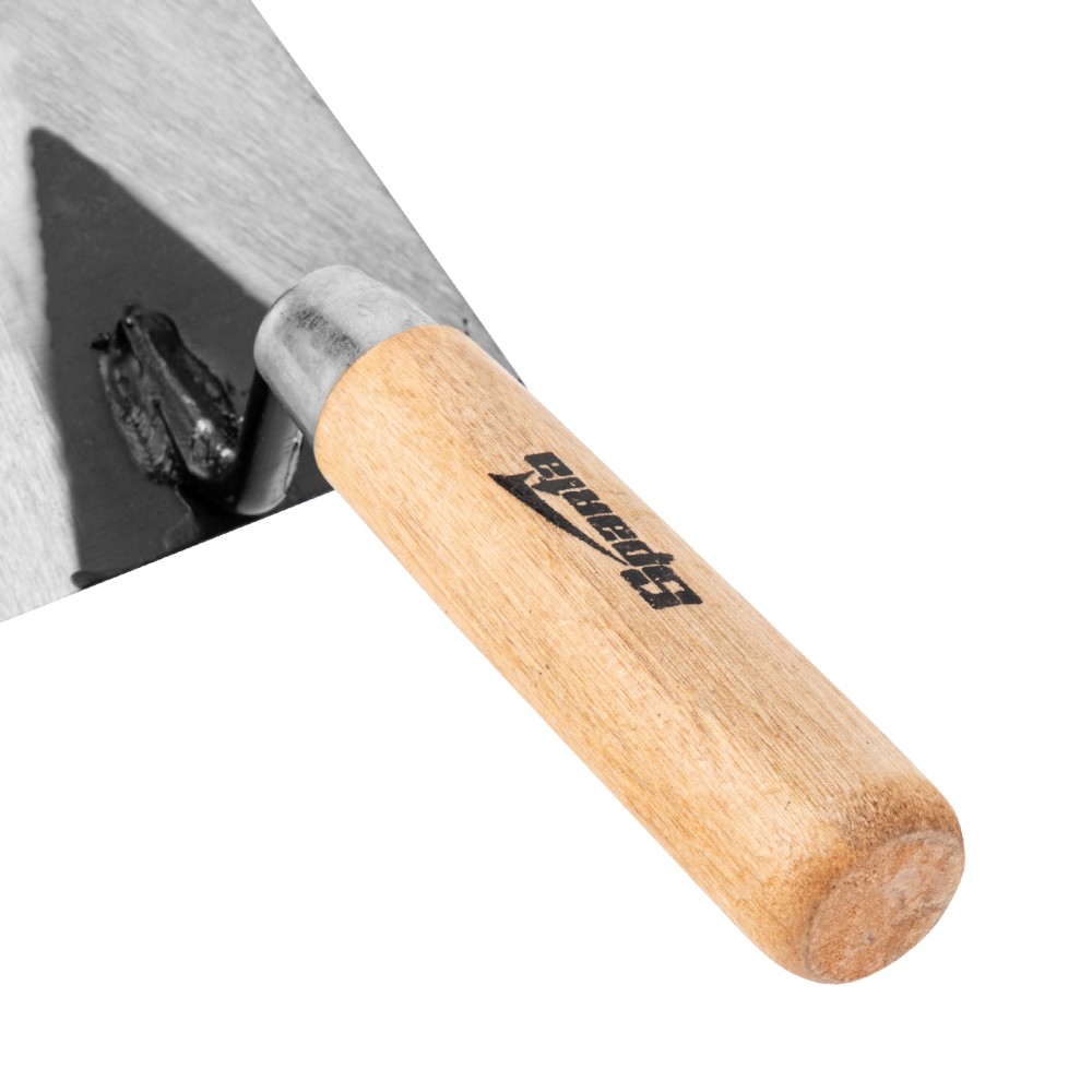 Стальная кельма отделочника Sparta 862745 имеет трапециевидное рабочее полотно длиной 160 мм и деревянную ручку. Инструмент предназначен для нанесения и разравнивания гипсовых, цементных смесей и клеевых составов. Благодаря прямым граням кельма легко удаляет излишки раствора. Применяется для укладки плитки и проведения других строительных и отделочных работ.ПреимуществаПрочная и надежная конструкция — рабочее полотно изготовлено из инструментальной углеродистой стали, ручка прикреплена к полотну сварным методом.Защита от разрушения — лаковое покрытие предотвращает рассыхание рукоятки и предохраняет ее от воздействия влаги.Высокая производительность — полотном 16 х 8 см удобно накидывать большое количество смеси за один раз.Комфортная работа — приятная на ощупь деревянная рукоятка удобно лежит в руке.