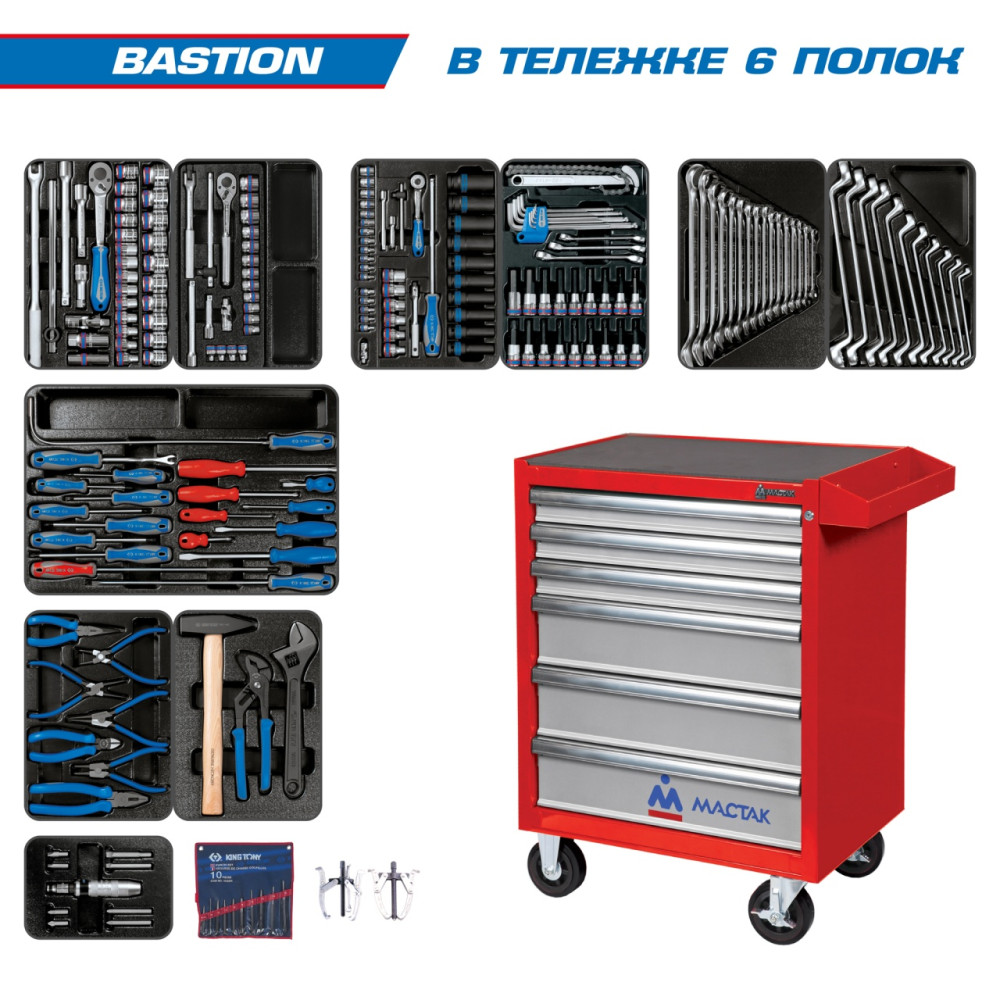 Набор инструментов "BASTION" в красной тележке, 204 предмета KING TONY 934-100AMR
