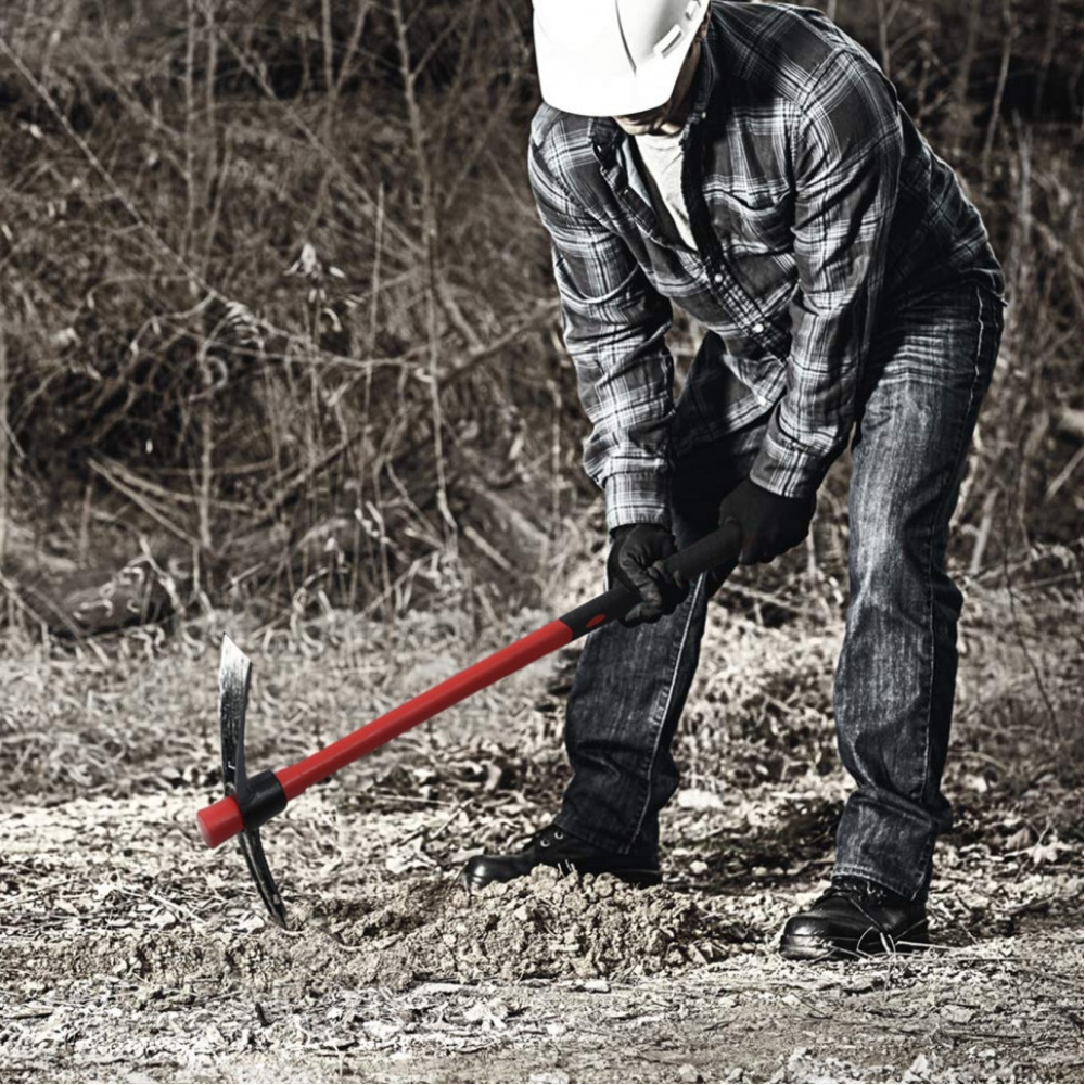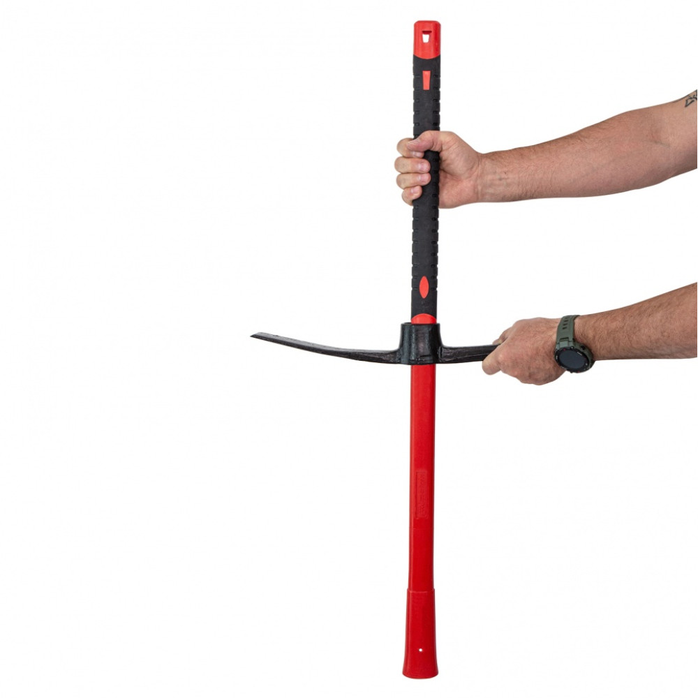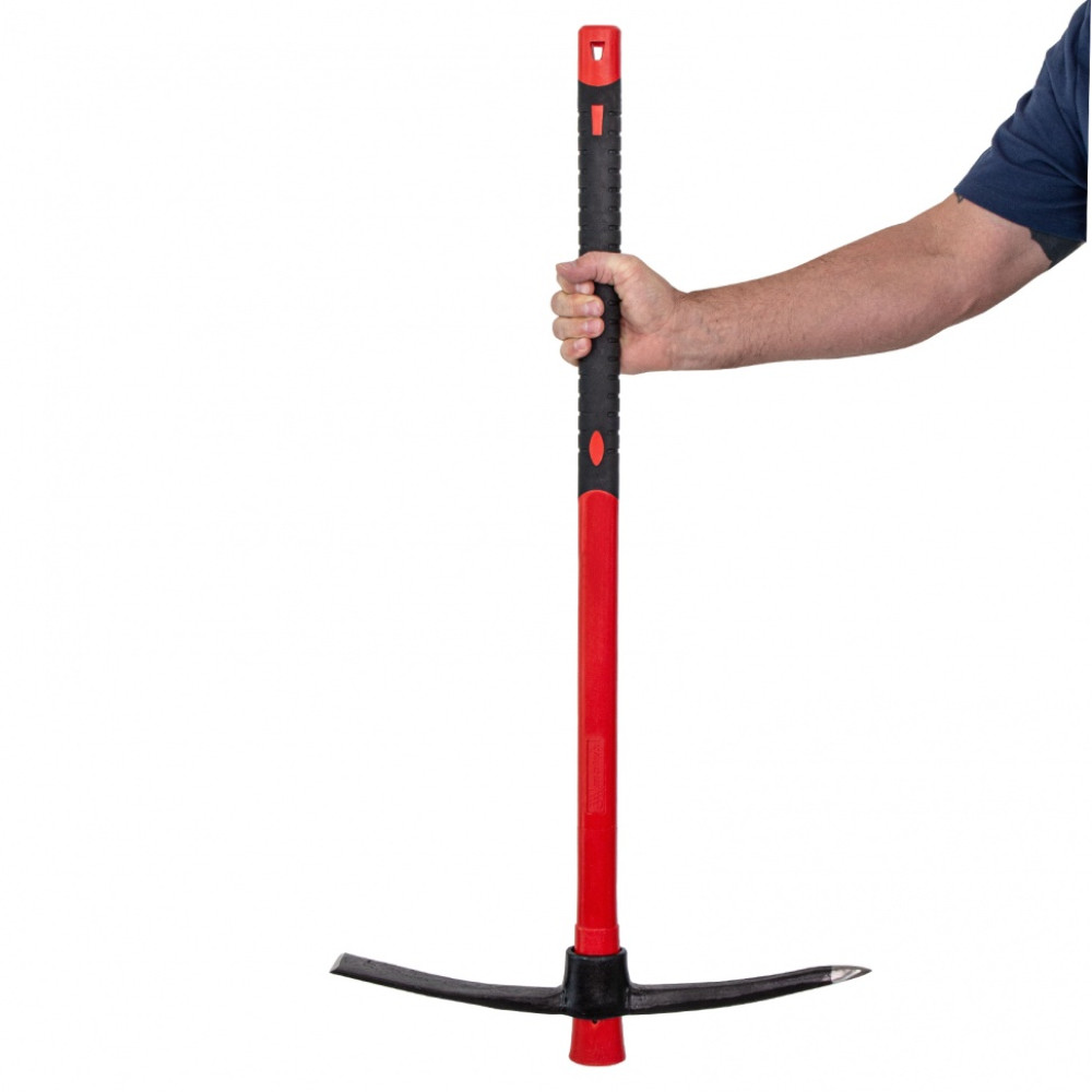 - Надежная конструкция — голова кирки крепится к рукоятке на «протяг», что исключает ее соскакивание в процессе работы.