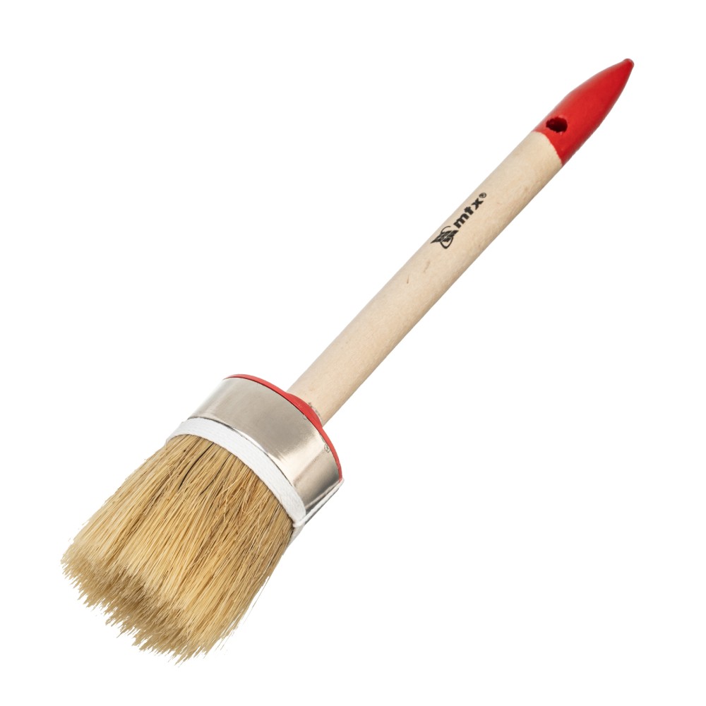 Круглая кисть MTX Профи №12 82048 диаметром 45 мм, с натуральной щетиной и деревянной ручкой, используется при проведении профессиональных малярных работ. Рабочая часть из натуральной свиной щетины с небольшим добавлением искусственной устойчива к агрессивным масляным краскам и ЛКМ на основе растворителей. Круглая кисть оптимально подходит для окрашивания узких и труднодоступных участков.ПреимуществаВысокое качество работ — щетина двойной выварки не содержит включений жира и мелких частиц грязи.Производительность — расщепленная на концах щетина обеспечивает высокую впитывающую способность и отдачу ЛКМ.Антикоррозийное покрытие — металлический бандаж не ржавеет при контакте с водой, поэтому кисть можно мыть.Комфорт и надежность — рукоятка выполнена из отборной древесины, отшлифована и покрыта защитным лаком.Удобное хранение — отверстие в рукоятке позволяет подвешивать кисть на крючок.