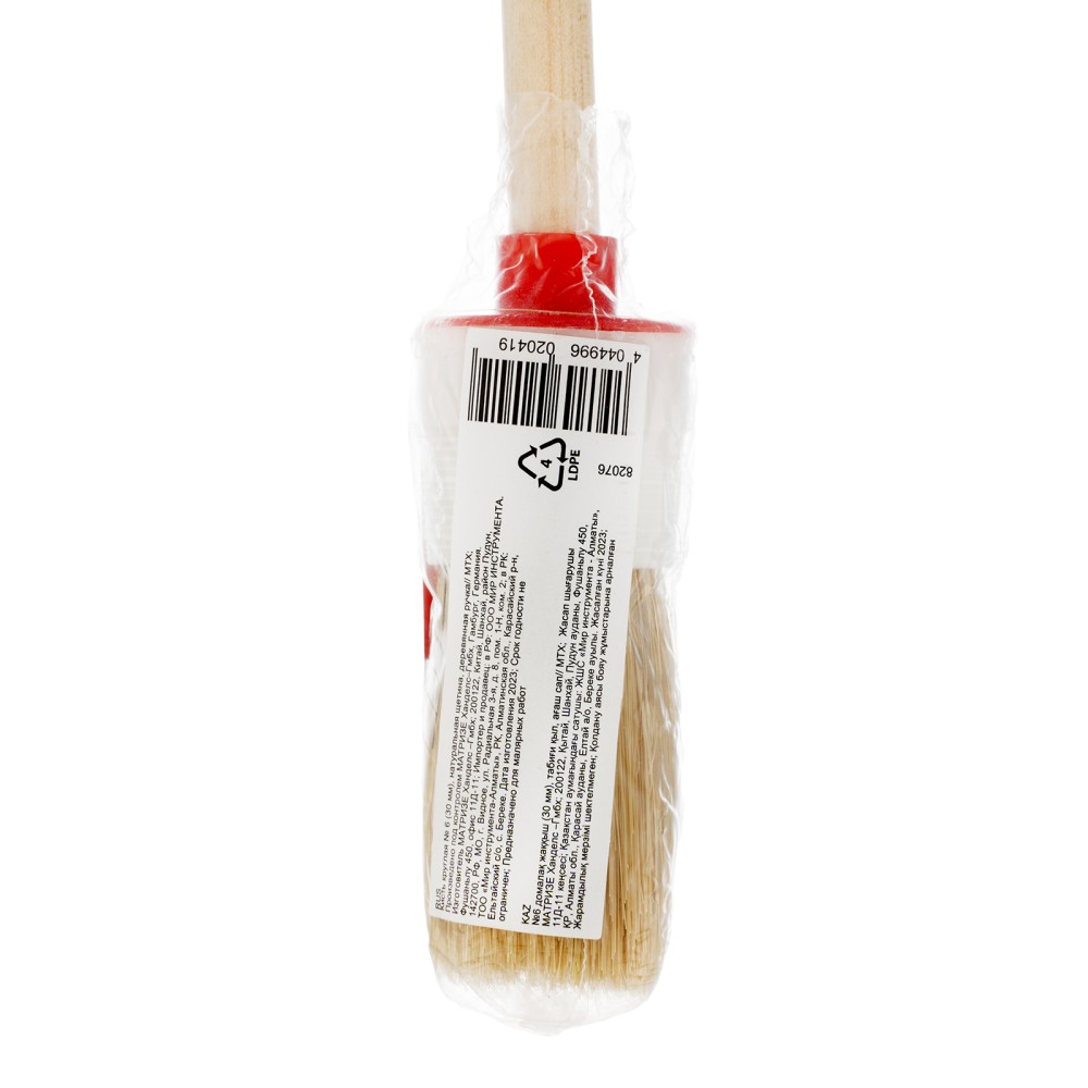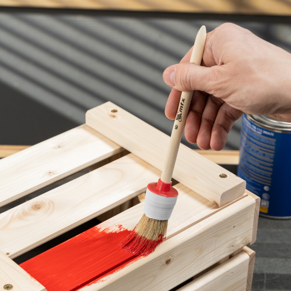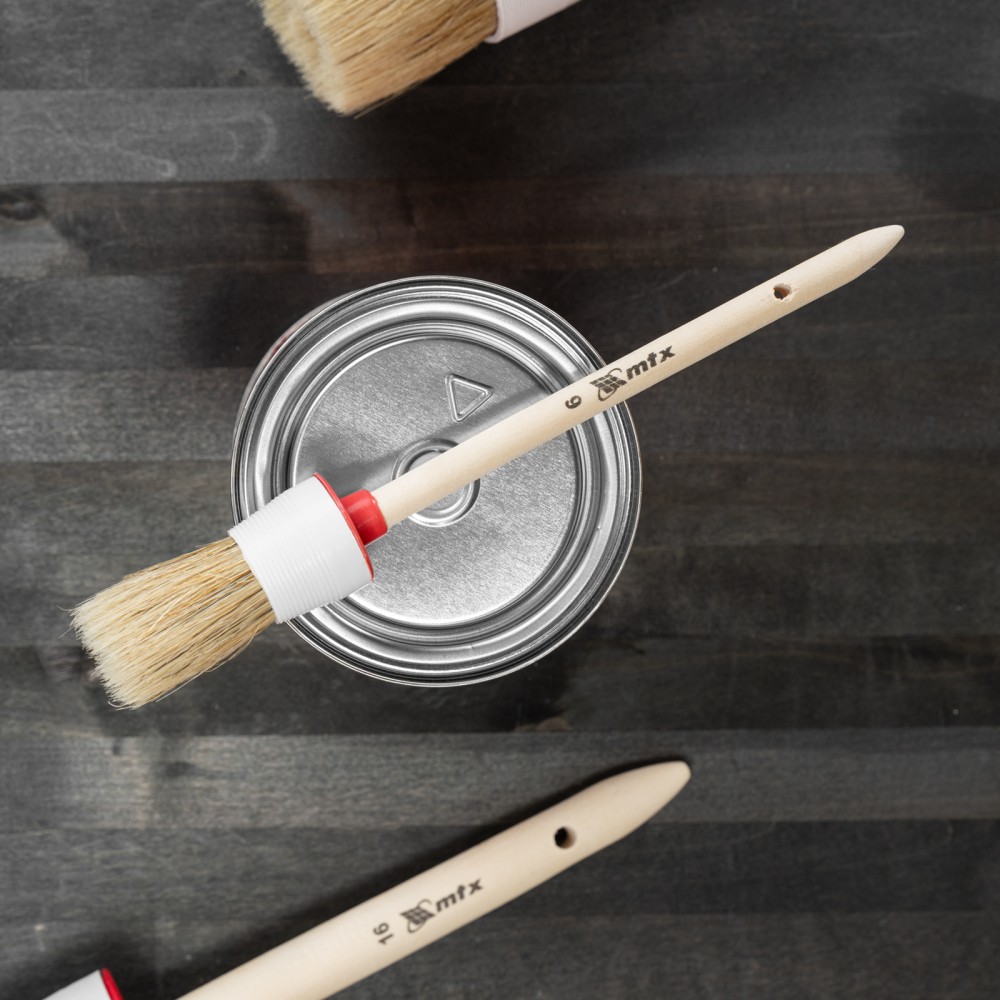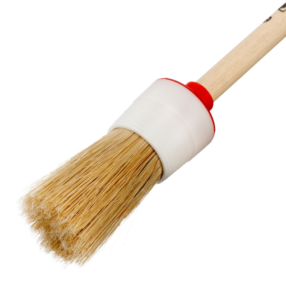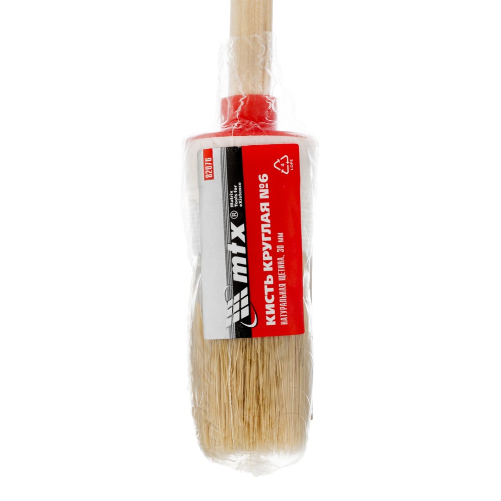 Круглая кисть MTX №6 82076 диаметром 30 мм, с натуральной щетиной и деревянной ручкой, пригодится в быту для окрашивания узких длинных поверхностей. Светлая натуральная свиная щетина с добавлением искусственной обладает высокой износоустойчивостью и может использоваться для нанесения красок с содержанием растворителей, а также масляных красок и лаков.ПреимуществаВысокое качество работ — за счет двойной выварки щетина не содержит включений жира и мелких частиц грязи.Эффективность — щетина расщеплена на концах, что увеличивает способность кисти набирать и отдавать лакокрасочные материалы.Долговечность — пластиковый бандаж надежно фиксирует щетину и не разрушается под воздействием воды, поэтому кисть можно мыть.Комфорт и надежность — рукоятка выполнена из отборной древесины, отшлифована и покрыта защитным лаком.Удобное хранение — в рукоятке предусмотрено отверстие для подвешивания на крючок.
