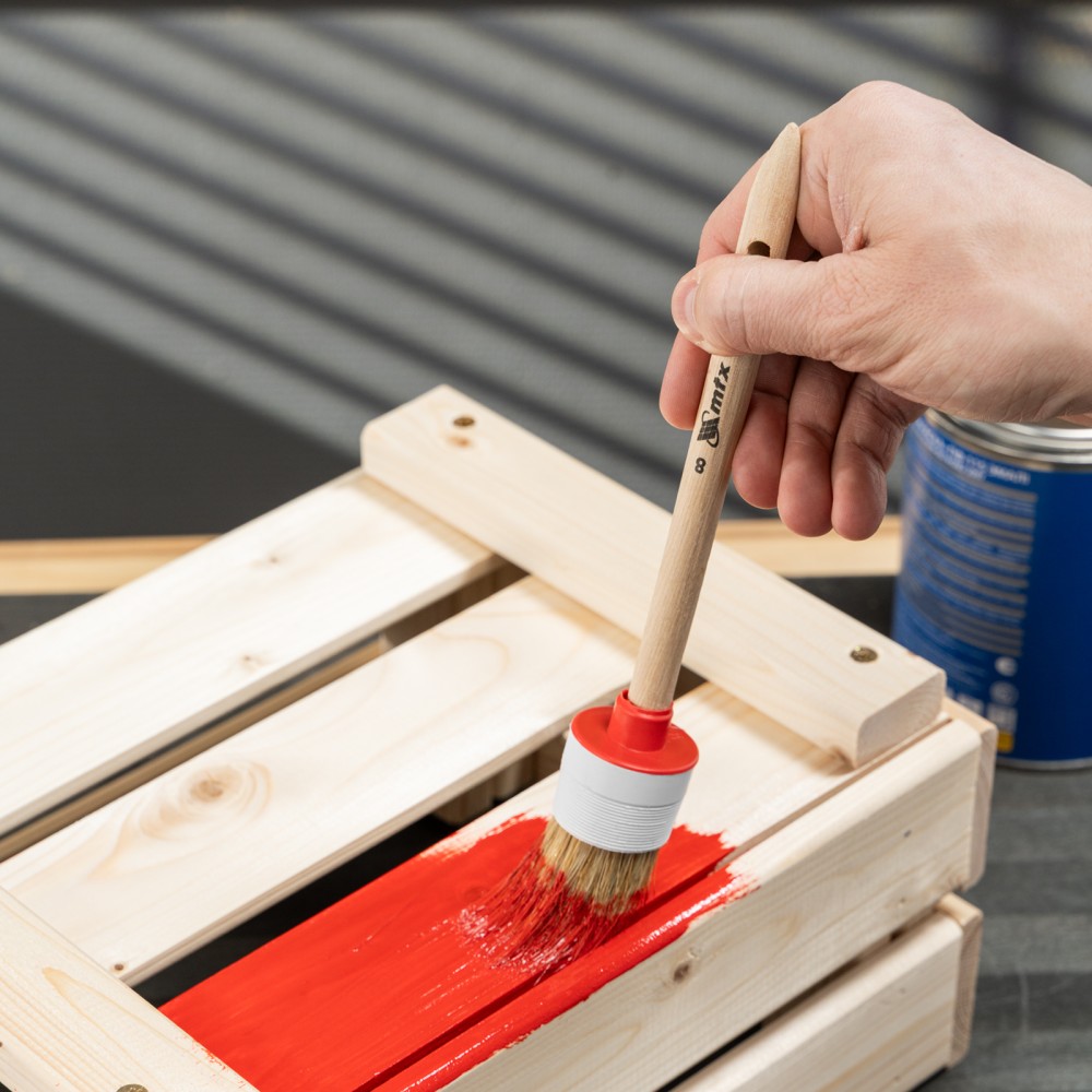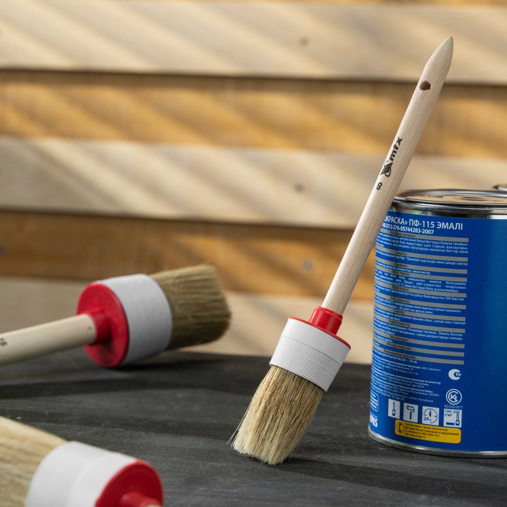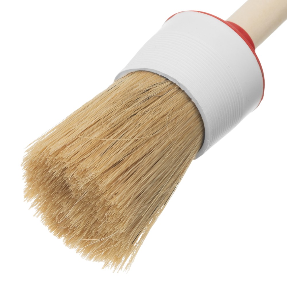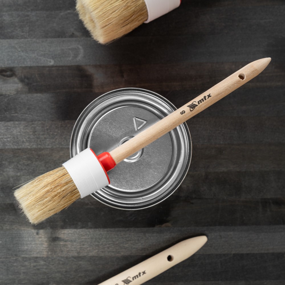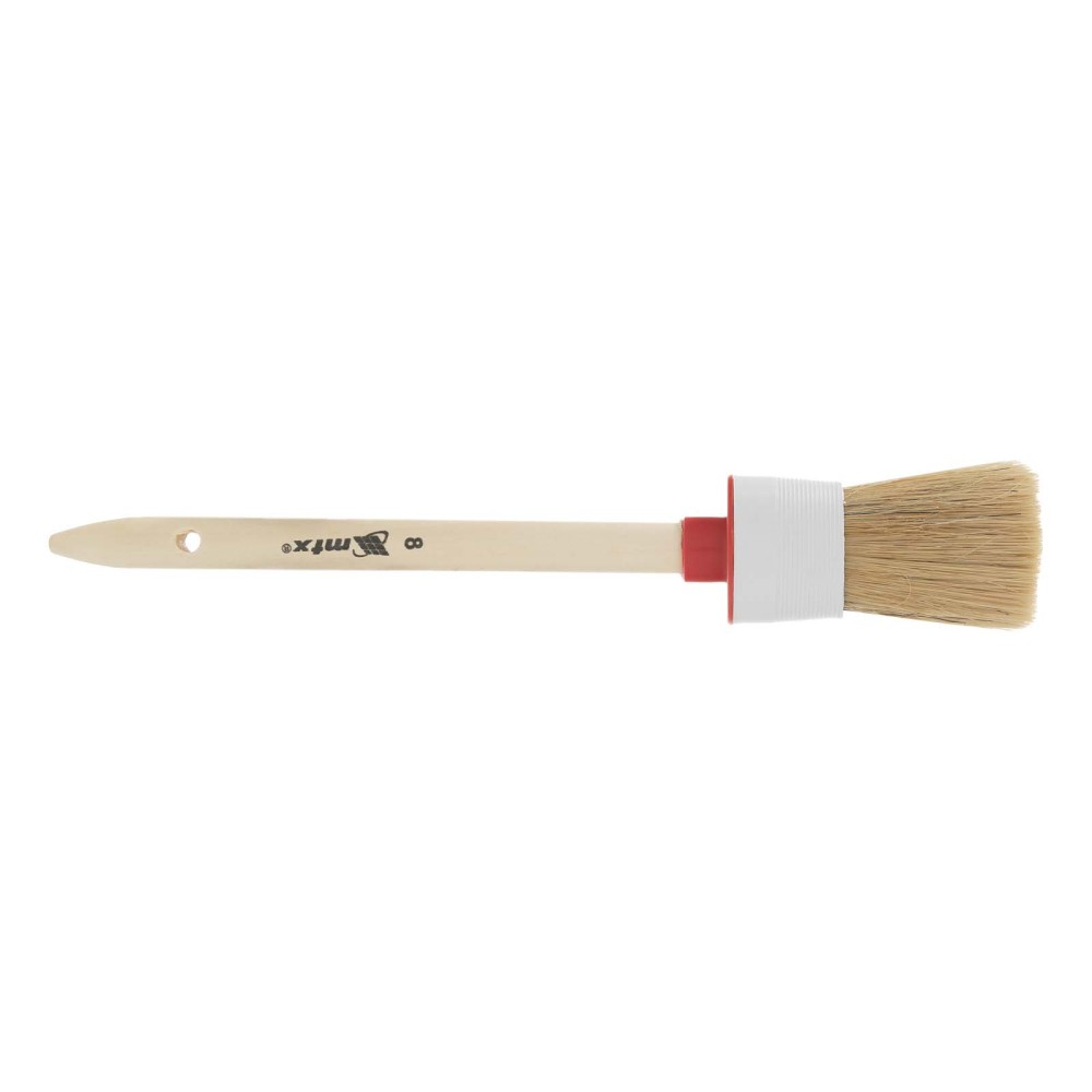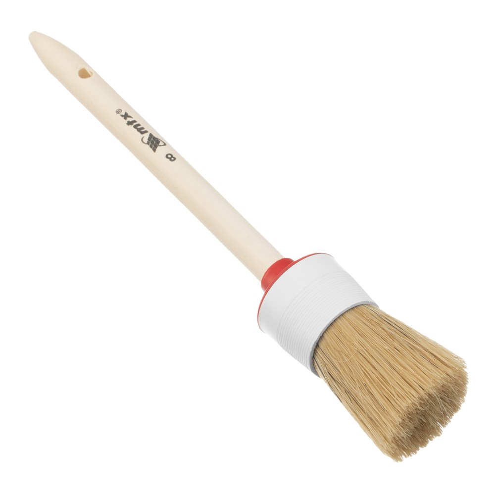 Круглая кисть MTX №8 82078 диаметром 35 мм, с натуральной щетиной и деревянной ручкой, пригодится в быту для окрашивания узких длинных поверхностей. Светлая натуральная свиная щетина с добавлением искусственной обладает высокой износоустойчивостью и может использоваться для нанесения красок с содержанием растворителей, а также масляных красок и лаков.ПреимуществаВысокое качество работ — за счет двойной выварки щетина не содержит включений жира и мелких частиц грязи.Эффективность — щетина расщеплена на концах, что увеличивает способность кисти набирать и отдавать лакокрасочные материалы.Долговечность — пластиковый бандаж надежно фиксирует щетину и не разрушается под воздействием воды, поэтому кисть можно мыть.Комфорт и надежность — рукоятка выполнена из отборной древесины, отшлифована и покрыта защитным лаком.Удобное хранение — в рукоятке предусмотрено отверстие для подвешивания на крючок.