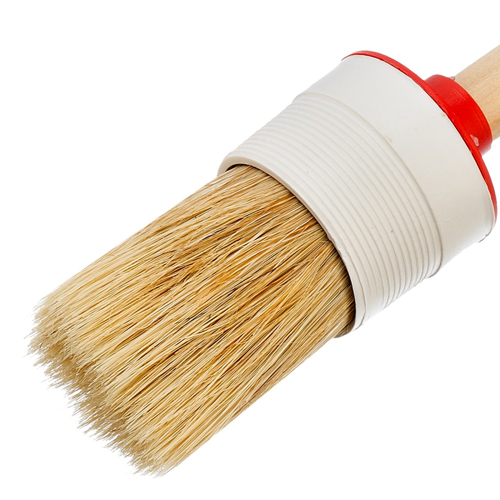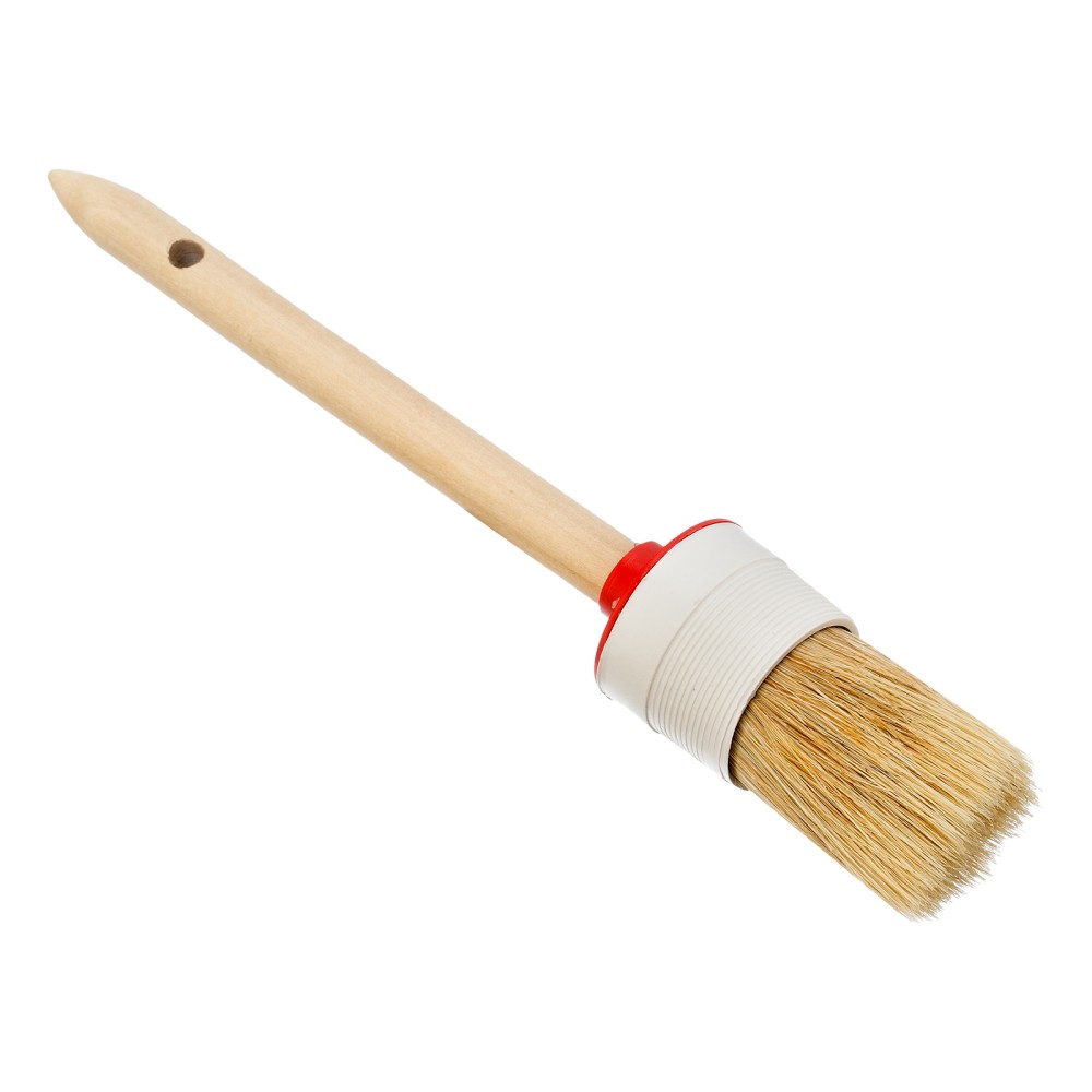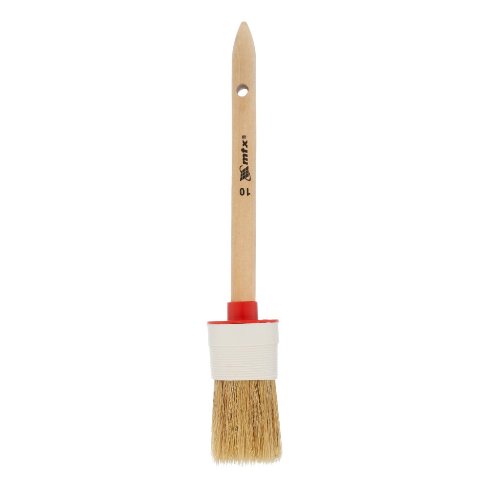 Круглая кисть MTX №10 82080 диаметром 40 мм, с натуральной щетиной и деревянной ручкой, пригодится в быту для окрашивания узких длинных поверхностей. Светлая натуральная свиная щетина с добавлением искусственной обладает высокой износоустойчивостью и может использоваться для нанесения красок с содержанием растворителей, а также масляных красок и лаков.ПреимуществаВысокое качество работ — за счет двойной выварки щетина не содержит включений жира и мелких частиц грязи.Эффективность — щетина расщеплена на концах, что увеличивает способность кисти набирать и отдавать лакокрасочные материалы.Долговечность — пластиковый бандаж надежно фиксирует щетину и не разрушается под воздействием воды, поэтому кисть можно мыть.Комфорт и надежность — рукоятка выполнена из отборной древесины, отшлифована и покрыта защитным лаком.Удобное хранение — в рукоятке предусмотрено отверстие для подвешивания на крючок.