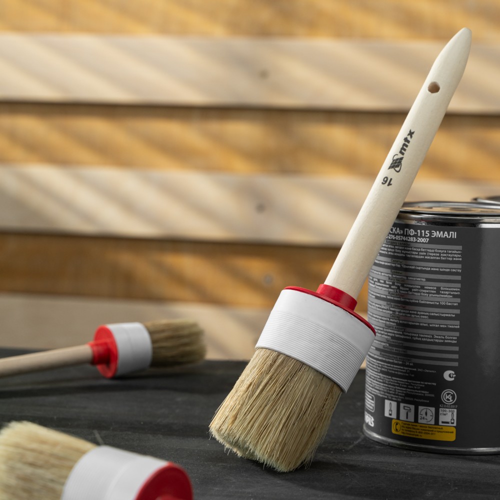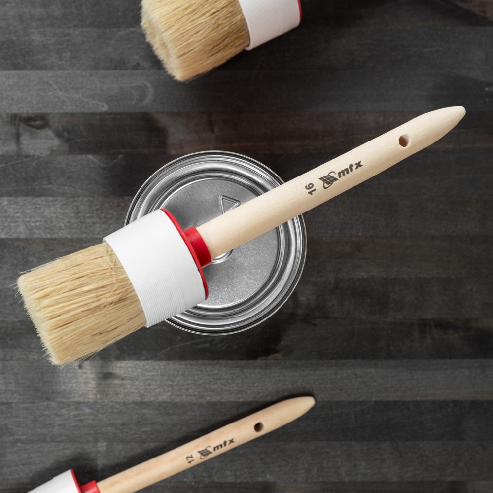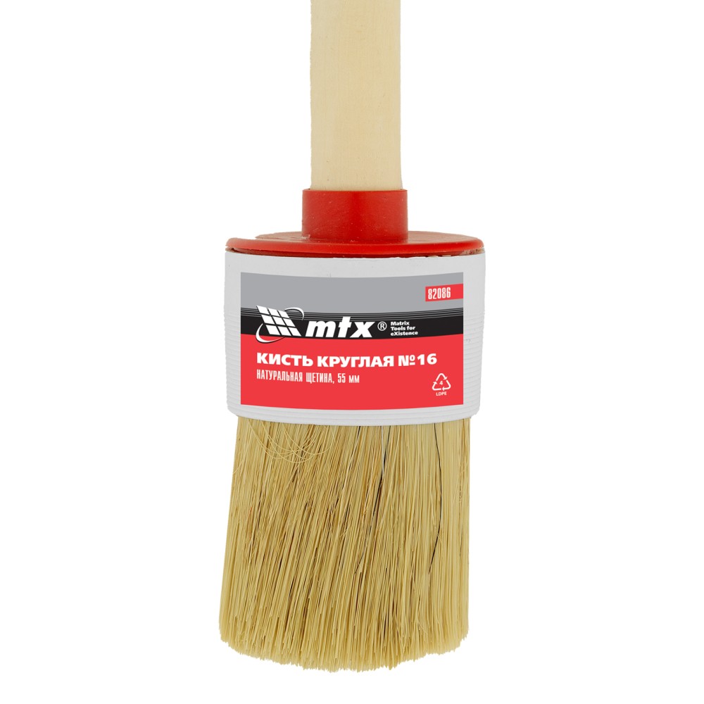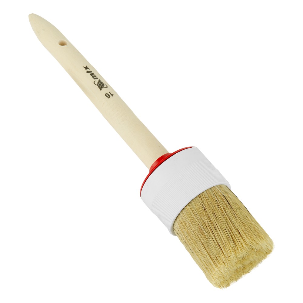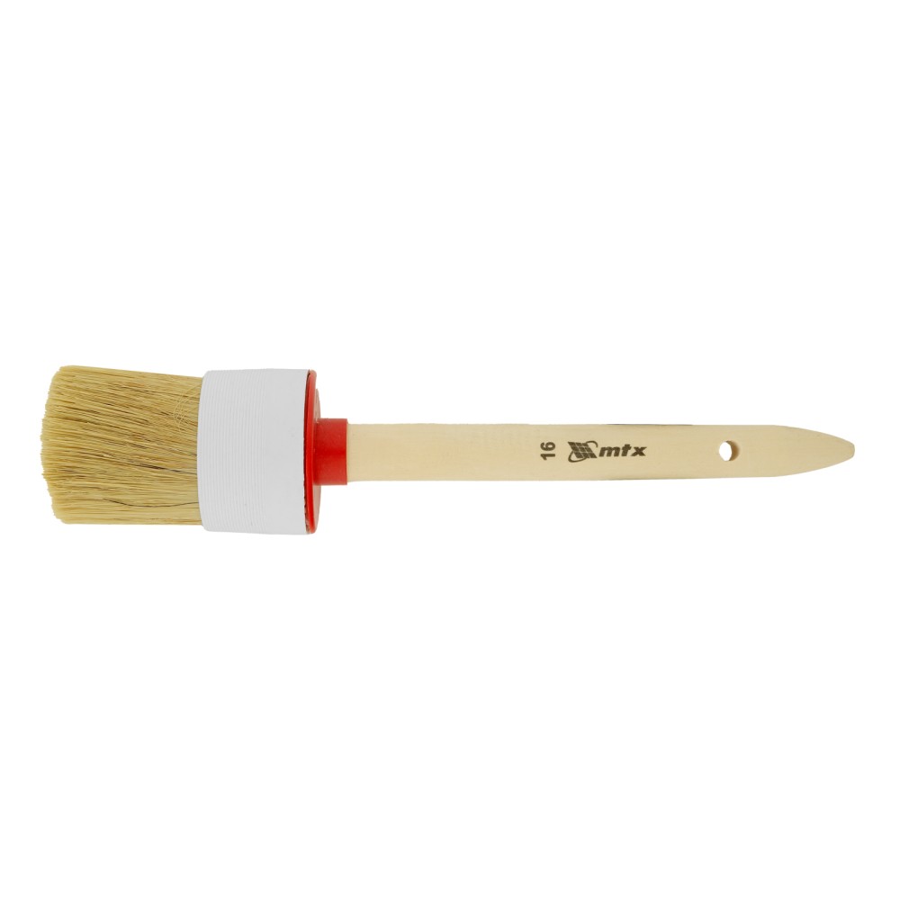 Круглая кисть MTX №16 82086 диаметром 55 мм, с натуральной щетиной и деревянной ручкой, пригодится в быту для окрашивания узких длинных поверхностей. Светлая натуральная свиная щетина с добавлением искусственной обладает высокой износоустойчивостью и может использоваться для нанесения красок с содержанием растворителей, а также масляных красок и лаков.ПреимуществаВысокое качество работ — за счет двойной выварки щетина не содержит включений жира и мелких частиц грязи.Эффективность — щетина расщеплена на концах, что увеличивает способность кисти набирать и отдавать лакокрасочные материалы.Долговечность — пластиковый бандаж надежно фиксирует щетину и не разрушается под воздействием воды, поэтому кисть можно мыть.Комфорт и надежность — рукоятка выполнена из отборной древесины, отшлифована и покрыта защитным лаком.Удобное хранение — в рукоятке предусмотрено отверстие для подвешивания на крючок.