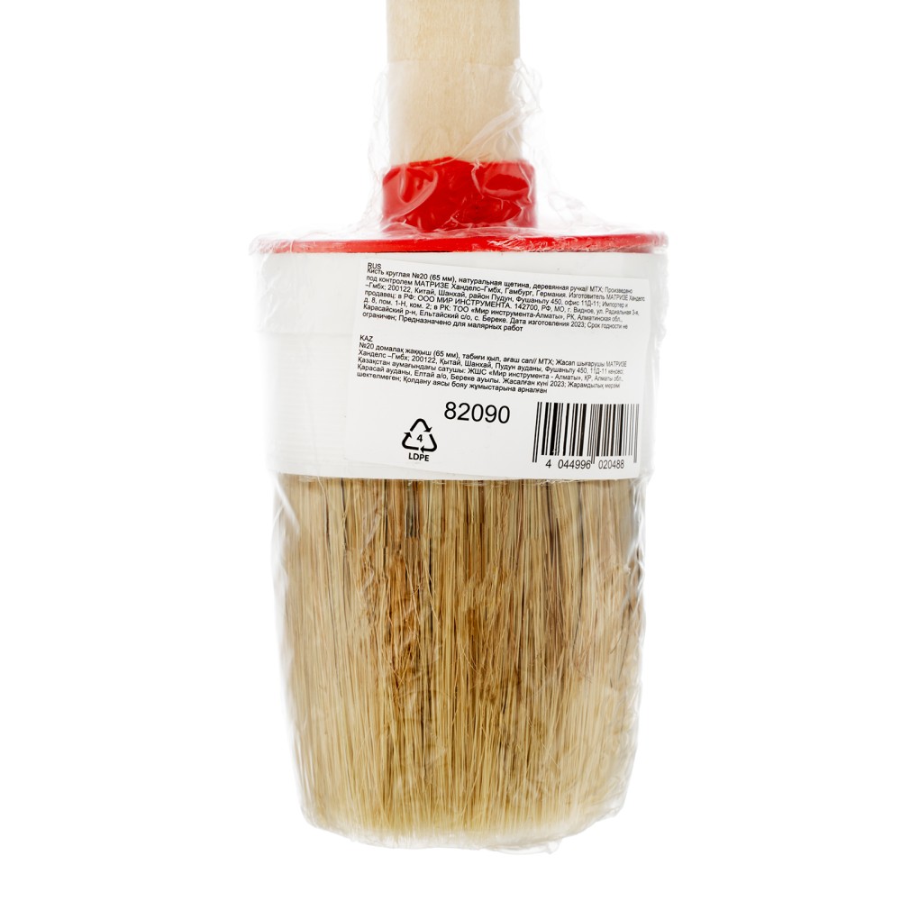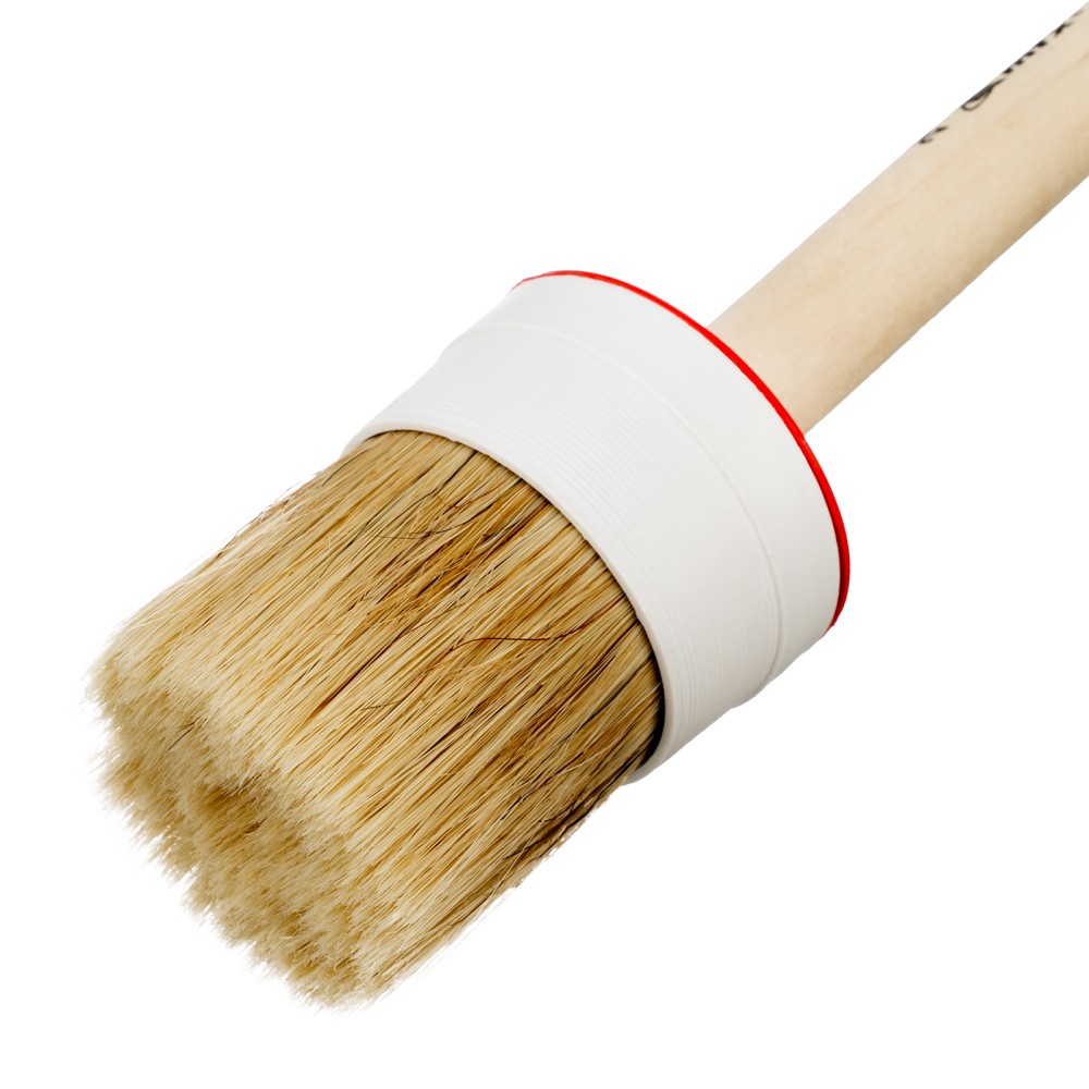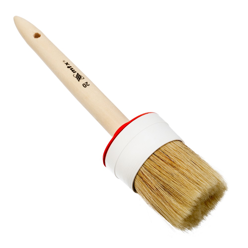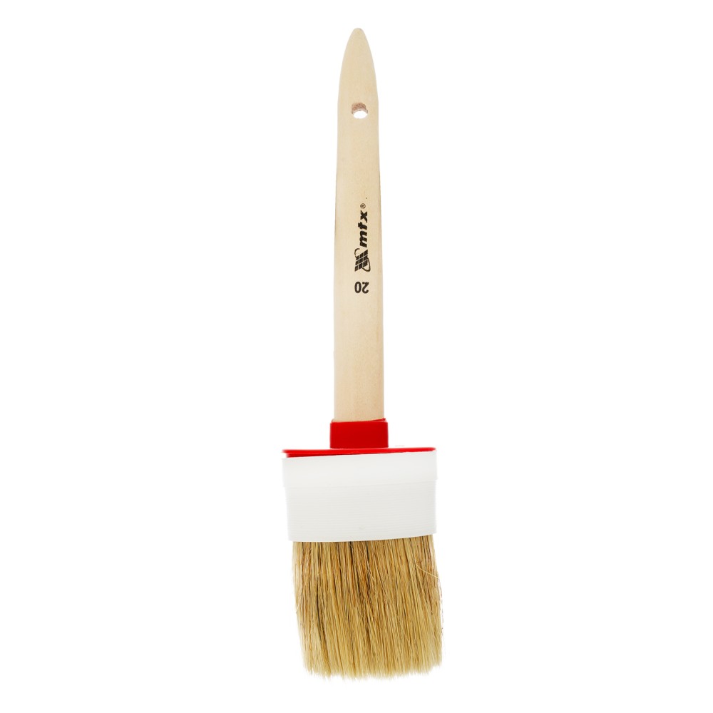Круглая кисть MTX №20 82090 диаметром 65 мм, с натуральной щетиной и деревянной ручкой, пригодится в быту для окрашивания узких длинных поверхностей. Светлая натуральная свиная щетина с добавлением искусственной обладает высокой износоустойчивостью и может использоваться для нанесения красок с содержанием растворителей, а также масляных красок и лаков.ПреимуществаВысокое качество работ — за счет двойной выварки щетина не содержит включений жира и мелких частиц грязи.Эффективность — щетина расщеплена на концах, что увеличивает способность кисти набирать и отдавать лакокрасочные материалы.Долговечность — пластиковый бандаж надежно фиксирует щетину и не разрушается под воздействием воды, поэтому кисть можно мыть.Комфорт и надежность — рукоятка выполнена из отборной древесины, отшлифована и покрыта защитным лаком.Удобное хранение — в рукоятке предусмотрено отверстие для подвешивания на крючок.