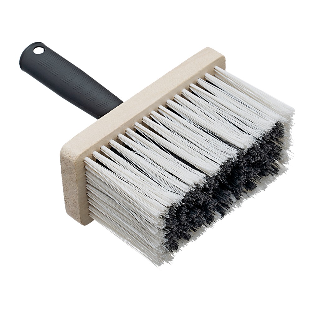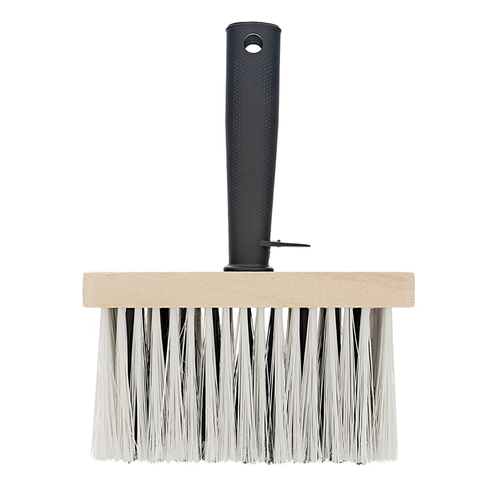 Кисть-макловица MTX 84088 шириной 150 мм и толщиной 70 мм, с искусственной щетиной, деревянным корпусом и пластмассовой ручкой, предназначена для нанесения лакокрасочных материалов и клеевых составов на участки большой площади — стены, потолки, фасады. Искусственный ворс не впитывает воду и устойчив к растворителям, поэтому кисть подходит для работ с грунтовками, лаками, водно-дисперсионными и масляными красками.ПреимуществаВозможность многократного использования — щетина тщательно проклеена и надежно закреплена в деревянном корпусе, поэтому не осыпается во время работы.Эффективное окрашивание — расщепленная на концах щетина способна набирать и равномерно отдавать большой объем лакокрасочного материала.Функциональность — полая рукоятка адаптирована под использование удлиняющих стержней, что позволяет работать на большой высоте и в труднодоступных местах без использования подмостей или стремянки.Эргономичность — при помощи специального выступа на рукоятке кисть можно закрепить на краю ведра, ванночки или банки с краской, отверстие в ручке позволяет подвешивать инструмент на крючок или гвоздь.