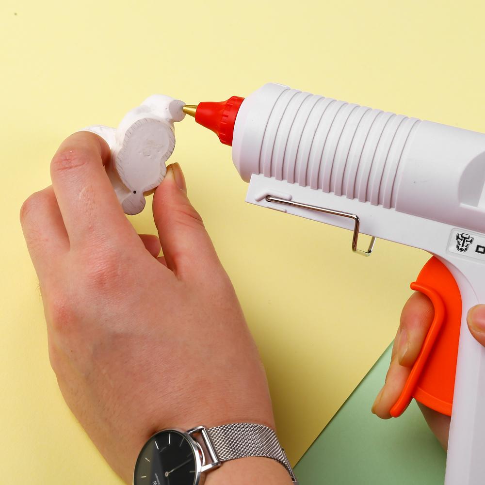 - Пистолет быстро нагревает клей, который способен склеить практически любой предмет, его можно использовать с любым материалом, включая дерево, ткань, камень, стекло, металл, пластик и пену.