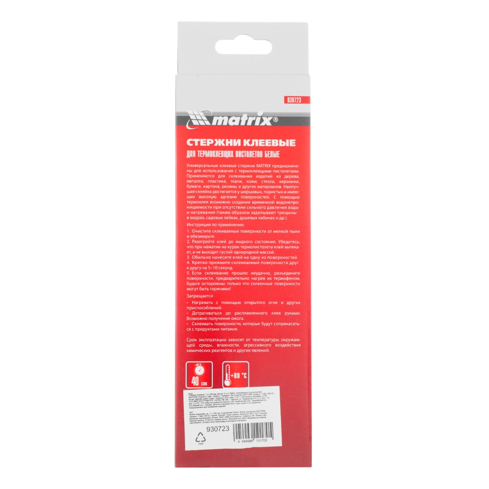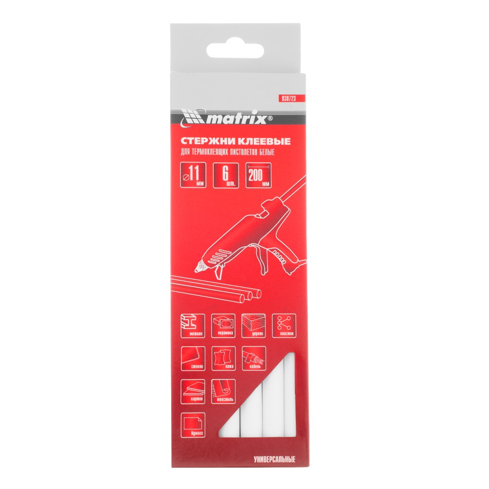 Белые клеевые стержни Matrix 930723 длиной 200 мм, 6 шт. в упаковке, — расходные материалы для клеевых пистолетов калибра 11 мм. Обеспечивают надежное сцепление различных материалов: бумаги, пластика, древесины, керамики, электрических плат и т.д. Подходят также для герметизации швов и трещин.ПреимуществаТемпература плавления 90 градусов — стержни оптимально подходят для маломощных клеевых пистолетов.Экологичность и долговечность — стержни из безопасного полимера EVA с содержанием воска и смолы не токсичны, устойчивы к воздействию воды и химических веществ.Удобная комплектация — 6 расходников хватит для выполнения большого объема работ.