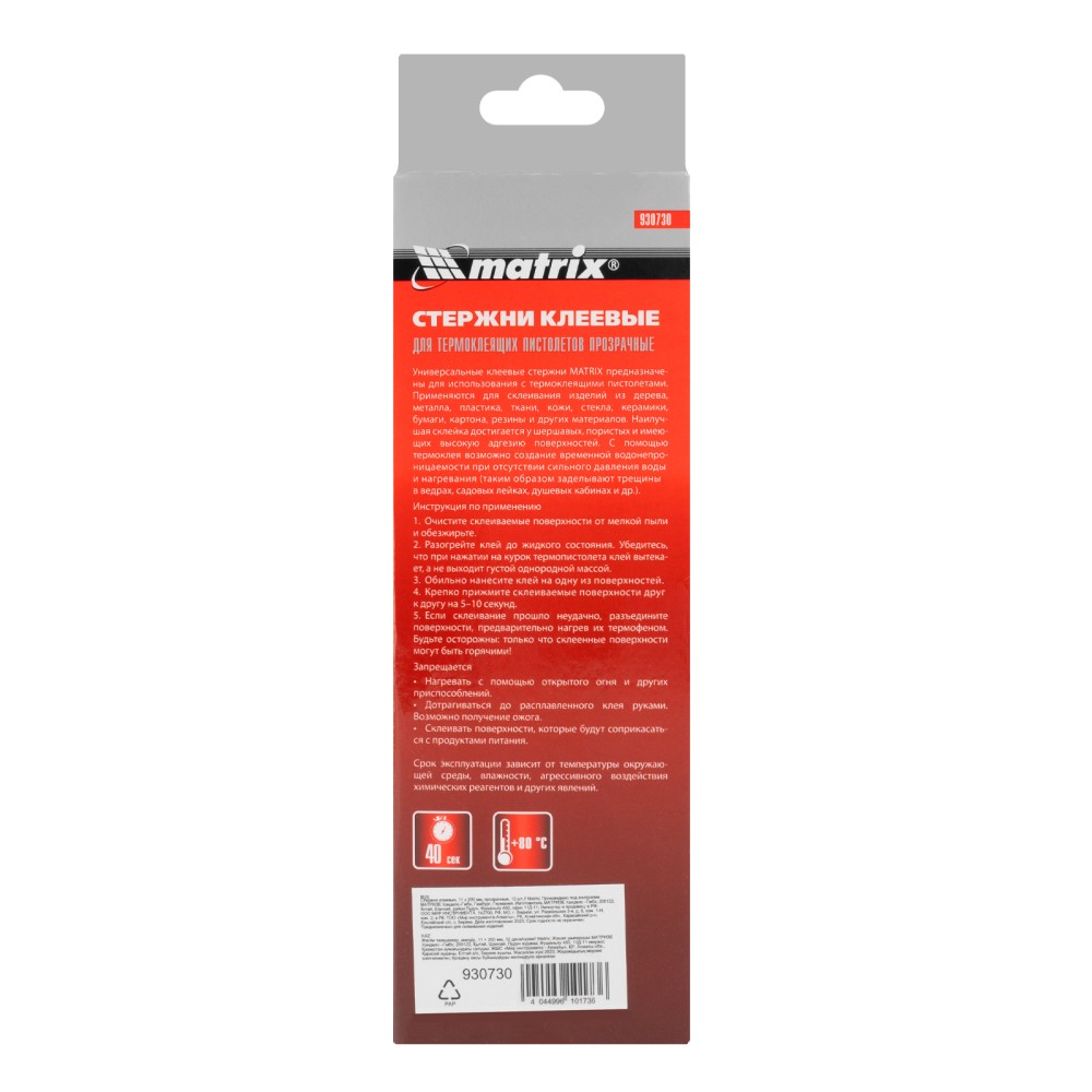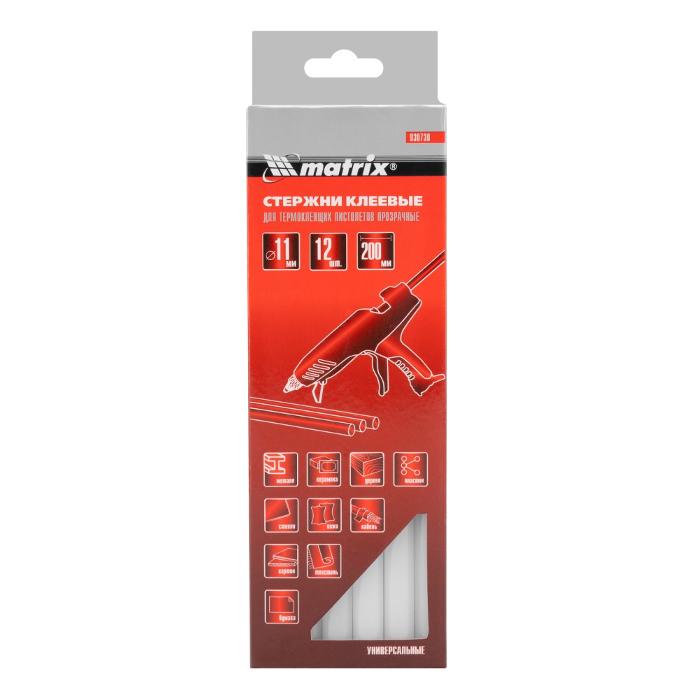 Прозрачные клеевые стержни Matrix 930730 длиной 200 мм, 12 шт. в упаковке, — расходные материалы для клеевых пистолетов калибра 11 мм. Обеспечивают надежное сцепление различных материалов: бумаги, пластика, древесины, керамики, электрических плат и т.д. Подходят также для герметизации швов и трещин.ПреимуществаУниверсальность — прозрачные стержни оставляют незаметный клеевой шов и могут использоваться с материалами разных цветов.Температура плавления 90 градусов — стержни оптимально подходят для маломощных клеевых пистолетов.Экологичность и долговечность — стержни из безопасного полимера EVA с содержанием воска и смолы не токсичны, устойчивы к воздействию воды и химических веществ.Удобная комплектация — 12 стержней хватит для выполнения большого объема работ.