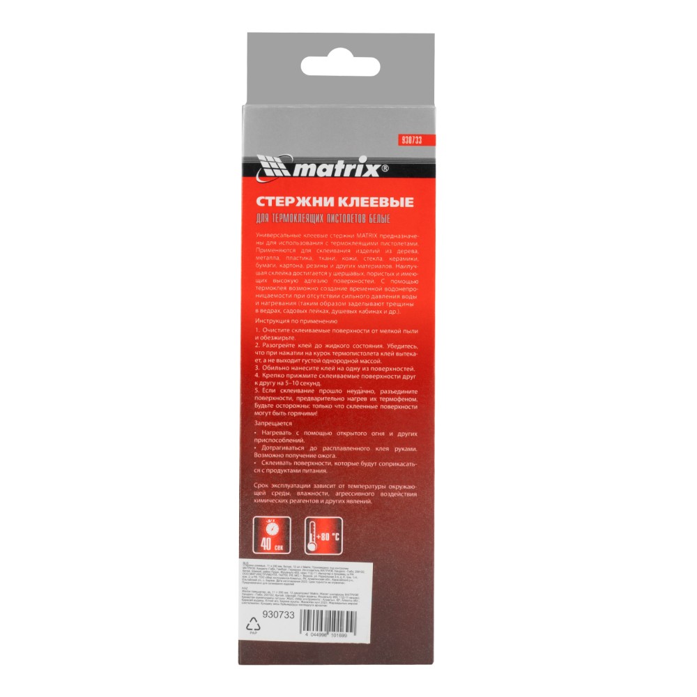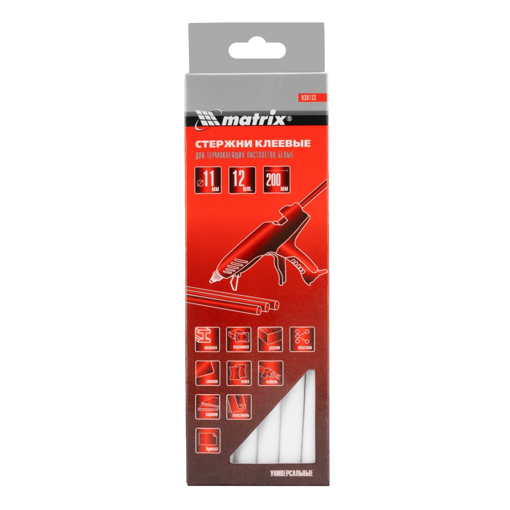 Белые клеевые стержни Matrix 930733 длиной 200 мм, 12 шт. в упаковке, — расходные материалы для клеевых пистолетов калибра 11 мм. Обеспечивают надежное сцепление различных материалов: бумаги, пластика, древесины, керамики, электрических плат и т.д. Подходят также для герметизации швов и трещин.ПреимуществаТемпература плавления 90 градусов — стержни оптимально подходят для маломощных клеевых пистолетов.Экологичность и долговечность — стержни из безопасного полимера EVA с содержанием воска и смолы не токсичны, устойчивы к воздействию воды и химических веществ.Удобная комплектация — 12 расходников хватит для выполнения большого объема работ.