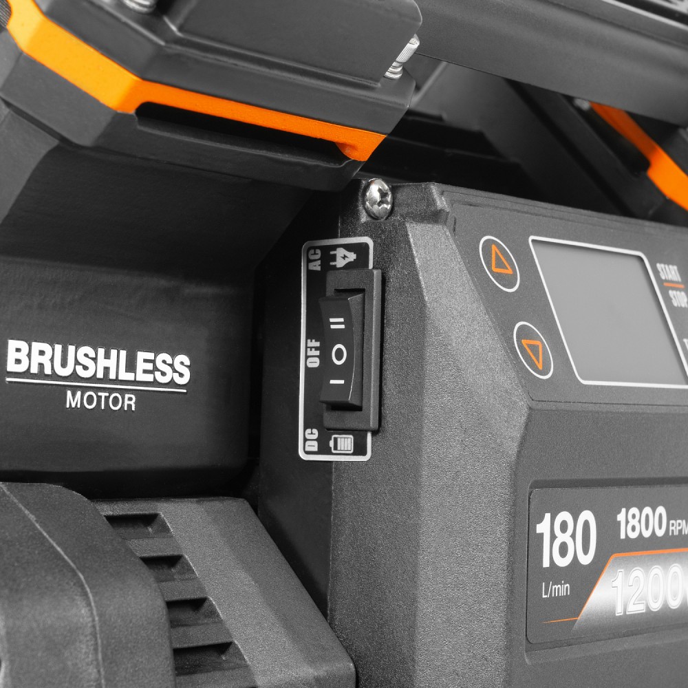 - Полный комплект для начала работы. В комплектацию компрессора входит: сетевой кабель для подключения к сети 230В; Две 21В Li-ion универсальные батареи и зарядное устройство.