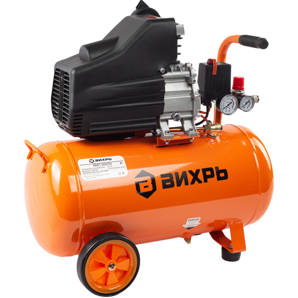 Компрессор ВИХРЬ КМП-300/50 используется для нагнетания сжатого воздуха в различное пневмооборудование в ходе строительно-ремонтных работ в квартире или на даче. Самый мощный в своей линейке. Максимальная производительность компрессора 300 литров в минуту, объем ресивера 50 литров.