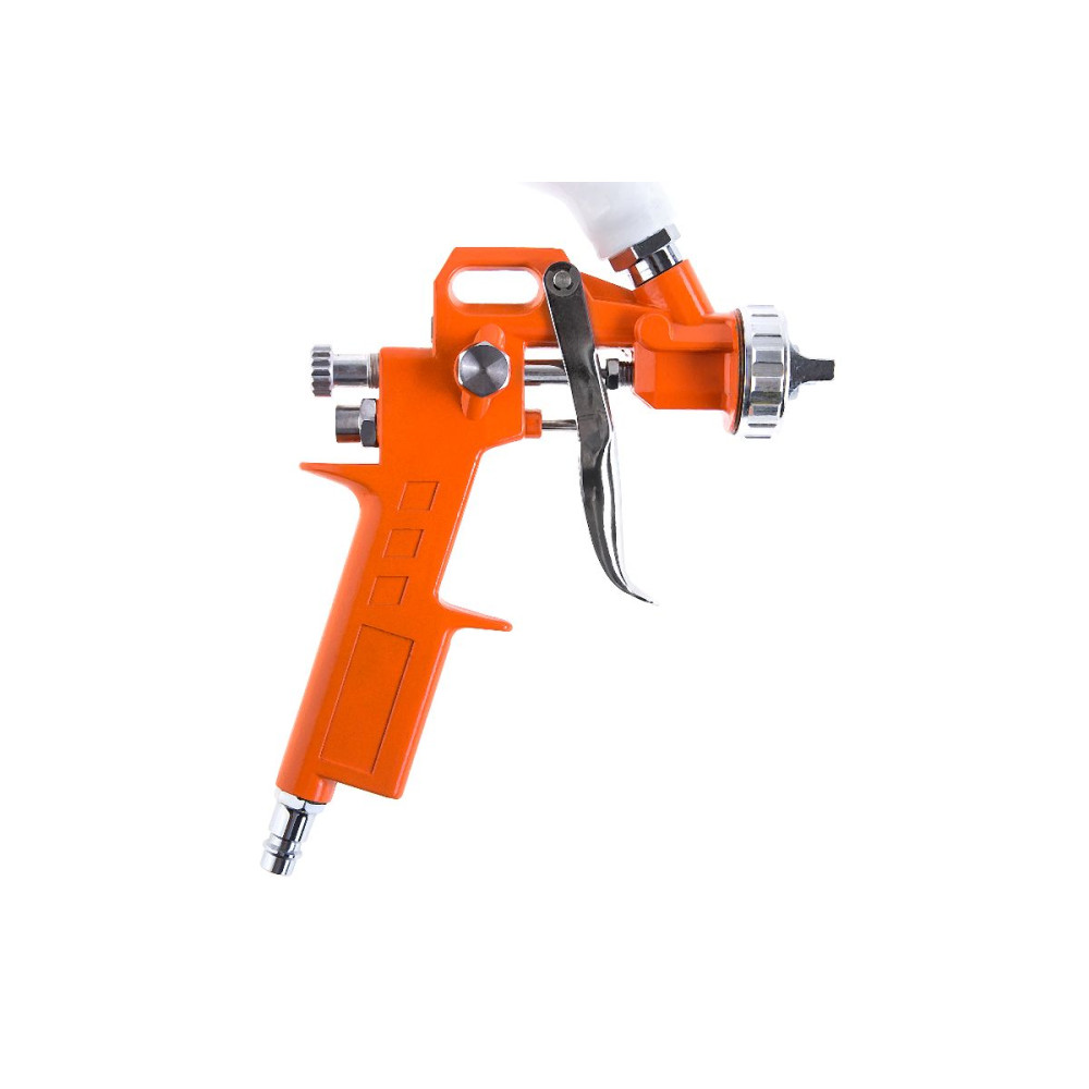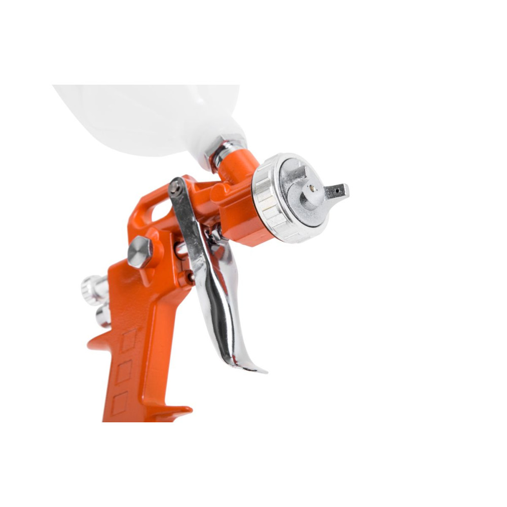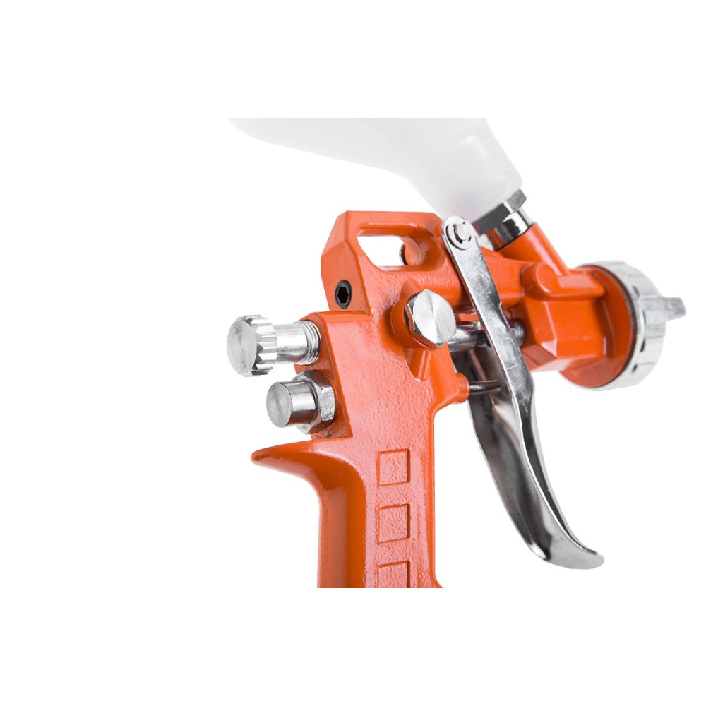 - Бачок объемом 0,6 л расположен сверху. Краска поступает к дозатору, даже если вы держите краскопульт под наклоном.