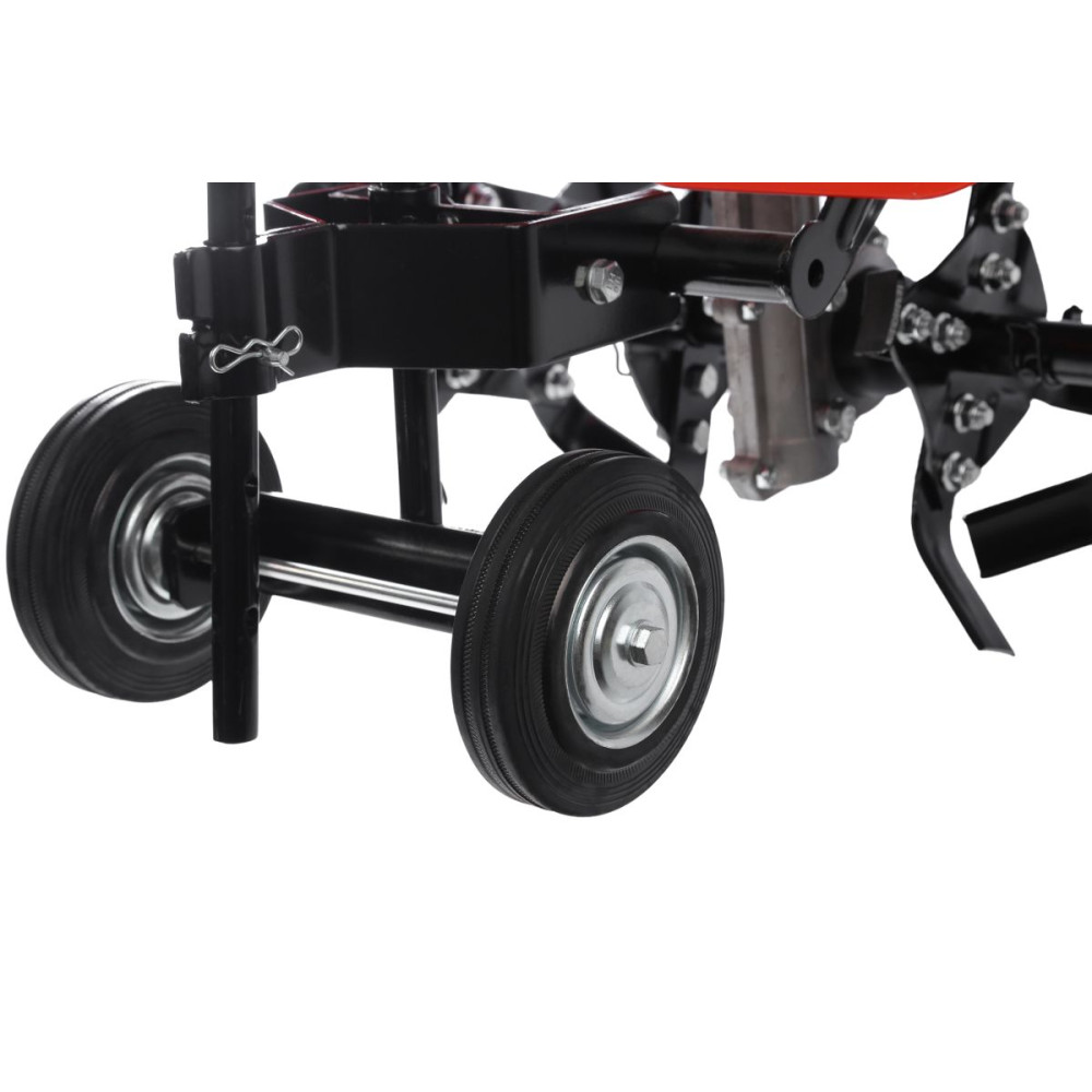 - Колёса расположены на сошнике. Перемещать агрегат удобно, даже когда он выключен, широкие шины не вязнут в земле.