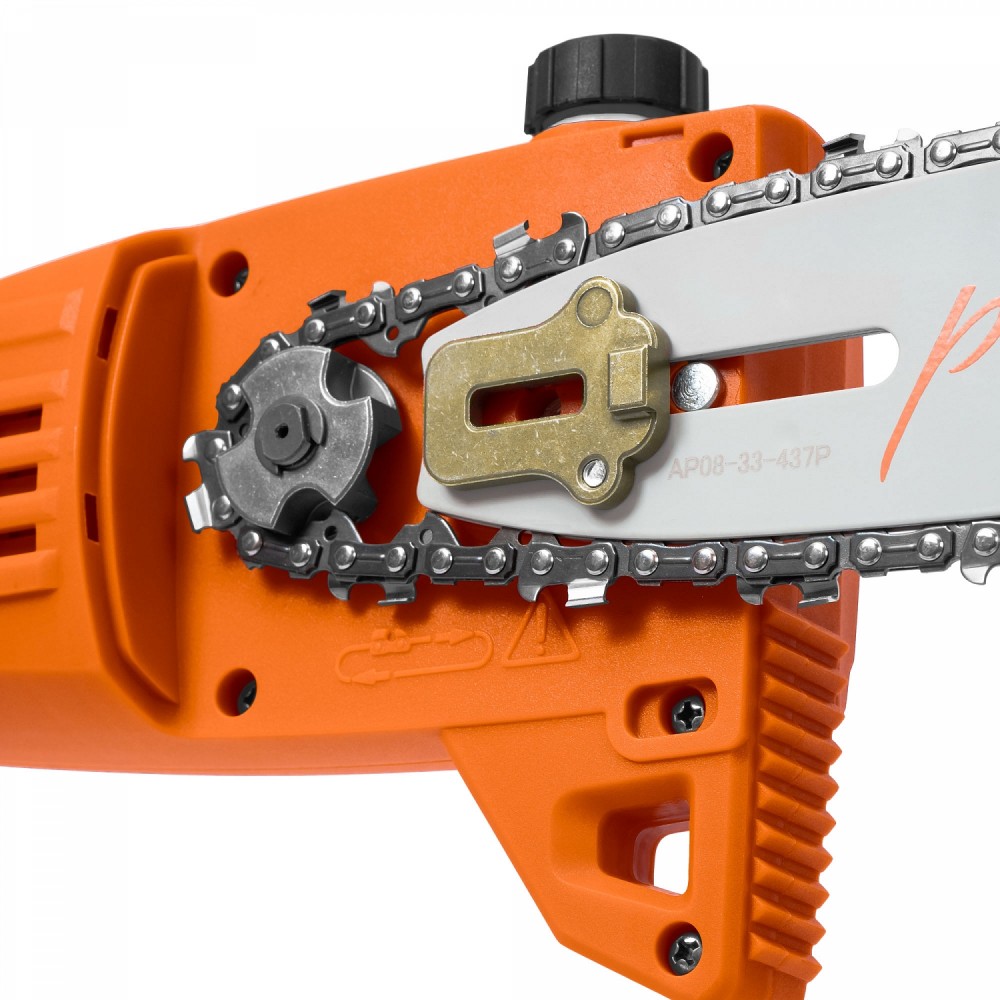 - Надежная пильная цепь и шина. Двухсторонняя шина длиной 20 см и цепь с 48 звеньями и шагом 1/4” обеспечивают быстрый и чистый рез сухого и свежего дерева.