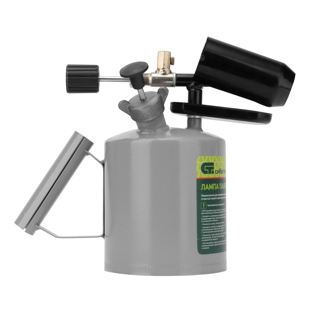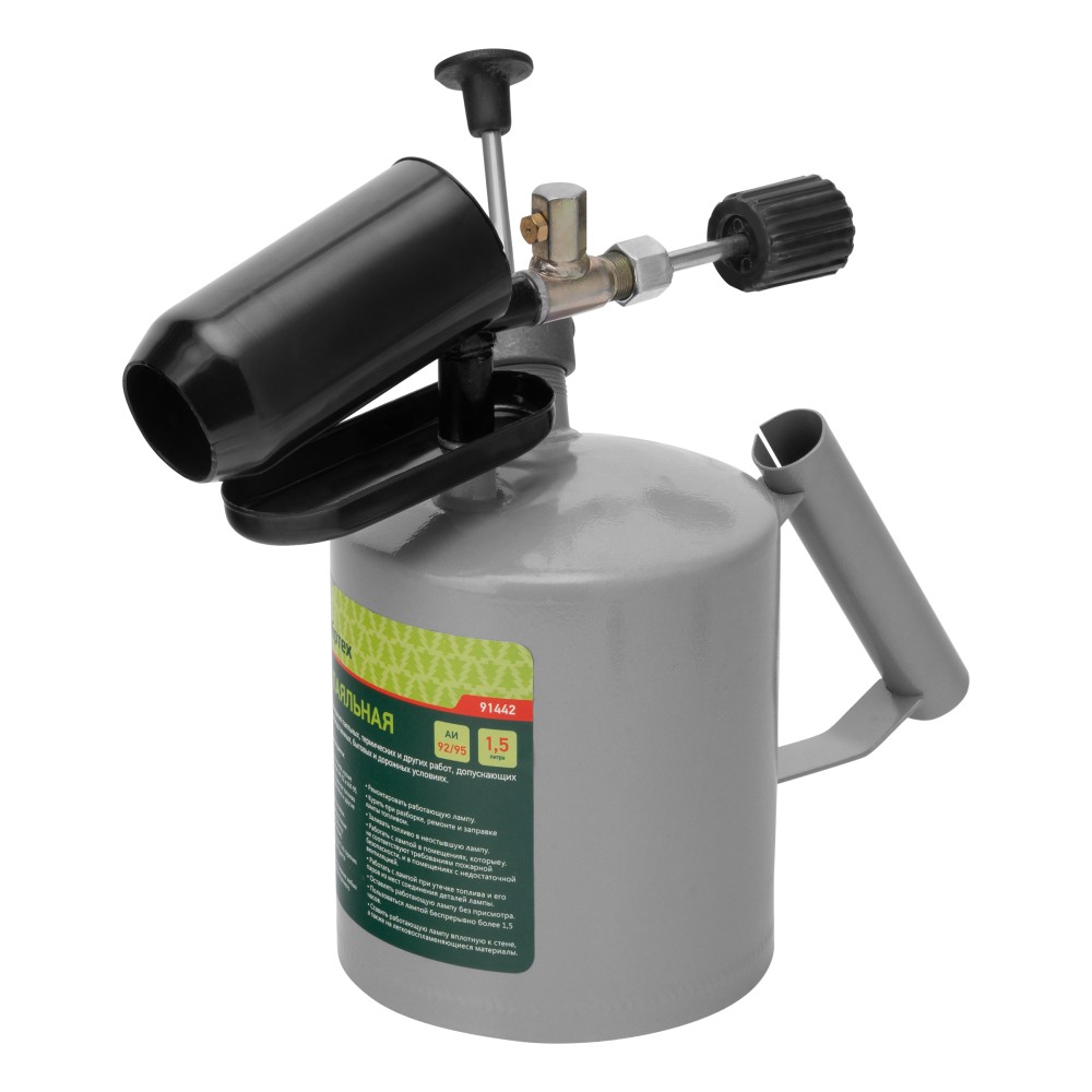 Паяльная лампа Сибртех 91442 с баком объемом 1,5 л используется для нагрева поверхностей. Применяется для выполнения монтажных и демонтажных работ, полезна также и для решения бытовых задач. Паяльной лампой можно разогревать жало паяльника и припой, варить медные трубы, нагревать заржавевшие или замерзшие соединения, снимать лакокрасочные покрытия, устанавливать термоусадочные трубки, а при наличии специальной подставки лампа поможет даже приготовить пищу. Она работает на любом бензине, кроме этилированного, а значит, проблем с заправкой не будет — достаточно заехать на АЗС.ПреимуществаДолговечность — корпус и рукоять изготовлены из прочной стали ST-12.Продуманная конструкция — емкость для нагрева сопла обеспечивает быстрый выход на рабочий режим и устойчивое пламя.Настройка уровня пламени — производитель предусмотрел винтовой регулятор.Экономичность — расход топлива составляет 1,2 л/ч, при максимальном заполнении бака лампа проработает почти 60 минут.