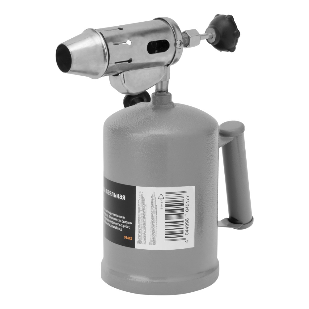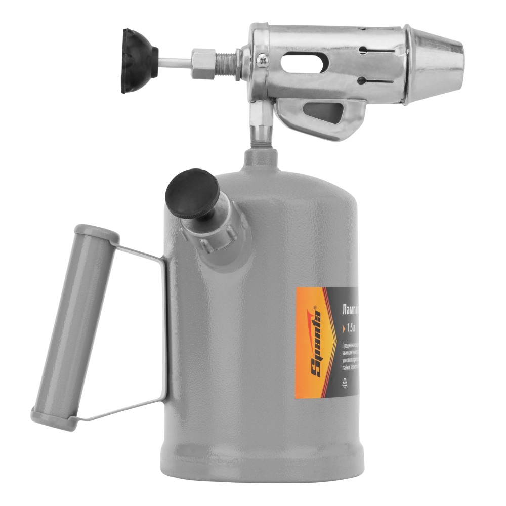 Паяльная лампа Sparta 91443 с объемом бака 1,5 л предназначена для получения направленного пламени. Используется для пайки деталей и труб, нагрева заржавевших или замерзших соединений, снятия лакокрасочных покрытий, монтажа термоусадки. Устройство также пригодится в походе или на даче — при наличии специальной подставки с его помощью можно готовить пищу. Максимальный расход топлива составляет 1,2 л/ч при предельной заполняемости бака 1,1 л.ПреимуществаНадежность и долговечность — корпус и рукоятка изготовлены из прочной стали ST-12.Настройка подачи топлива и интенсивности пламени — для этого предусмотрен регулировочный винт.Простой подбор топлива — лампа работает на любом бензине, кроме этилированного.