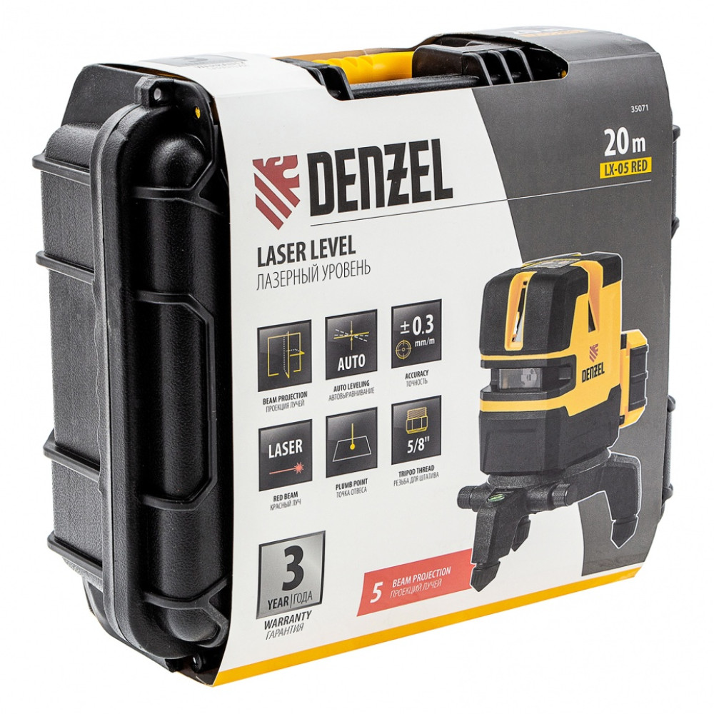 Лазерный уровень Denzel LX 05 Red 35071 предназначен для построения линий разметки на стенах, полу и потолке при проведении строительно-ремонтных работ. Благодаря длине волны лазера 635 Нм дальность проецирования уровня составляет 20 м. Уровень проецирует на поверхности точку отвеса, 4 вертикальных и 1 горизонтальную линию. Функция автоматического выравнивания имеет высокую точность ±0,3мм/м. Угол развертки прибора составляет 240 градусов.