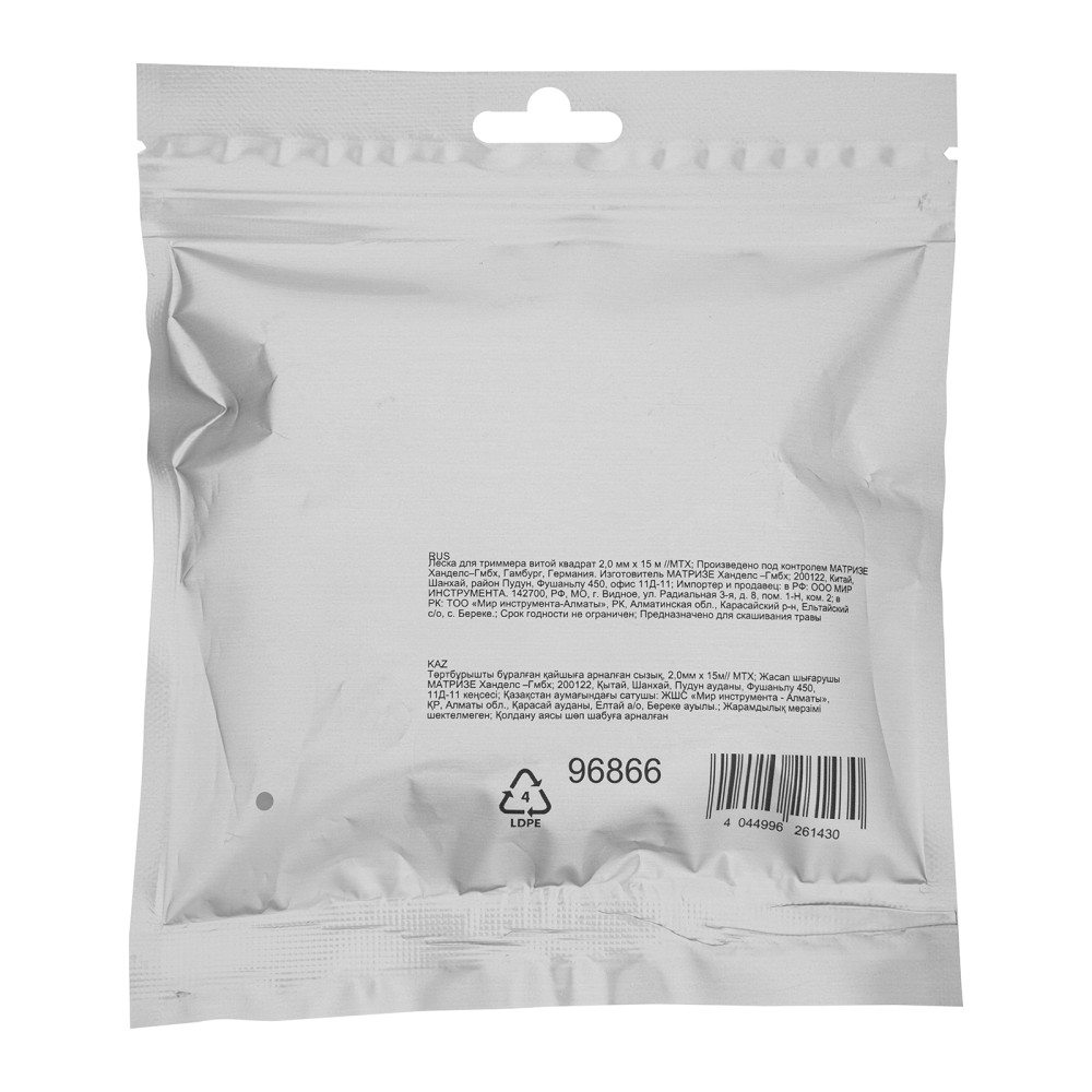 Леска для триммера MTX 96866 с сечением «витой квадрат», толщиной 2,0 мм и длиной 15 м, позволяет быстро и эффективно скашивать газонную, а также высокую и жесткую траву. Заправляется в катушку электрических триммеров мощностью 1000-1500 Вт. Пригодится для ухода за загородным участком.ПреимуществаДлительный срок службы — леска изготовлена из прочного полиамида PA6, устойчива к обрыву и медленно изнашивается.Высокая скорость скашивания — корд с острыми гранями производит агрессивный рез, позволяя быстро справиться с работой.Экономичность — леска поставляется в намотке 15 м, которой хватит надолго.