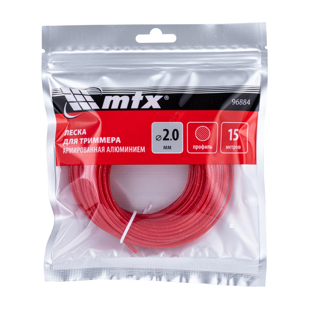 Леска для триммера MTX 96884 круглого сечения, диаметром 2,0 мм и длиной 15 м, армированная алюминием, эффективно срезает как молодую, газонную, так и высокую, жесткую траву. Совместно с электрическим триммером мощностью 1000-1500 Вт позволяет привести в порядок территорию загородного участка.ПреимуществаПовышенная износостойкость — леска изготовлена из полиамида, содержащего микрочастицы алюминия, что значительно увеличивает ее прочность и устойчивость к нагрузкам.Эффективная работа — корд с универсальным сечением «круг» аккуратно срезает газонную траву, имеет наиболее экономичный расход и практически не изнашивается.Длина 15 м — одной намотки хватит надолго.