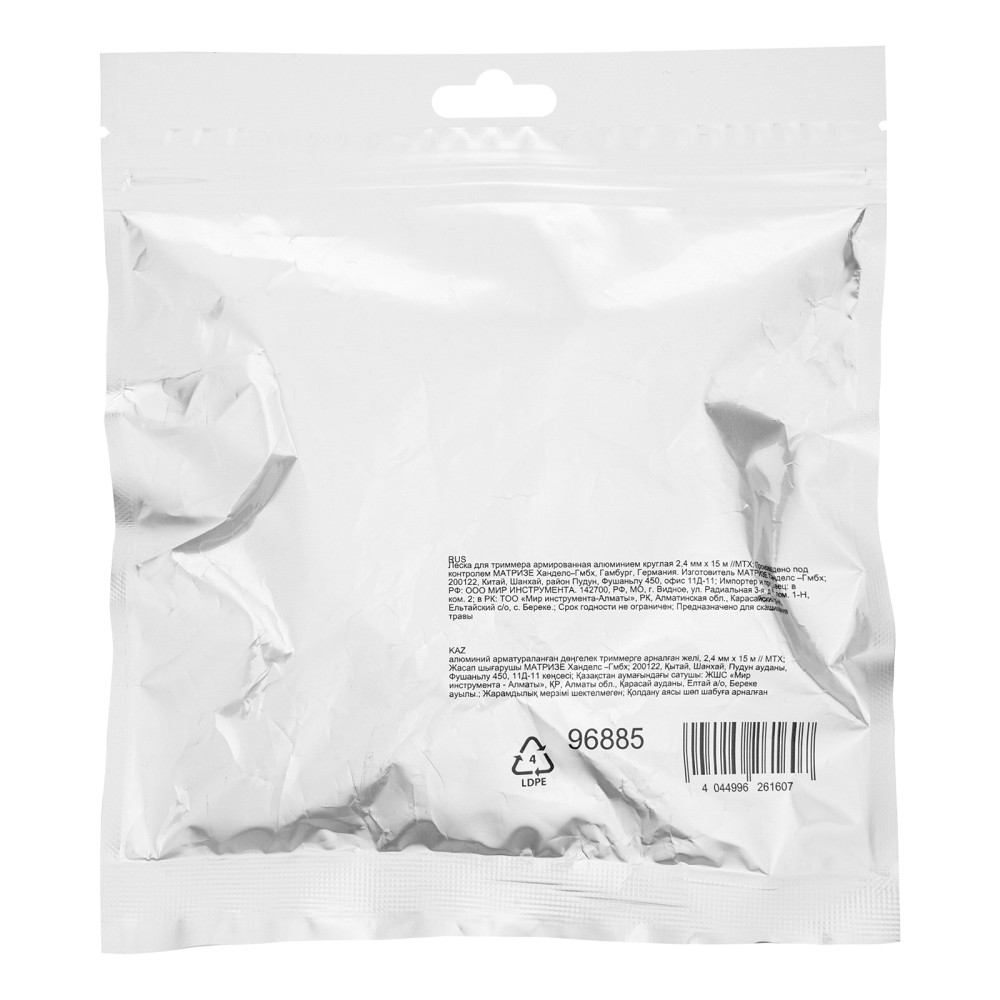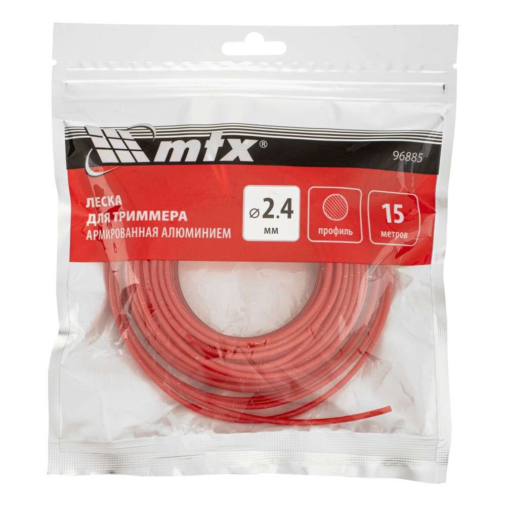 Леска для триммера MTX 96885 круглого сечения, диаметром 2,4 мм и длиной 15 м, армированная алюминием, эффективно срезает как молодую, газонную, так и высокую, жесткую траву. Совместно с бензиновым триммером позволяет привести в порядок загородный участок, придомовую территорию и т.д.ПреимуществаПовышенная износостойкость — леска изготовлена из полиамида, содержащего микрочастицы алюминия, что значительно увеличивает ее прочность и устойчивость к нагрузкам.Эффективная работа — корд с универсальным сечением «круг» аккуратно срезает газонную траву, имеет наиболее экономичный расход и практически не изнашивается.Длина 15 м — одной намотки хватит надолго.