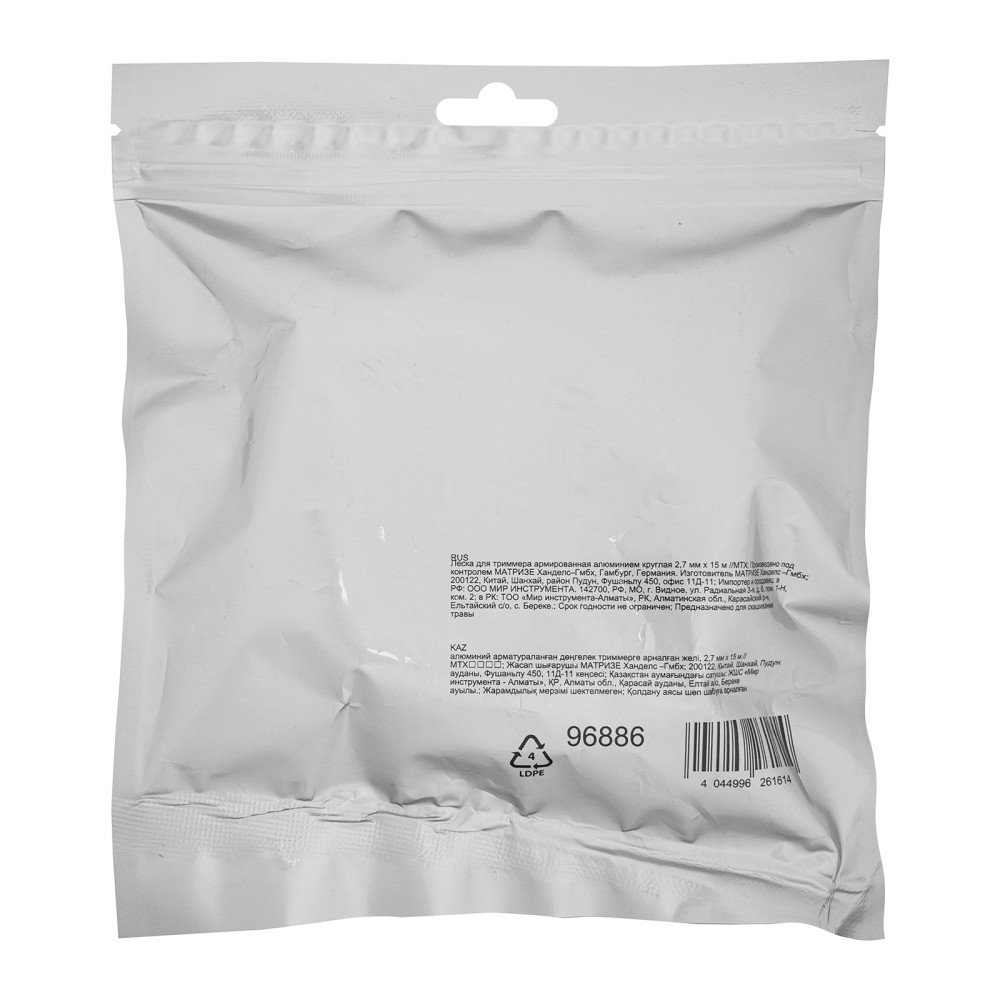 Леска для триммера MTX 96886 круглого сечения, диаметром 2,7 мм и длиной 15 м, армированная алюминием, эффективно срезает как газонную, так и высокую, жесткую или сухую траву. Справляется даже с молодыми побегами кустарников. Совместно с бензиновым триммером позволяет привести в порядок загородный участок, придомовую территорию и т.д.ПреимуществаПовышенная износостойкость — леска изготовлена из полиамида, содержащего микрочастицы алюминия, что значительно увеличивает ее прочность и устойчивость к нагрузкам.Эффективная работа — корд с универсальным сечением «круг» аккуратно срезает газонную траву, имеет наиболее экономичный расход и практически не изнашивается.Длина 15 м — одной намотки хватит надолго.