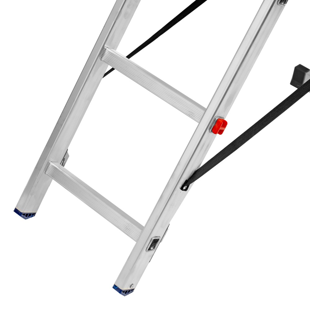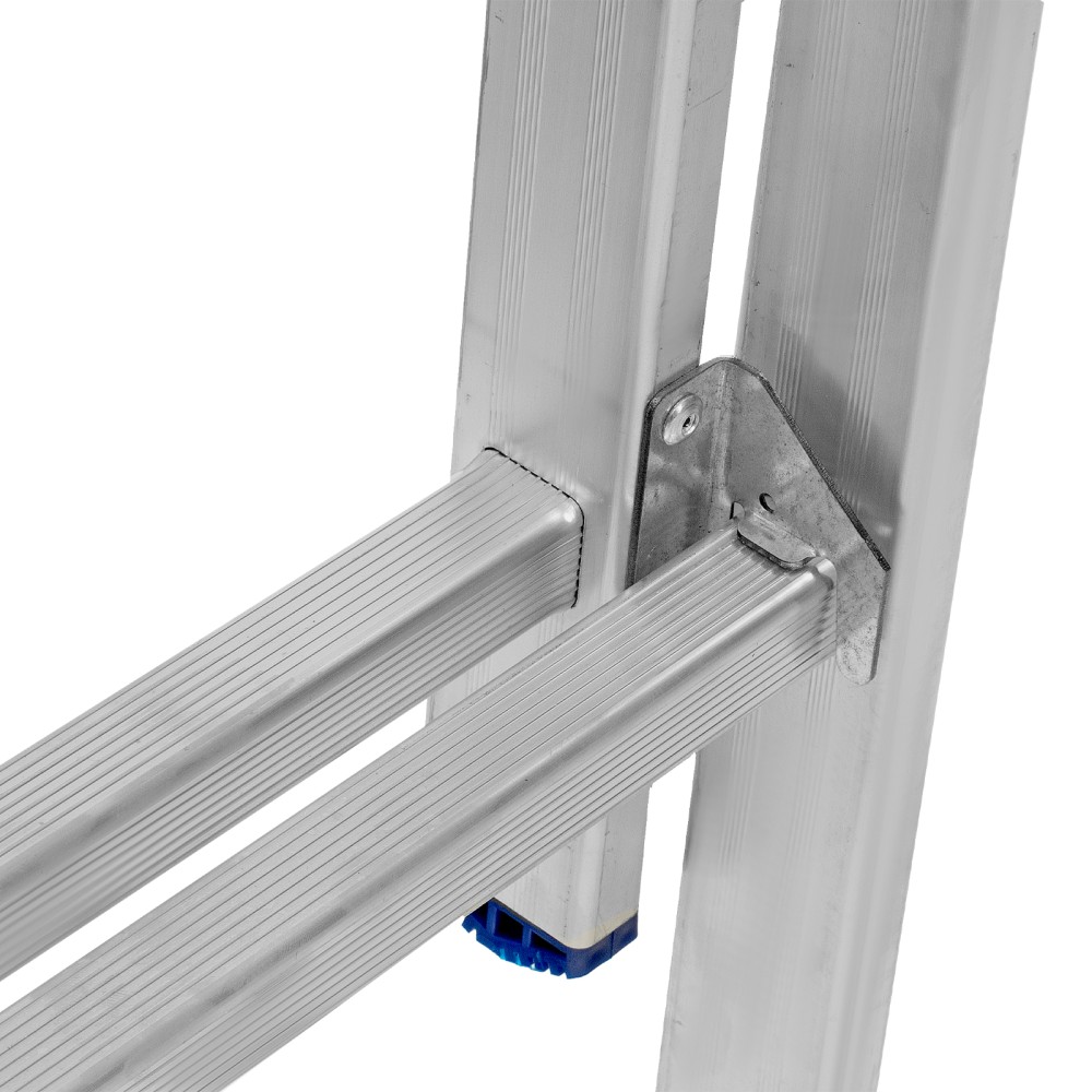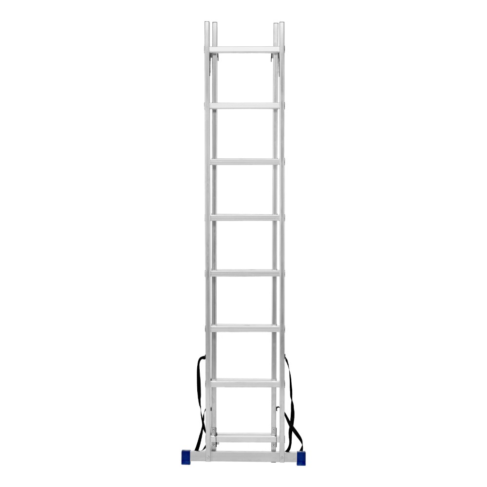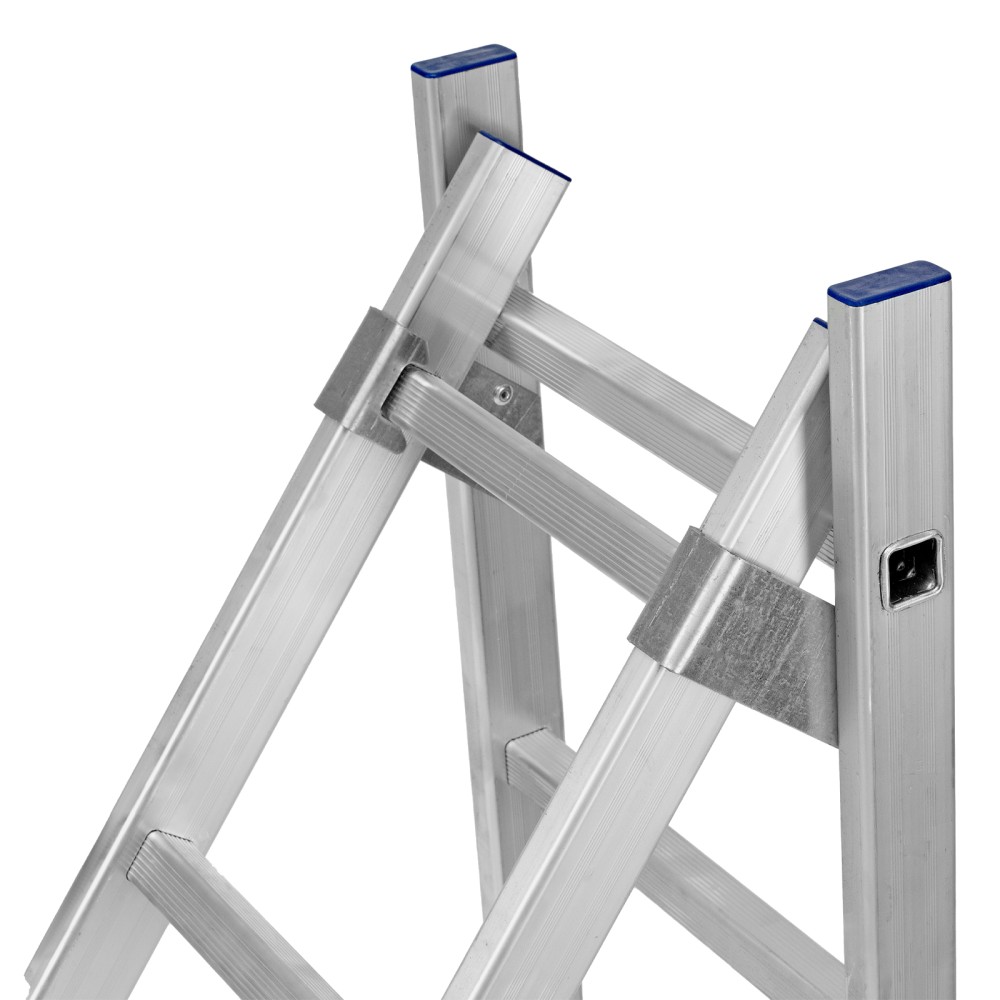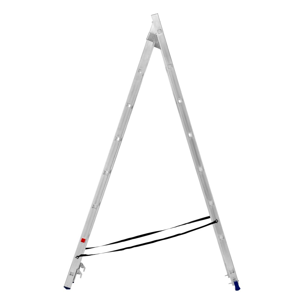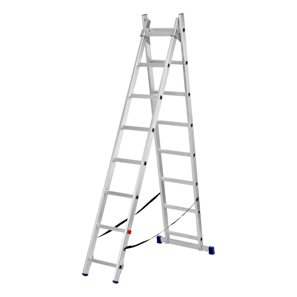 Алюминиевая двухсекционная лестница Сибртех 97908 состоит из х секций по 8 ступеней каждая. Легкая и прочная, она используется в качестве двухсторонней стремянки, предназначена для бытового и полупрофессионального применения.Преимущества3 рабочих положения — стремянка, двухсторонняя стремянка, приставная лестница с одной или двумя секциями.Надежность — рама, изготовленная из алюминиевого профиля прямоугольного сечения методом прессования, выдерживает нагрузку до 150 кг, страховочные стяжки увеличивают прочность конструкции.Устойчивость — благодаря съемному стабилизатору лестница ровно стоит на горизонтальной поверхности.Защита напольного покрытия — пластиковые заглушки на ножках предотвращают появление царапин.Безопасность пользователя — на профилированных ступенях имеется противоскользящее рифление, также предусмотрены ограничители безопасности по максимальной высоте.Простая и компактная конструкция — лестница быстро собирается и разбирается, не занимает много места при хранении и транспортировке.Внешний вид товара может незначительно отличаться от указанного на изображении, что не влечет изменения его качества.