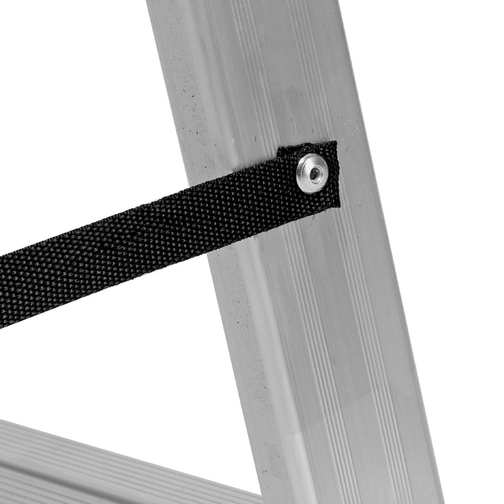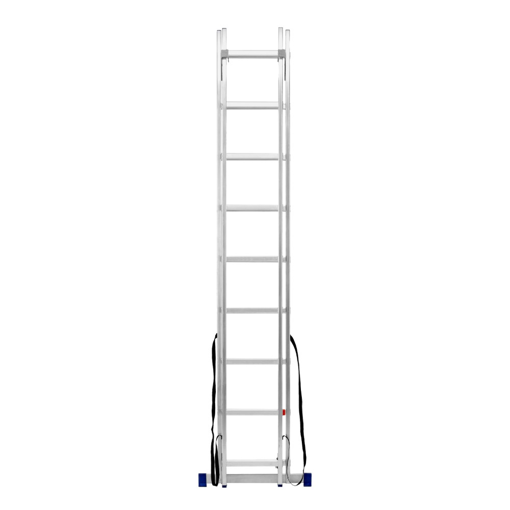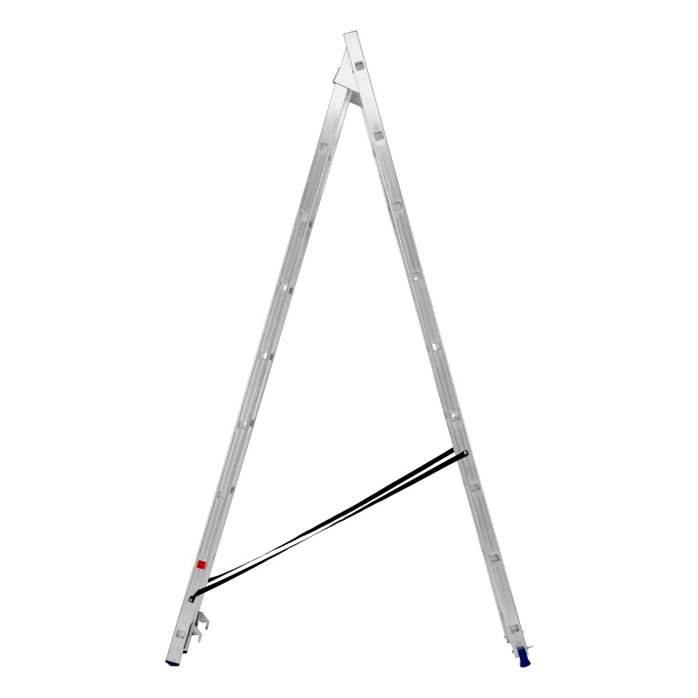 Алюминиевая двухсекционная лестница Сибртех 97909 состоит из 2 секций по 9 ступеней каждая. Легкая и прочная, она используется в качестве двухсторонней стремянки, предназначена для бытового и полупрофессионального применения.Преимущества3 рабочих положения — стремянка, двухсторонняя стремянка, приставная лестница с одной или двумя секциями.Надежность — рама, изготовленная из алюминиевого профиля прямоугольного сечения методом прессования, выдерживает нагрузку до 150 кг, страховочные стяжки увеличивают прочность конструкции.Устойчивость — благодаря съемному стабилизатору лестница ровно стоит на горизонтальной поверхности.Защита напольного покрытия — пластиковые заглушки на ножках предотвращают появление царапин.Безопасность пользователя — на профилированных ступенях имеется противоскользящее рифление, также предусмотрены ограничители безопасности по максимальной высоте.Простая и компактная конструкция — лестница быстро собирается и разбирается, не занимает много места при хранении и транспортировке.Внешний вид товара может незначительно отличаться от указанного на изображении, что не влечет изменения его качества.