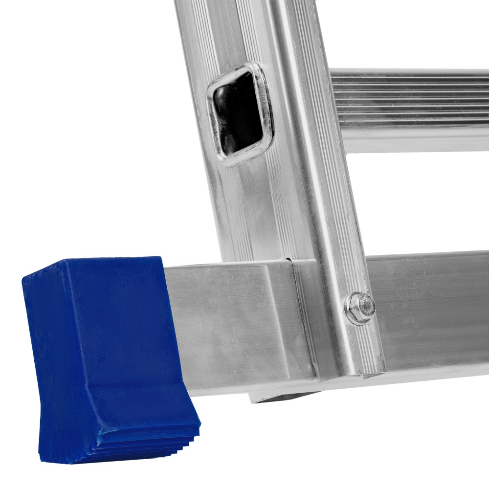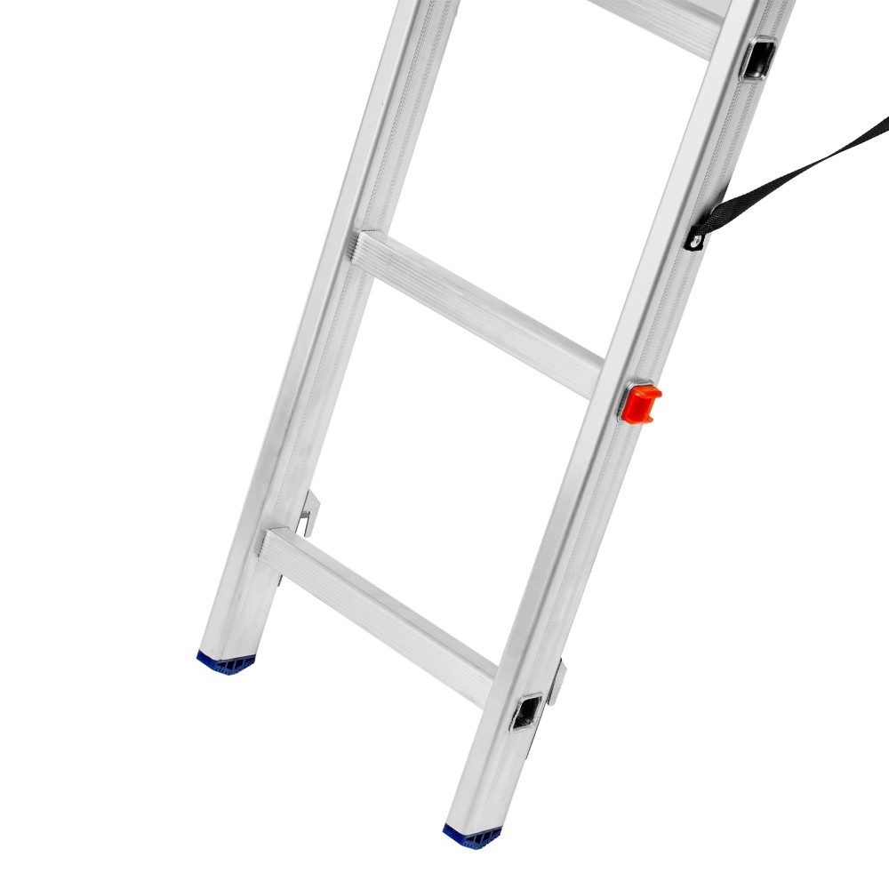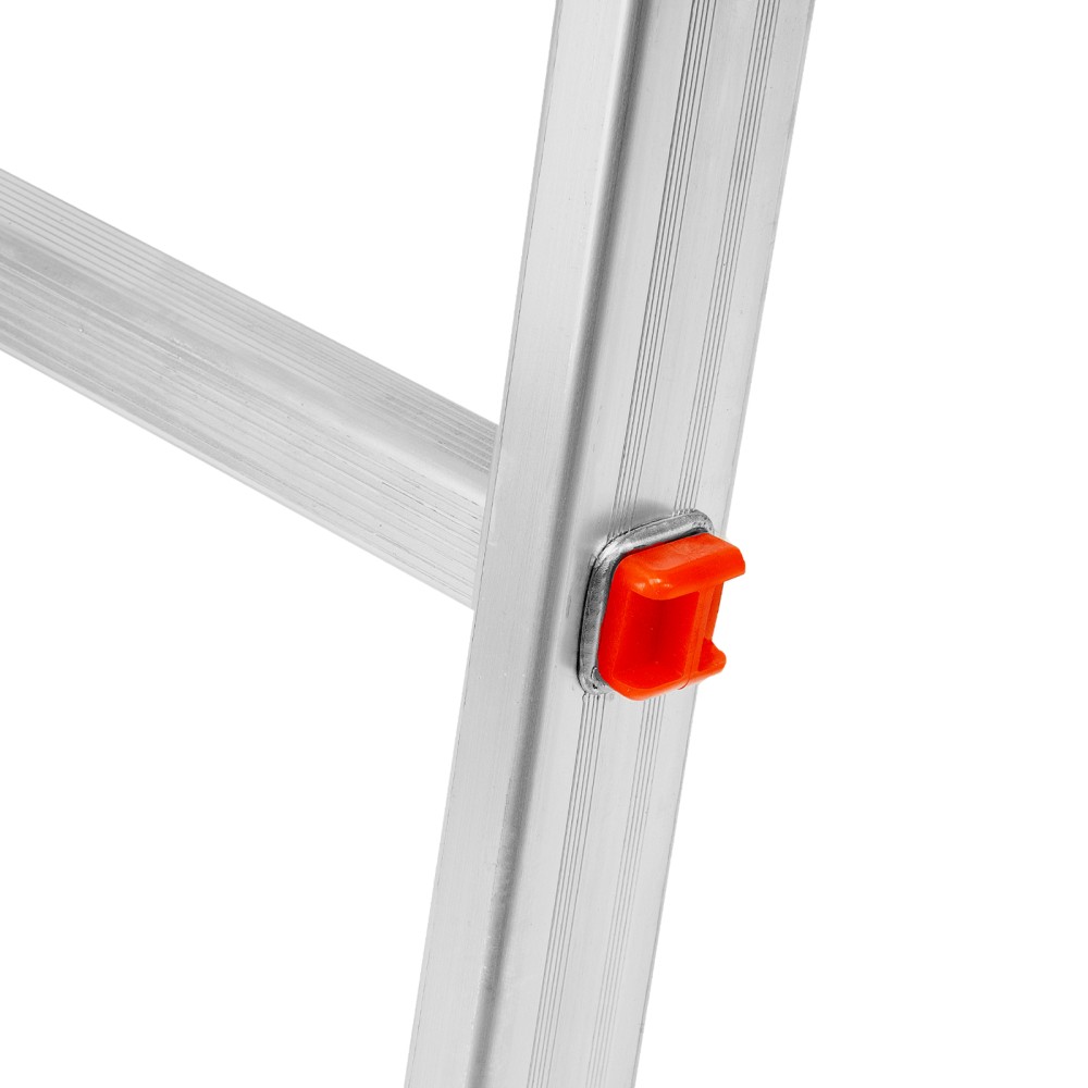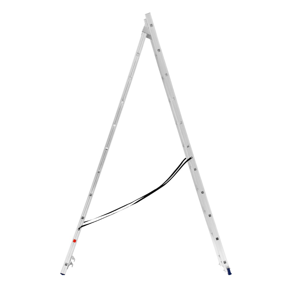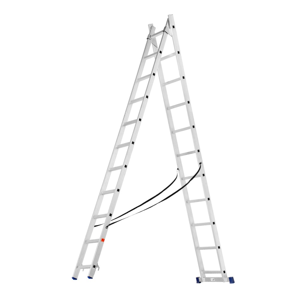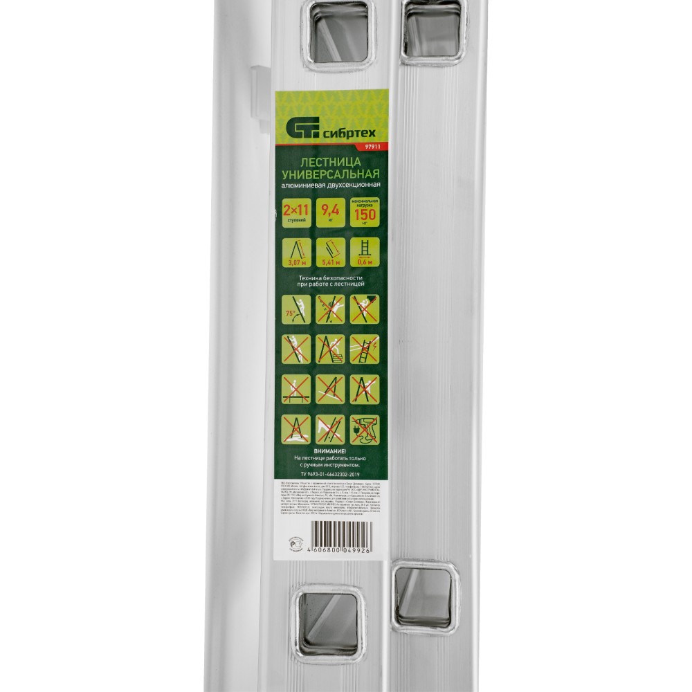 Алюминиевая двухсекционная лестница Сибртех 97911 состоит из 2 секций по 11 ступеней каждая. Легкая и прочная, она используется в качестве двухсторонней стремянки, предназначена для бытового и полупрофессионального применения.Преимущества3 рабочих положения — стремянка, двухсторонняя стремянка, приставная лестница с одной или двумя секциями.Надежность — рама, изготовленная из алюминиевого профиля прямоугольного сечения методом прессования, выдерживает нагрузку до 150 кг, страховочные стяжки увеличивают прочность конструкции.Устойчивость — благодаря съемному стабилизатору лестница ровно стоит на горизонтальной поверхности.Защита напольного покрытия — пластиковые заглушки на ножках предотвращают появление царапин.Безопасность пользователя — на профилированных ступенях имеется противоскользящее рифление, также предусмотрены ограничители безопасности по максимальной высоте.Простая и компактная конструкция — лестница быстро собирается и разбирается, не занимает много места при хранении и транспортировке.Внешний вид товара может незначительно отличаться от указанного на изображении, что не влечет изменения его качества.