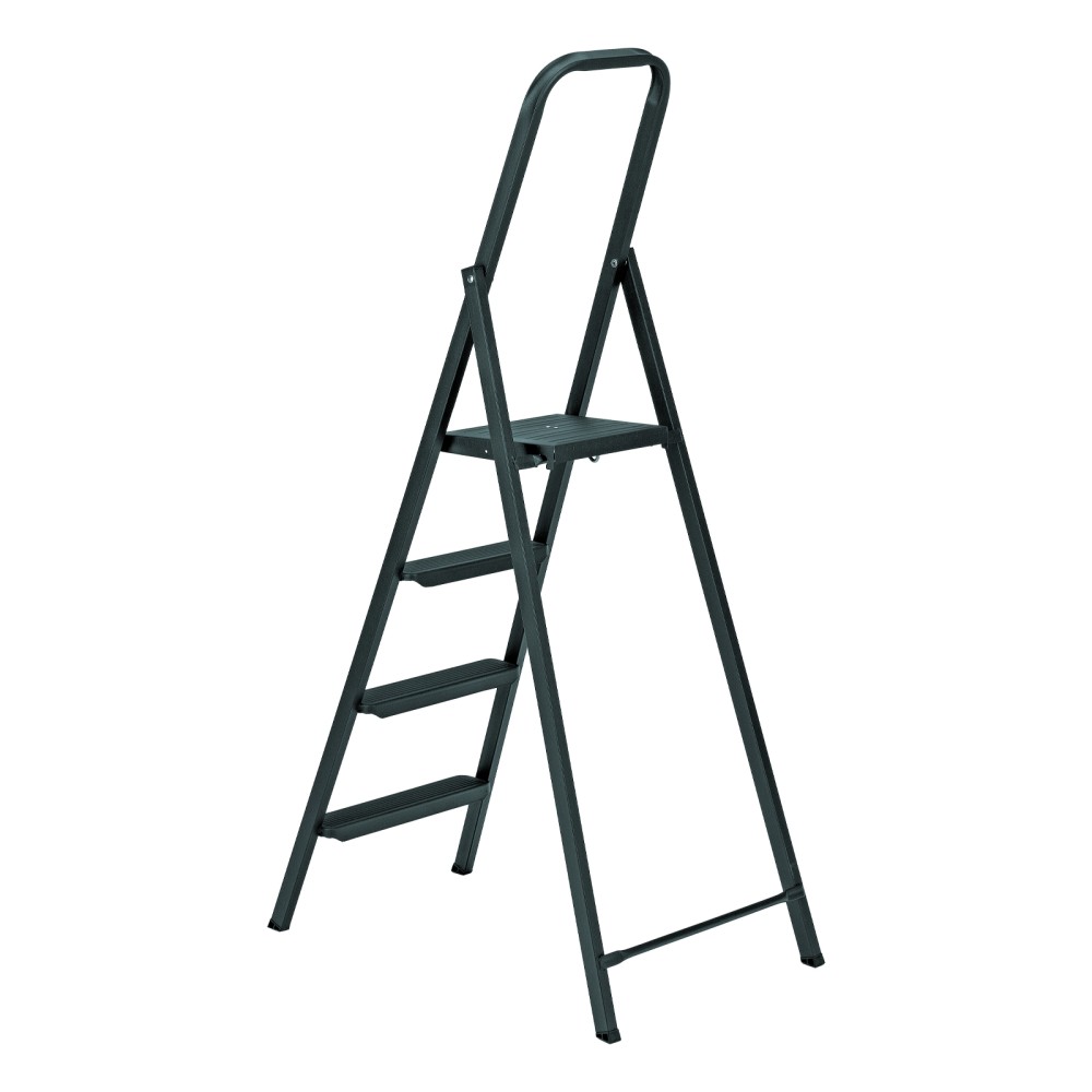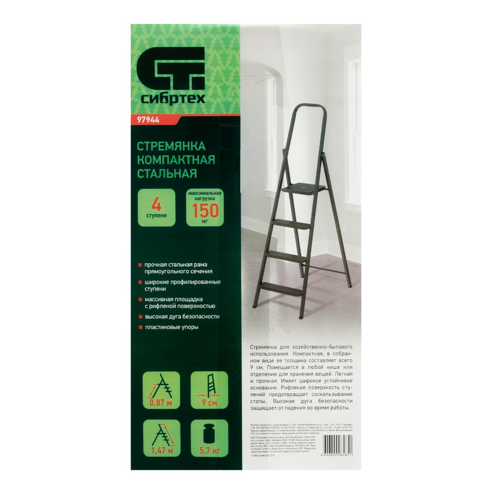 Стремянка компактная стальная Сибртех 97944 с 4 ступенями служит для проведения работ на высоте, превышающей человеческий рост. Стальные профилированные рама и ступени рассчитаны на нагрузку до 150 кг. Площадка находится на высоте 87 см от опорной поверхности, рабочая высота стремянки составляет 287 см (при среднем росте пользователя 170 см). Использовать стремянку можно дома, на даче или в гараже, а также во время строительства и ремонта.Поверхность для установки стремянки должна быть ровной, использование электроинструмента во время работы не допускается.ПреимуществаДолговечность — антрацитовое покрытие порошковой эмалью защищает стремянку от коррозии.Надежная фиксация в рабочем положении — на верхней площадке имеются специальные зацепы.Безопасный подъем и спуск — рифление на поверхности ступеней обеспечивает хорошее сцепление с подошвами обуви.Отсутствие царапин на напольном покрытии — на ножках имеются пластиковые накладки.Комфортная работа — стремянка имеет широкие ступени и высокую дугу безопасности.Удобное хранение и транспортировка — стремянка весит 5,8 кг, ее размеры в сложенном состоянии составляют 1575 х 445 х 87 мм.