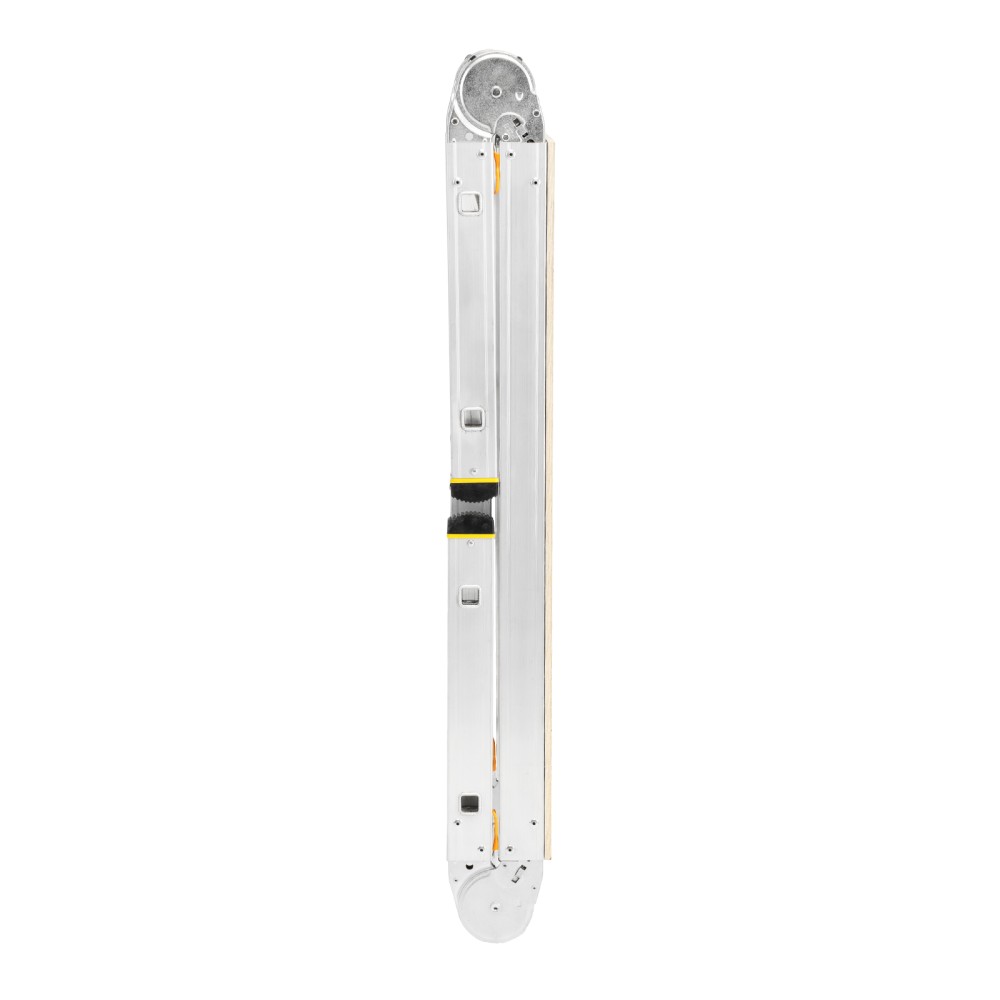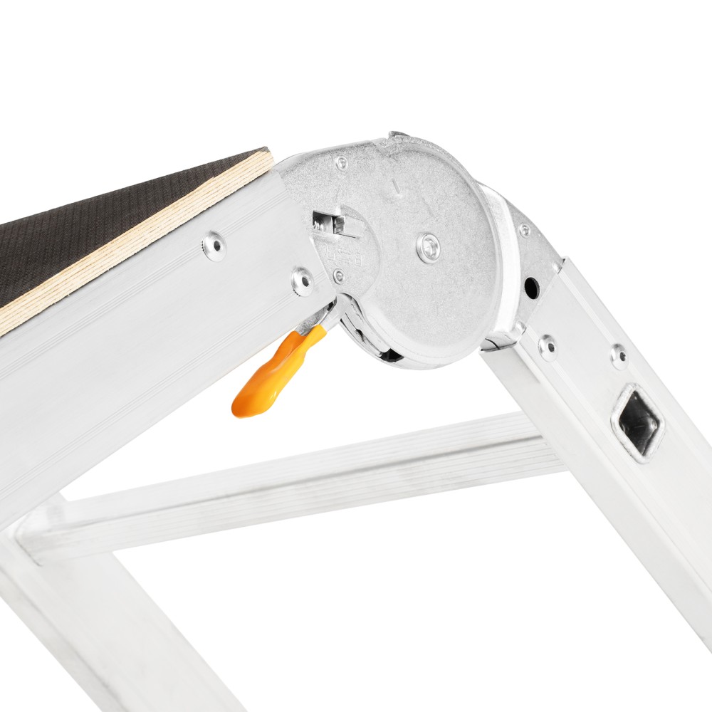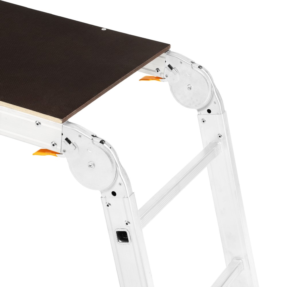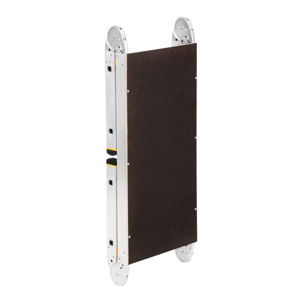 Рабочие подмости 97961, количество ступеней 2 х 4 х 2, используют для размещения инструментов и материалов, а также для работы на высоте. Рассчитаны на нагрузку до 150 кг, используются во время строительства и ремонта.ПреимуществаНадежность — стойки и ступени изготовлены из прессованного алюминиевого профиля, рабочая площадка из антисептированной фанеры устойчива к воздействию микроорганизмов и насекомых.Увеличенная прочность — стойки усилены в местах наибольшей нагрузки, многократная развальцовка обеспечивает надежное соединение ступеней со стойками.Простая установка — подмости быстро устанавливаются и складываются, шарнирные замки легко регулируются и автоматически фиксируются.Безопасность — ступени имеют антискользящую рифленую поверхность, а благодаря пластиковым накладкам на стойках подмости не скользят во время работы.Удобное хранение и транспортировка — габариты в сложенном состоянии составляют 1,16 х 0,15 х 0,48 м.