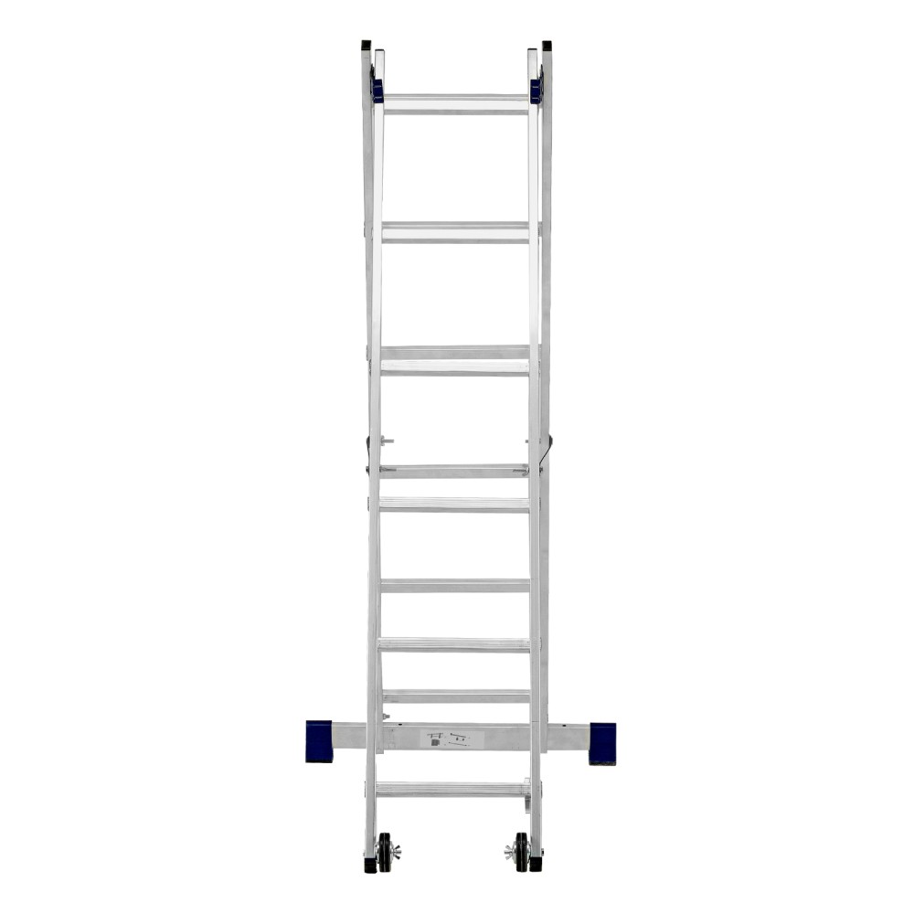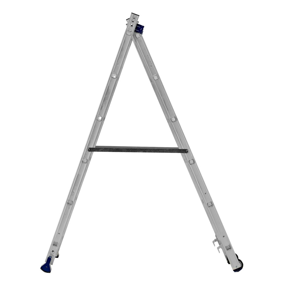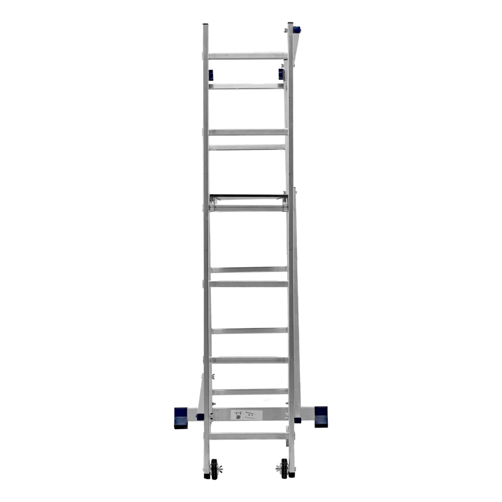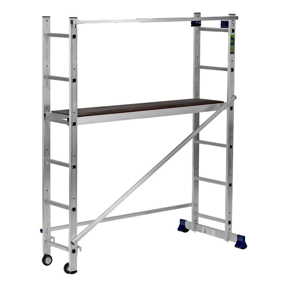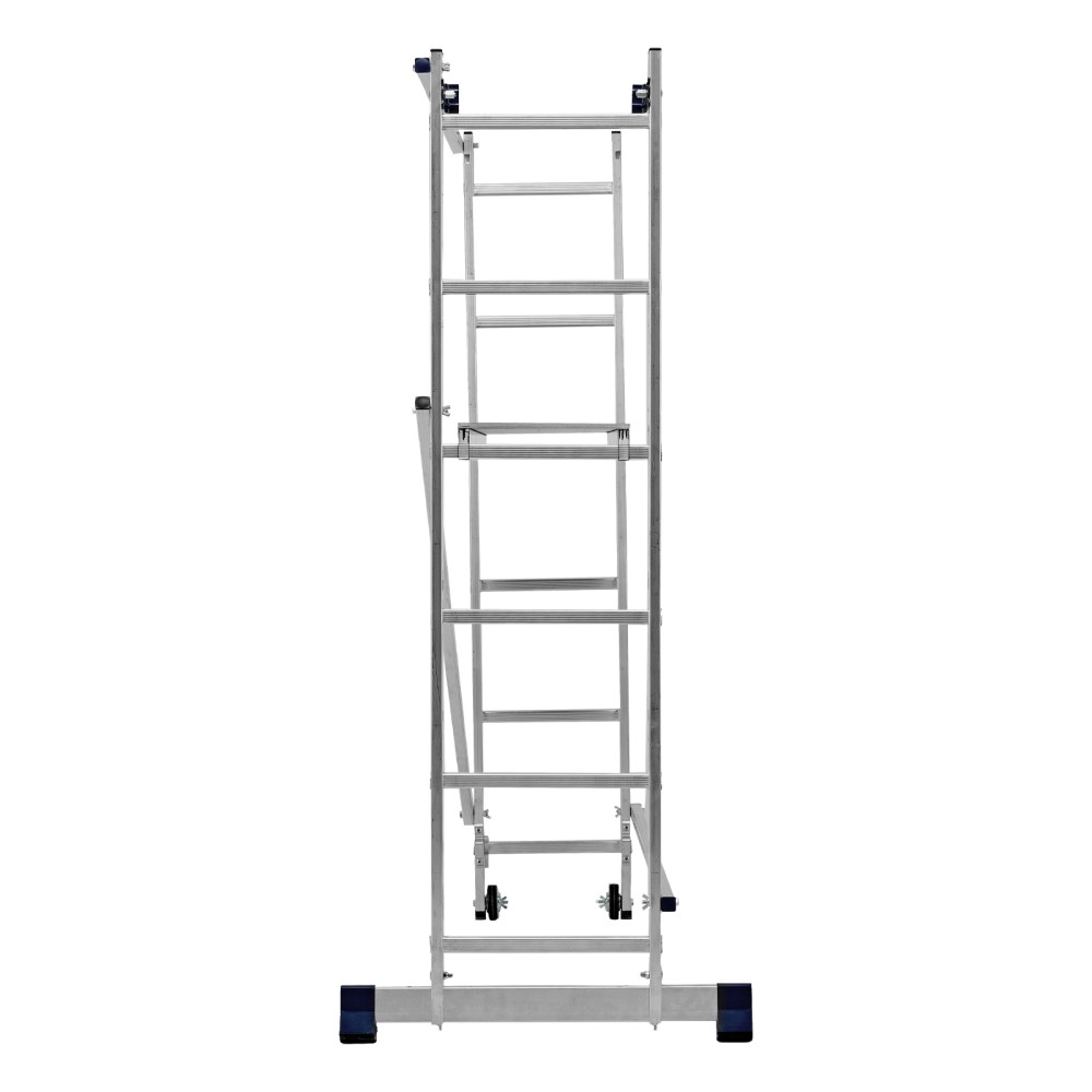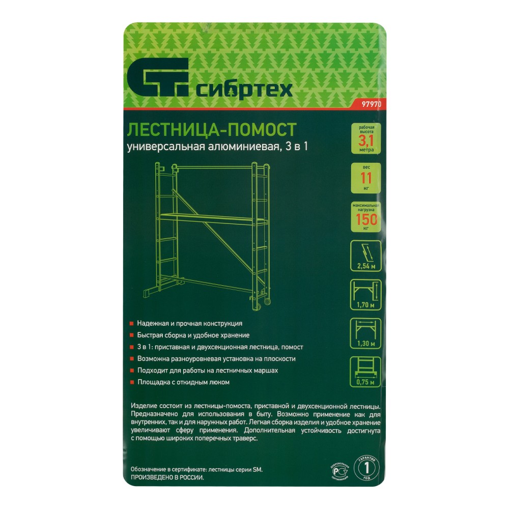 Лестница-помост 3 в 1 97970 необходима для проведения малярных и штукатурных работ на высоте нескольких метров. Площадка выдерживает нагрузку 150 кг, поэтому на ней может расположиться мастер с необходимыми инструментами. Помост трансформируется в двустороннюю стремянку и раздвижную приставную лестницу, что расширяет возможности его использования.ПреимуществаПрочность и долговечность — лестница изготовлена из алюминиевого профиля.Устойчивость — благодаря поперечным траверсам подмости стоят ровно.Надежная конструкция — ступеньки прочно соединены с опорами за счет многократной развальцовки, выдвижная секция крепко удерживается алюминиевыми кронштейнами.Удобная работа на лестничных пролетах — площадку можно устанавливать на разных уровнях опор.Безопасность пользователя — рифленая поверхность ступенек препятствует скольжению, благодаря пластиковым заглушкам лестница не скользит, а о края опор нельзя пораниться или повредить одежду.Удобная транспортировка — лестницу-помост легко перемещать благодаря небольшому весу 11,6 кг и двум колесам.Компактность — в сложенном виде лестница занимает мало места.