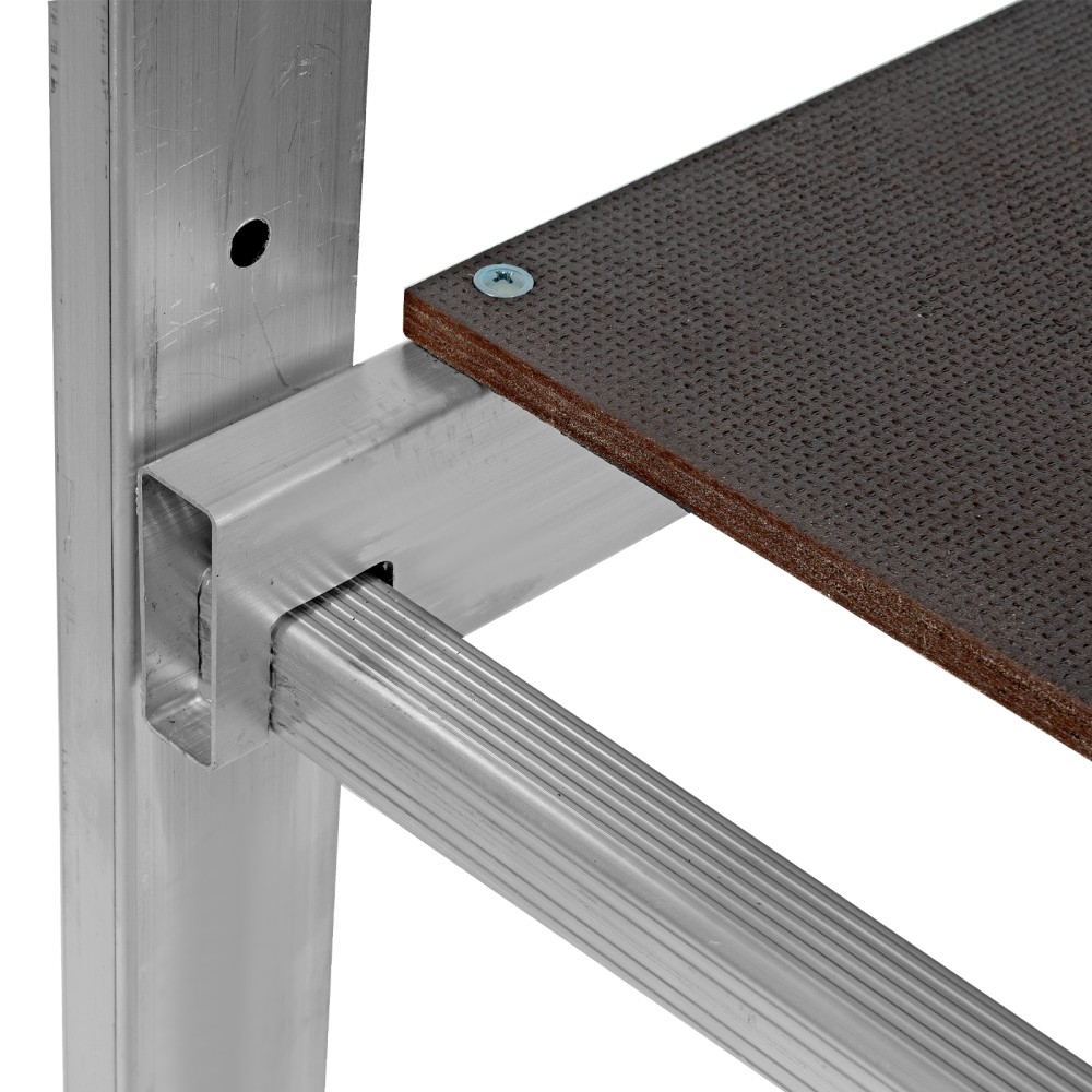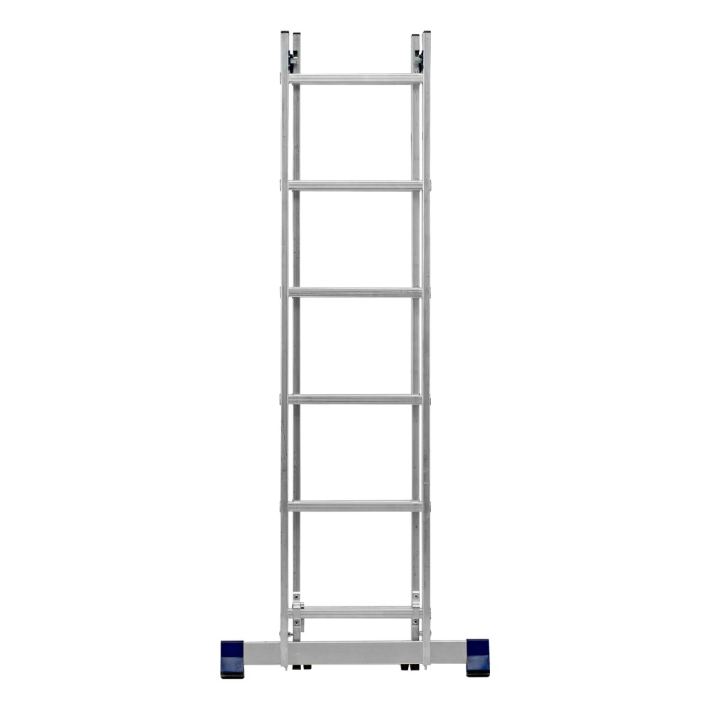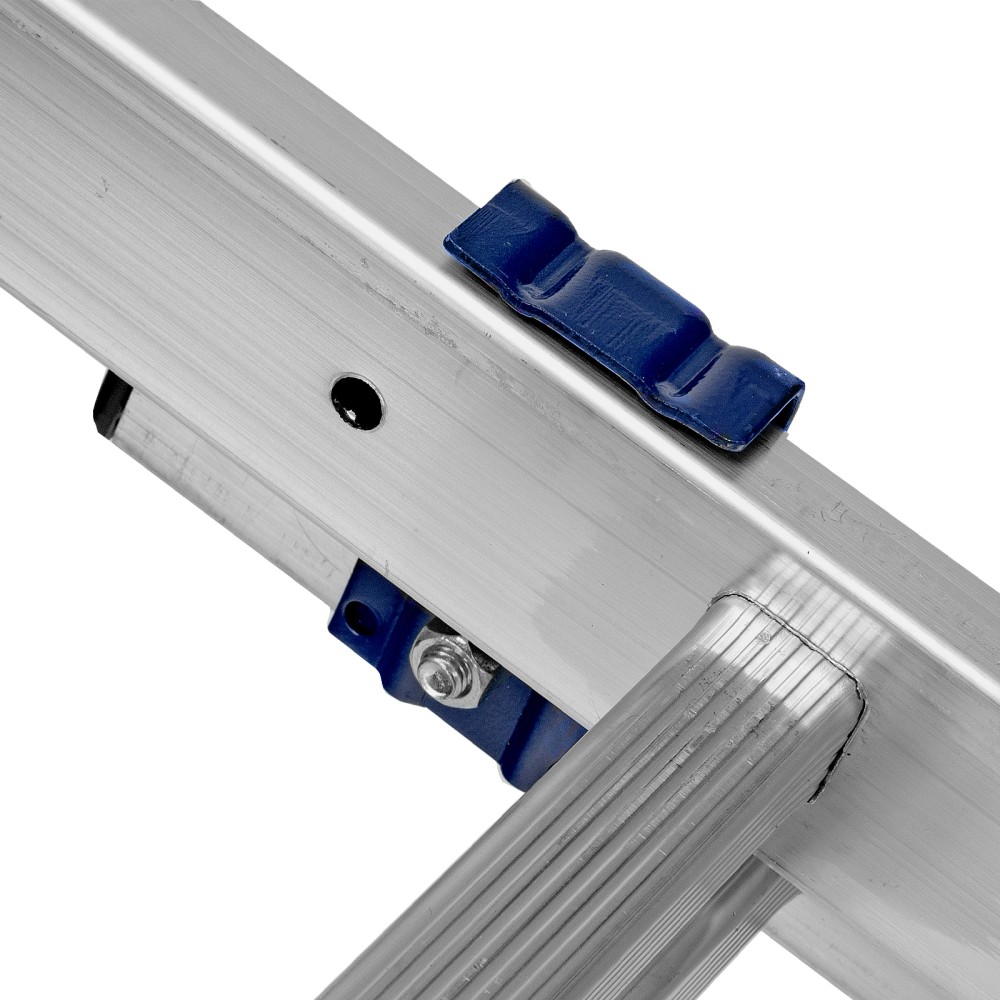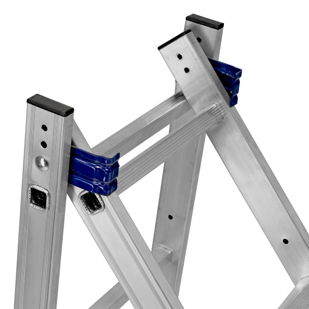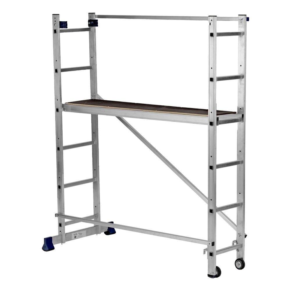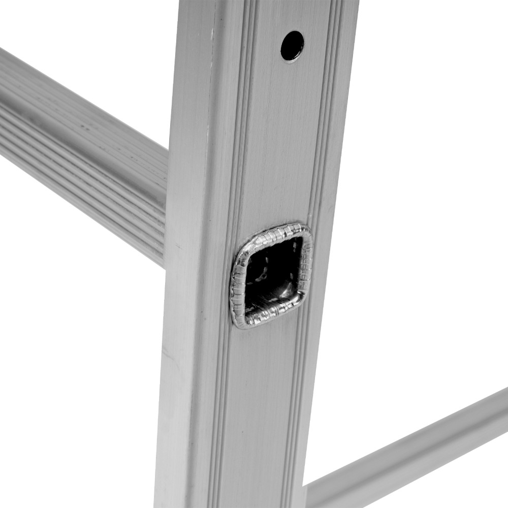 Лестница-помост 3 в 1 97970 необходима для проведения малярных и штукатурных работ на высоте нескольких метров. Площадка выдерживает нагрузку 150 кг, поэтому на ней может расположиться мастер с необходимыми инструментами. Помост трансформируется в двустороннюю стремянку и раздвижную приставную лестницу, что расширяет возможности его использования.ПреимуществаПрочность и долговечность — лестница изготовлена из алюминиевого профиля.Устойчивость — благодаря поперечным траверсам подмости стоят ровно.Надежная конструкция — ступеньки прочно соединены с опорами за счет многократной развальцовки, выдвижная секция крепко удерживается алюминиевыми кронштейнами.Удобная работа на лестничных пролетах — площадку можно устанавливать на разных уровнях опор.Безопасность пользователя — рифленая поверхность ступенек препятствует скольжению, благодаря пластиковым заглушкам лестница не скользит, а о края опор нельзя пораниться или повредить одежду.Удобная транспортировка — лестницу-помост легко перемещать благодаря небольшому весу 11,6 кг и двум колесам.Компактность — в сложенном виде лестница занимает мало места.