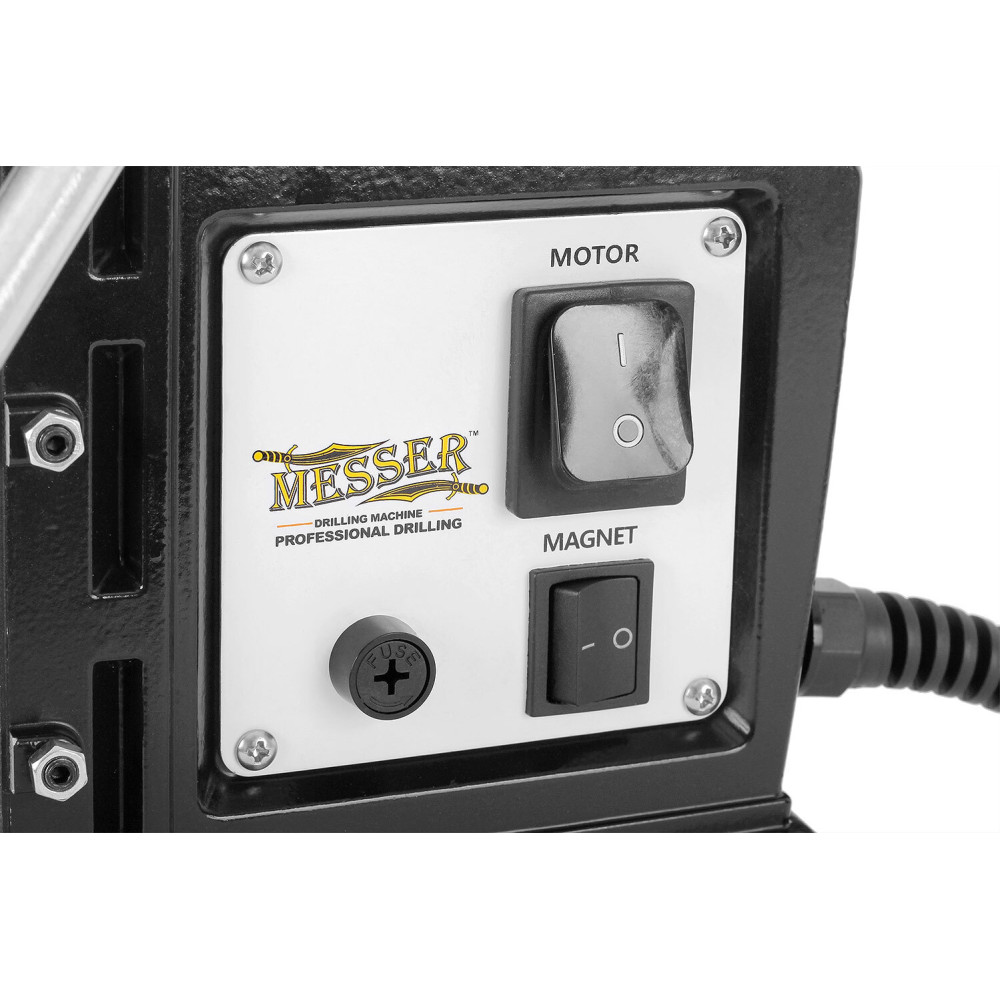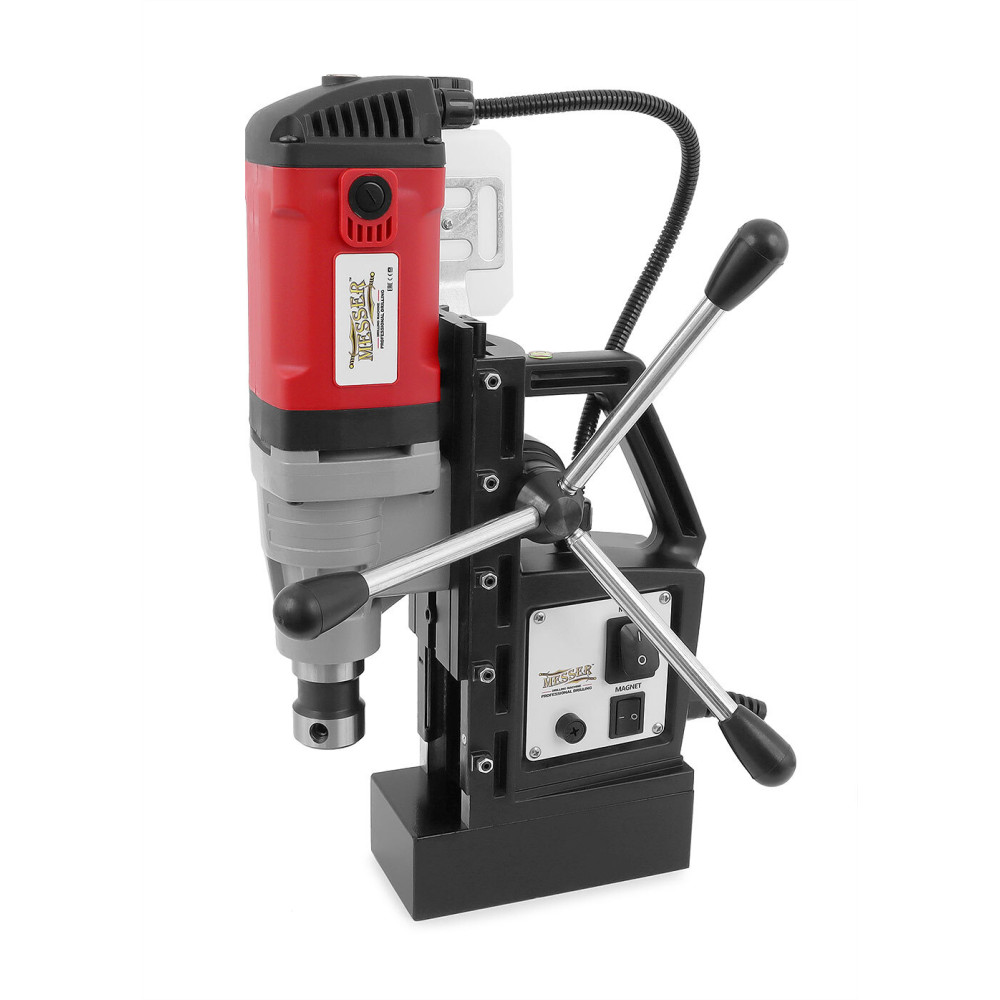 Сверлильный станок на магнитном основании MESSER MDMR-50 1650Вт, 570 об/мин, 15500N, D50xL55, 11-01-057 предназначен для сверления больших отверстий в толстом листовом металле и в различных металлоконструкциях на горизонтальных, вертикальных и иных направлениях.
