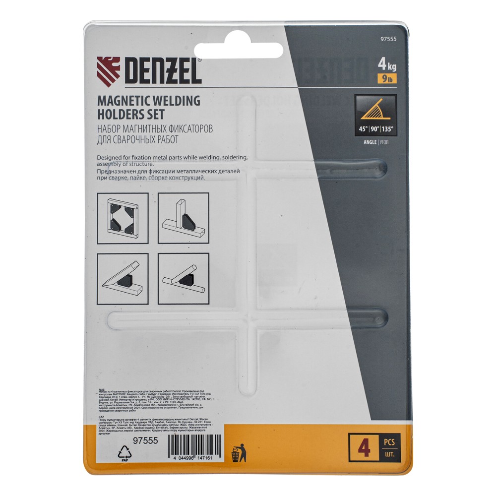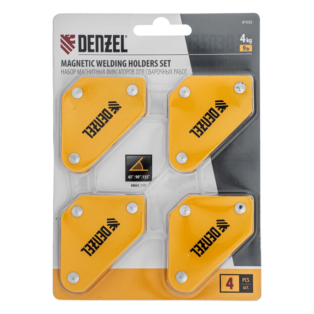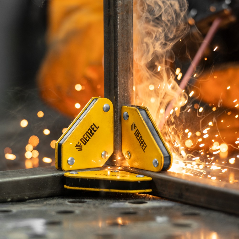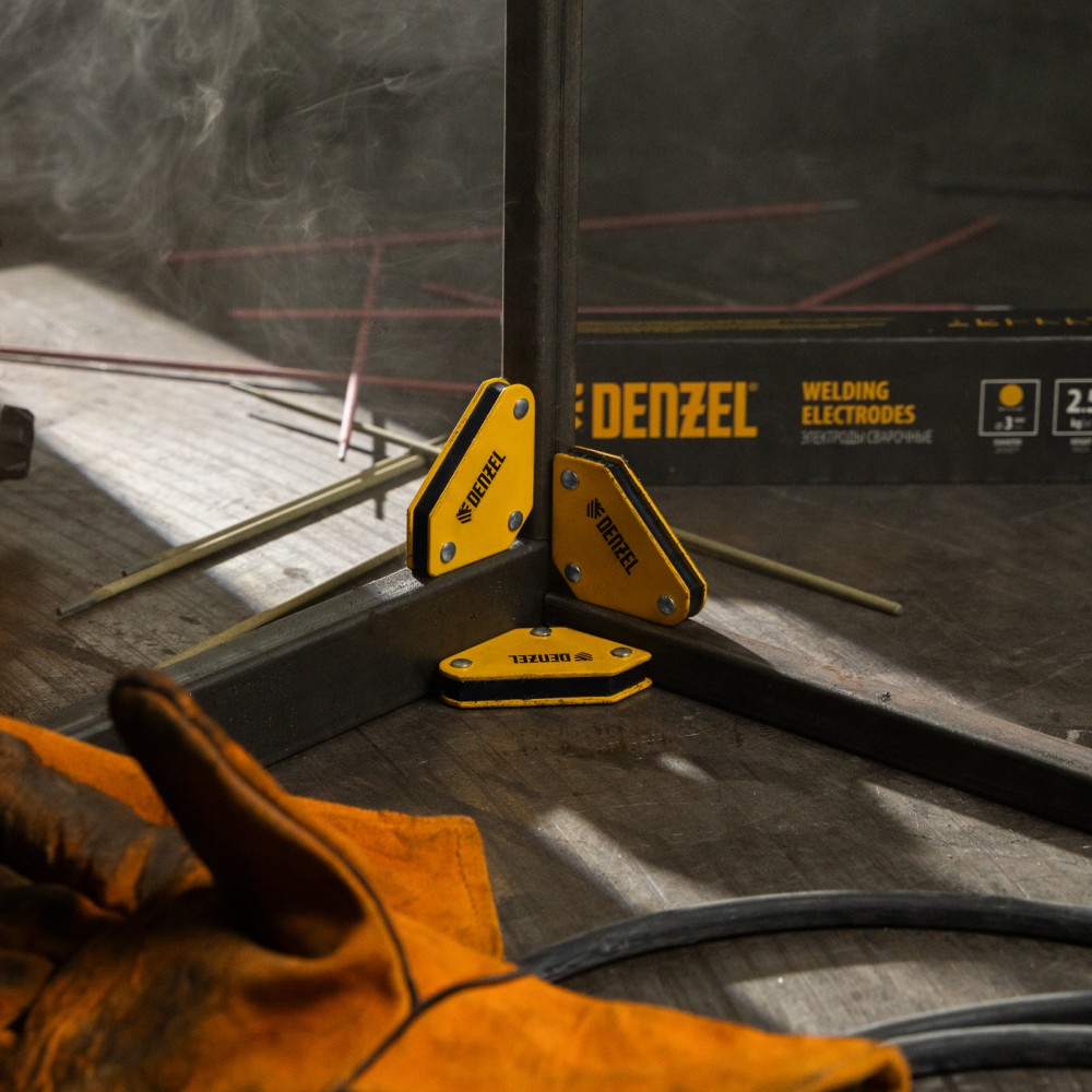 Набор из 4 магнитных фиксаторов для сварочных работ Denzel 97555 идеально подходит для выстраивания небольших металлических конструкций. Уголки обеспечивают надежную фиксацию деталей весом до 4 кг при выполнении сварочных и паяльных работ, поэтому работать можно в одиночку без чьей-либо помощи. При одновременном использовании всех фиксаторов из набора можно выстроить сразу 4 точных угла конструкции.ПреимуществаУниверсальность — каждый магнит может применяться по отдельности и выставлять детали под углом 45, 90 или 135 градусов.Прочность и долговечность — даже при падении корпус и стенки магнитов не деформируются, что обеспечивает высокую эффективность работы.Компактность — благодаря небольшим размерам 55 х 60 х 12 мм набор идеально подходит для фиксации маленьких деталей и работ, требующих высокой точности и аккуратности.Легкое обслуживание — для поддержания чистоты достаточно смахивать щеткой сварочный налет с фиксаторов после работы.