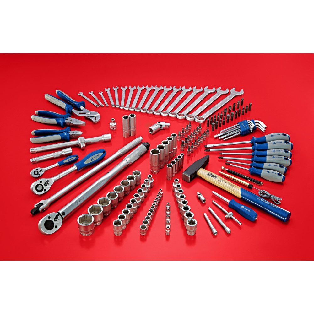 Материалы – сталь Cr-V, сталь SNCM+V (S2), конструкционная сталь, хром, пластик PP, PP+TPR (рукояти), дерево (рукоять молотка)