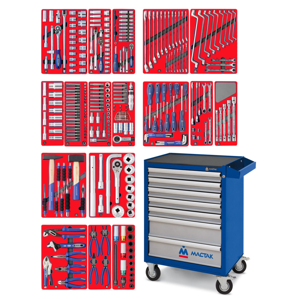 Материалы – инструментальные стали Cr-V, Cr-Mo, SNCM+V (S2), конструкционная сталь, хром, пластики PP, вспененный PVC, PP+TPR (рукояти отверток, трещоток, шарнирно-губцевого инструмента), дерево (рукоять молотка), EVA (ложементы)