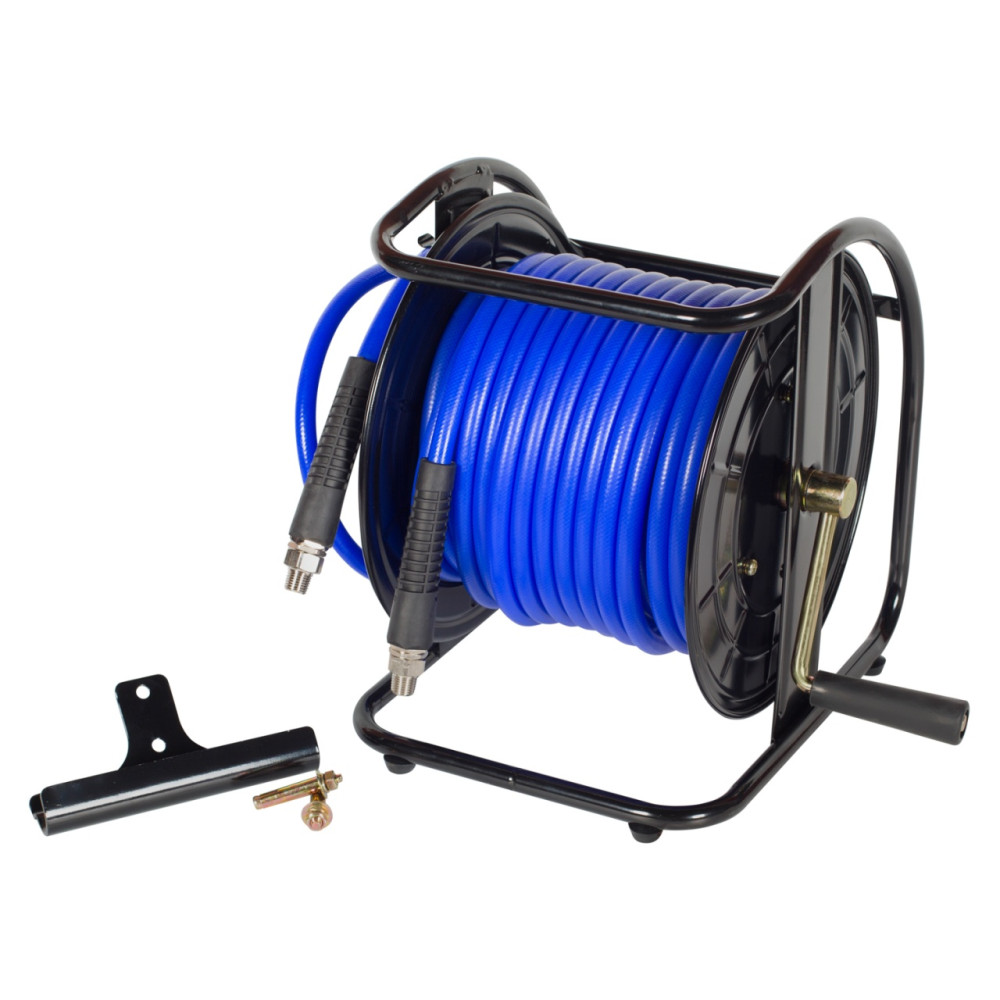 Шланг размещён на катушке, расположенной на специальной раме. Конструкция позволяет разместить шланг на рабочем месте так, как вам удобно, а по окончании работы свернуть шланг и перенести раму с катушкой на место хранения.