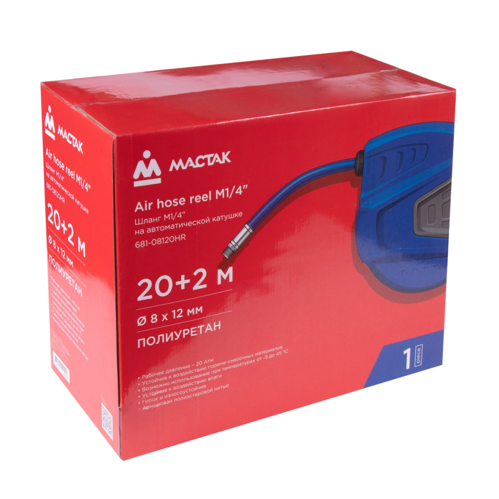 МАСТАК Шланг пневматический 8х12 мм, 20 м, на автоматической катушке, полиуретановый, резьба 1/4"