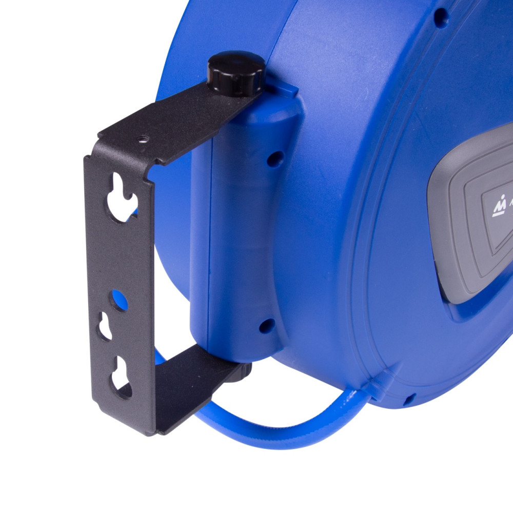 Шланг размещён на автоматической катушке закрытого типа. Конструкция автоматической катушки позволит установить шланг на рабочем месте так, как вам удобно, закрепив его посредством кронштейна на стене, верстаке или другом любом неподвижном предмете, фиксатор пружинного механизма катушки позволит зафиксировать шланг на необходимой длине, а по окончании работы поможет свернуть шланг обратно.